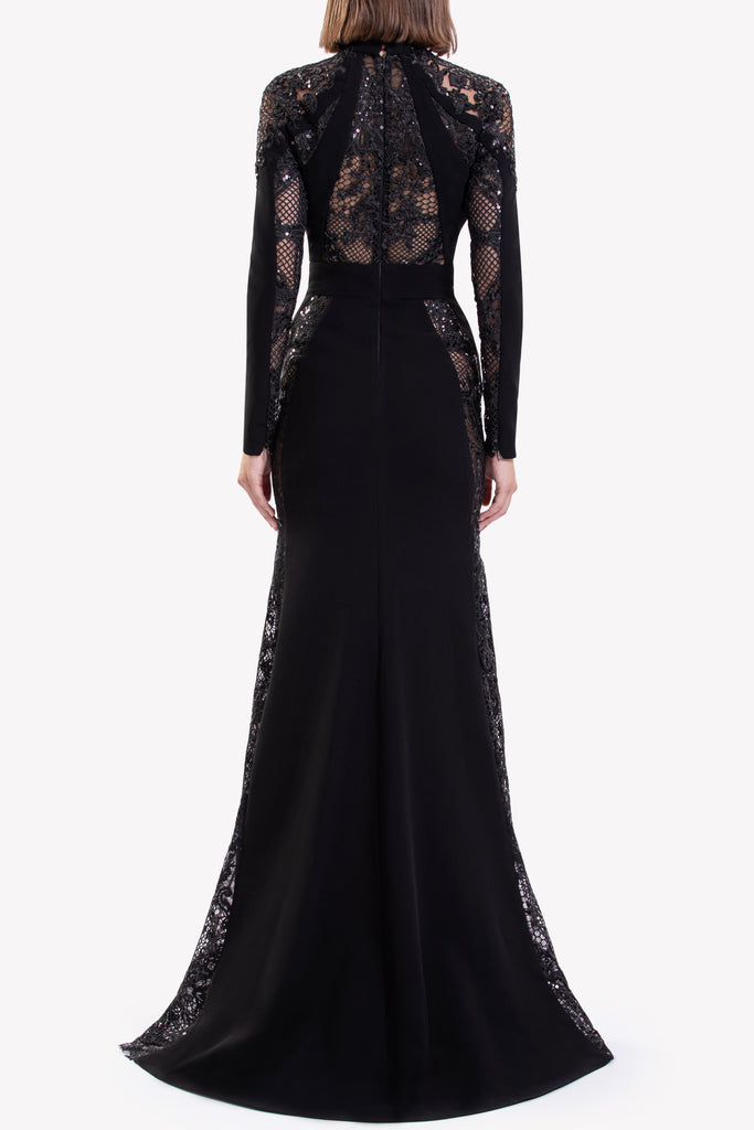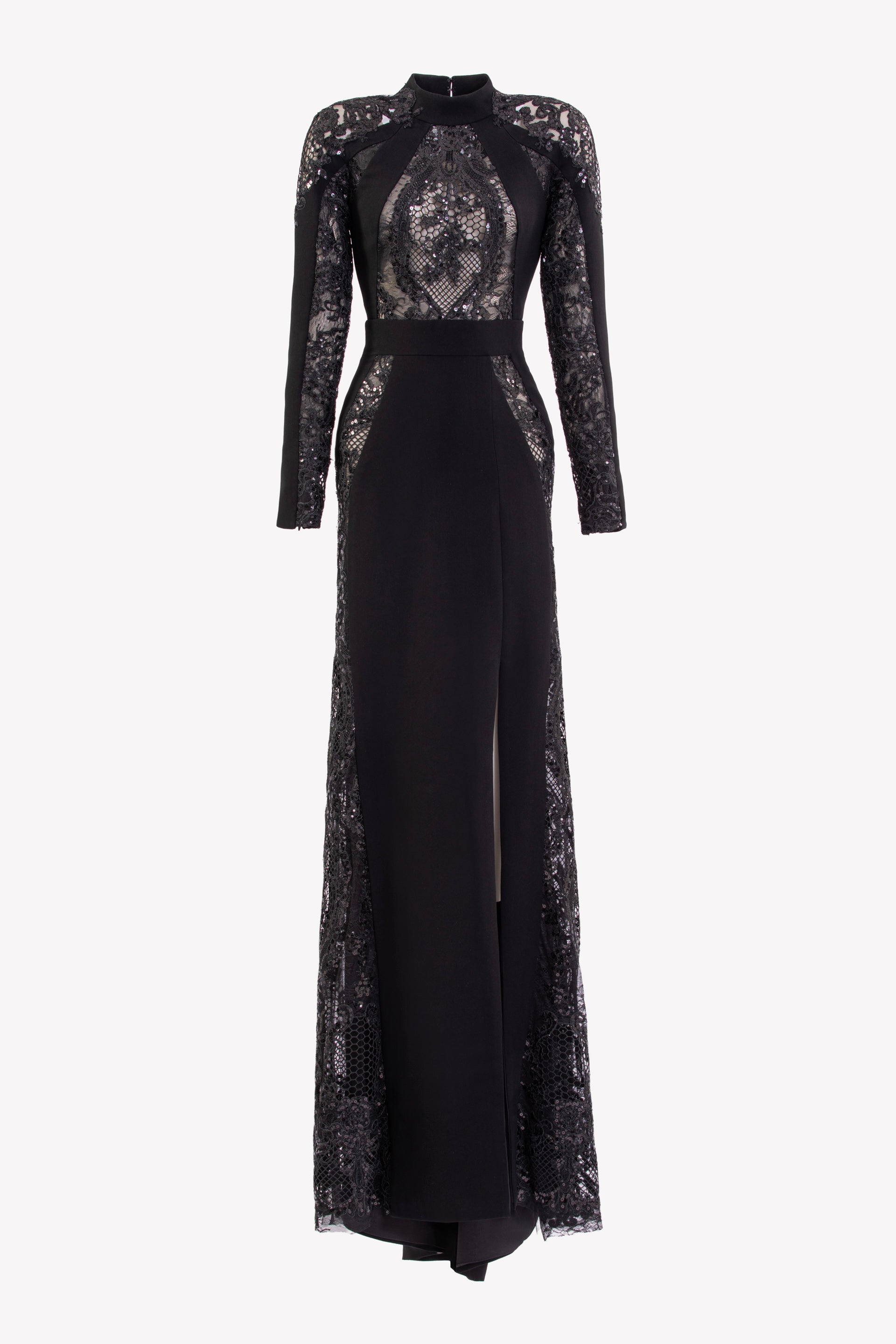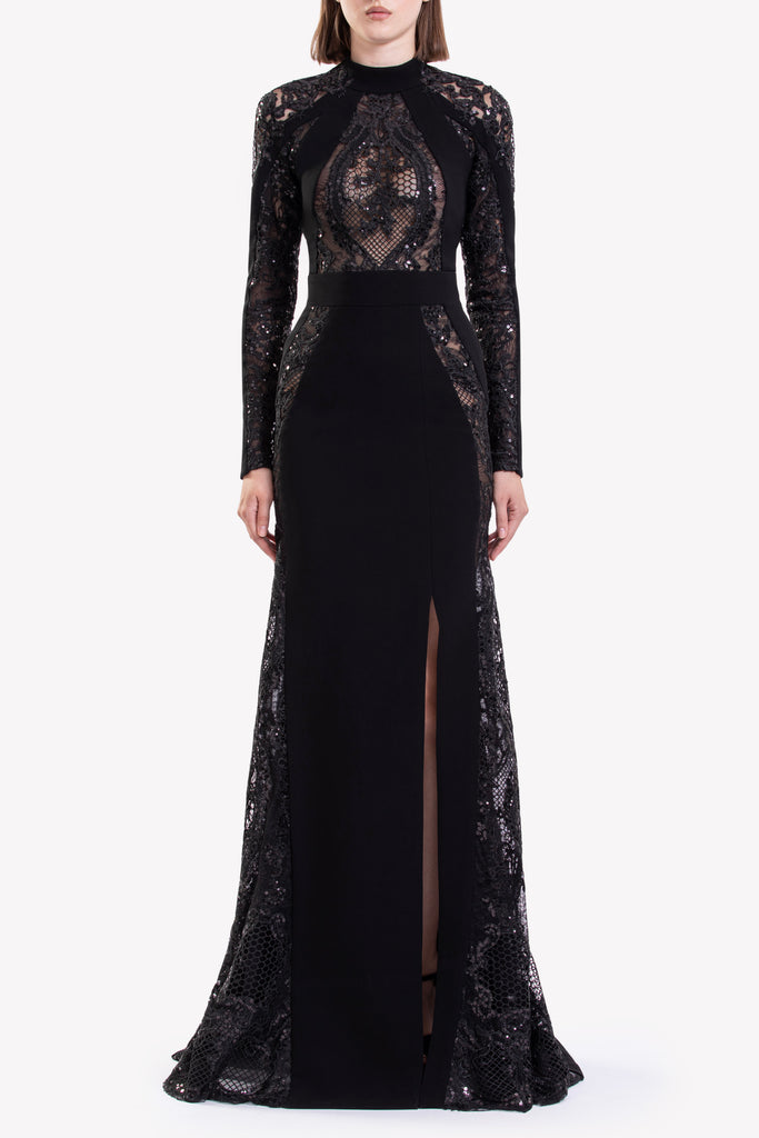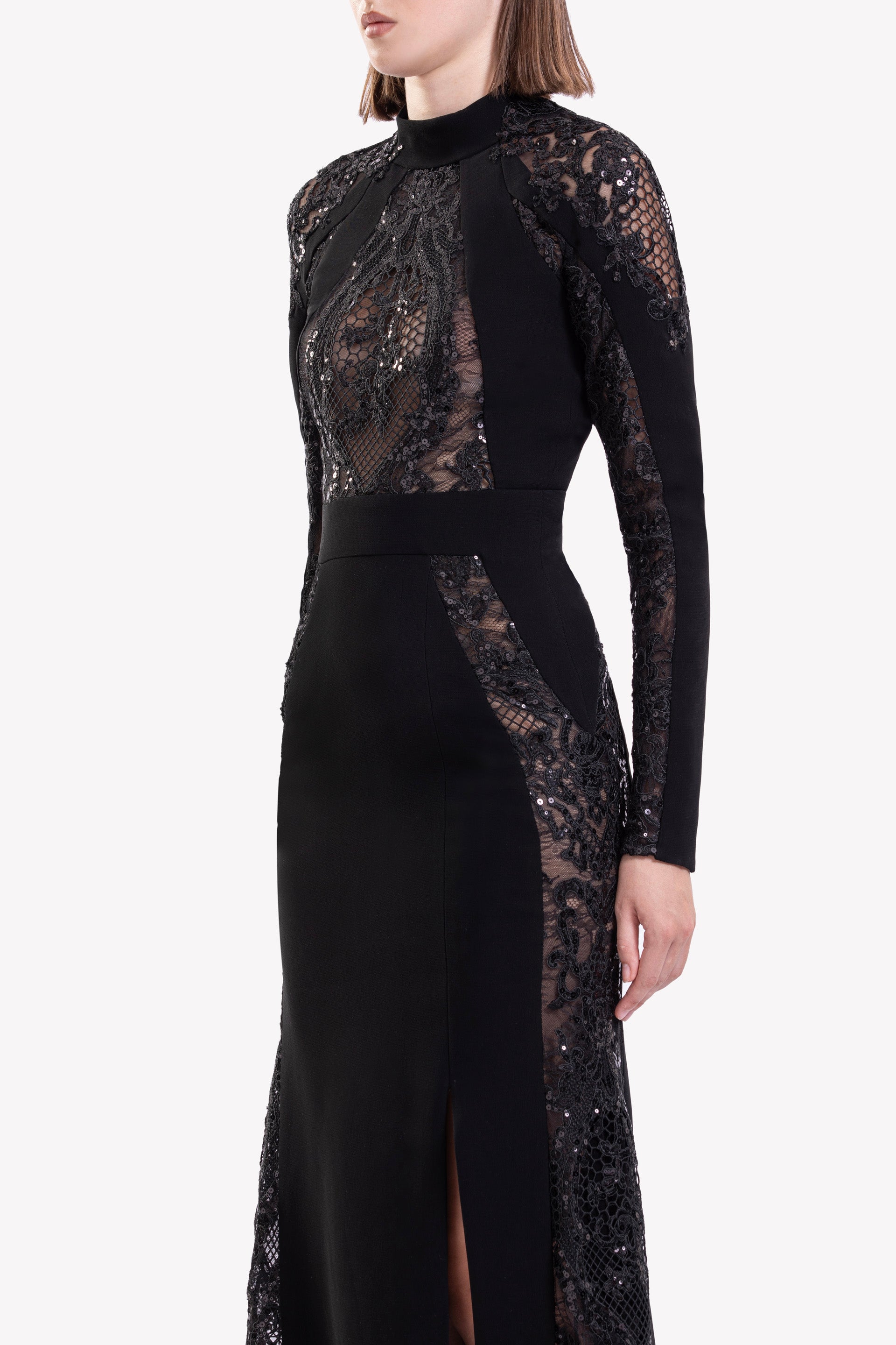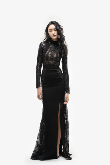 Jet-black long-sleeve evening dress with a high neckline and fitted silhouette. Sheer lace panels with intricate embroidery accent the bodice, sleeves, and sides. Floor-length skirt with a sleek straight cut and thigh-high slit.