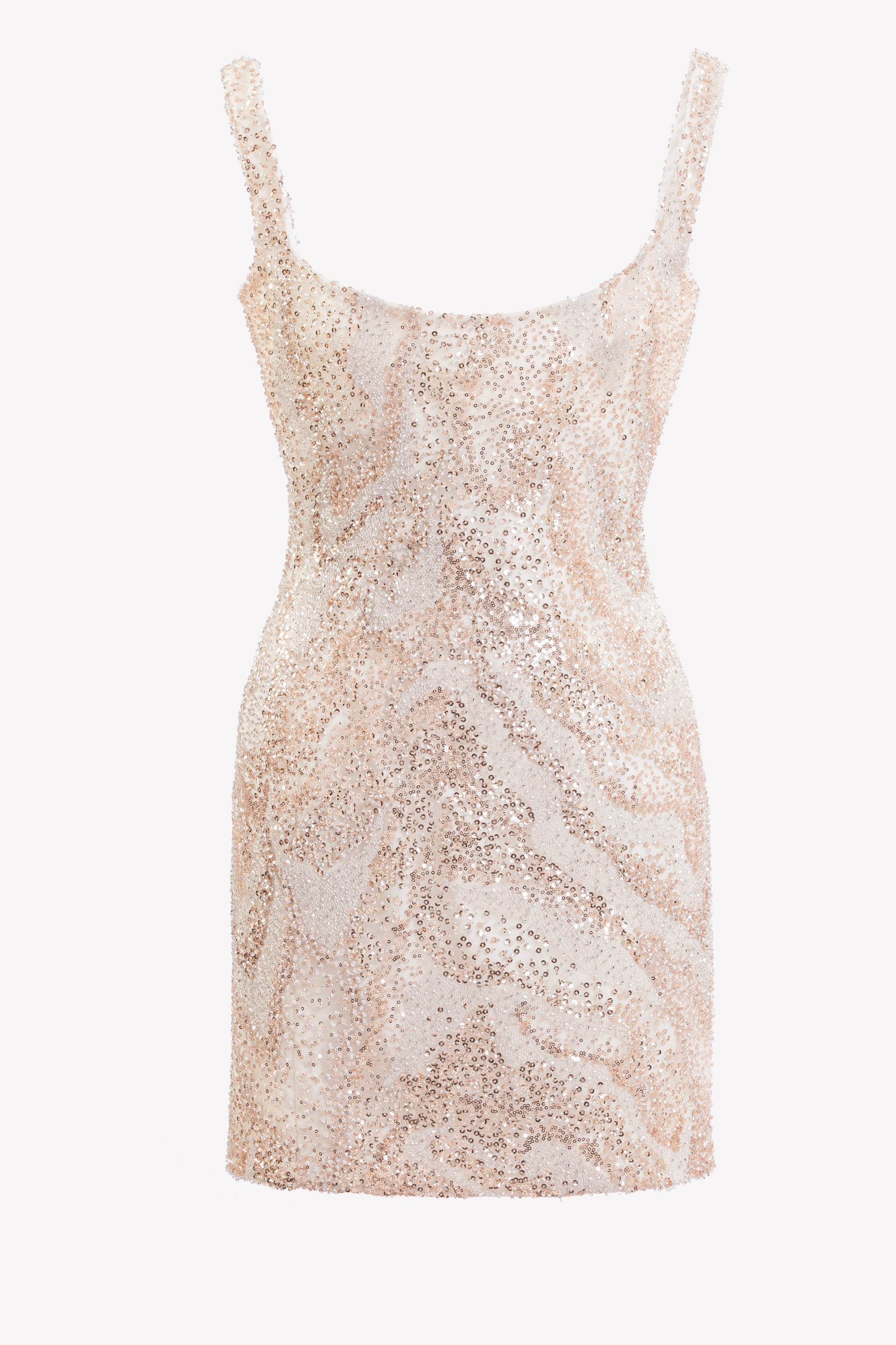 A light gold mini dress with a square neckline, all-over embroidery, and a matching colored scarf at the neck.