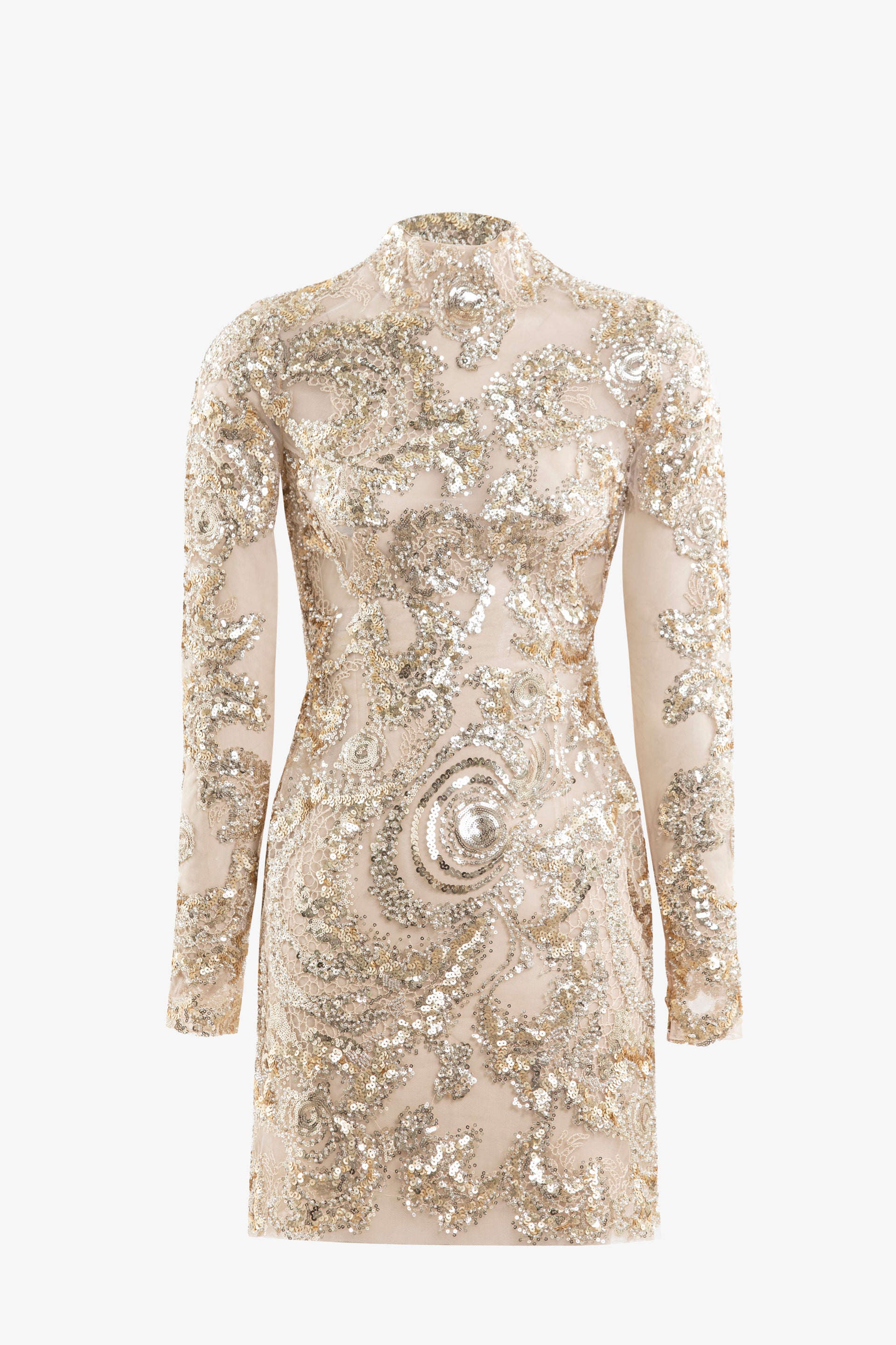 A light gold short fitted mini dress with long fitted sleeves and a high neckline, fully embroidered with intricate designs featuring sequins and beads, adding a glamorous and elegant touch to the look.