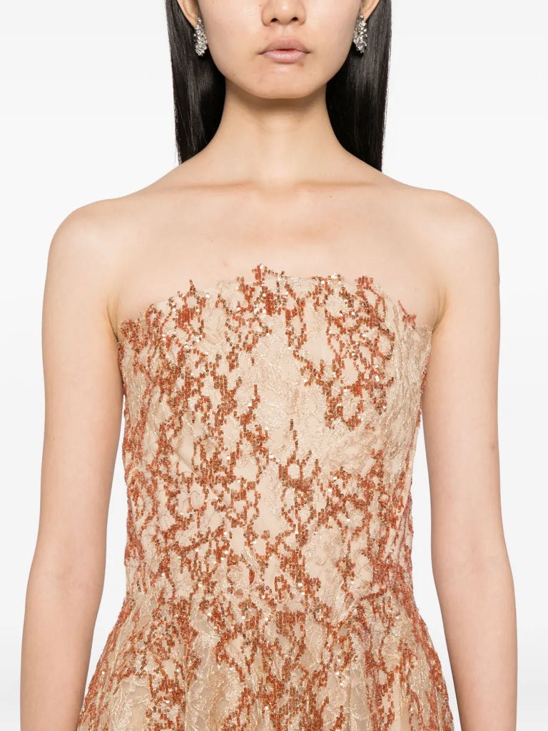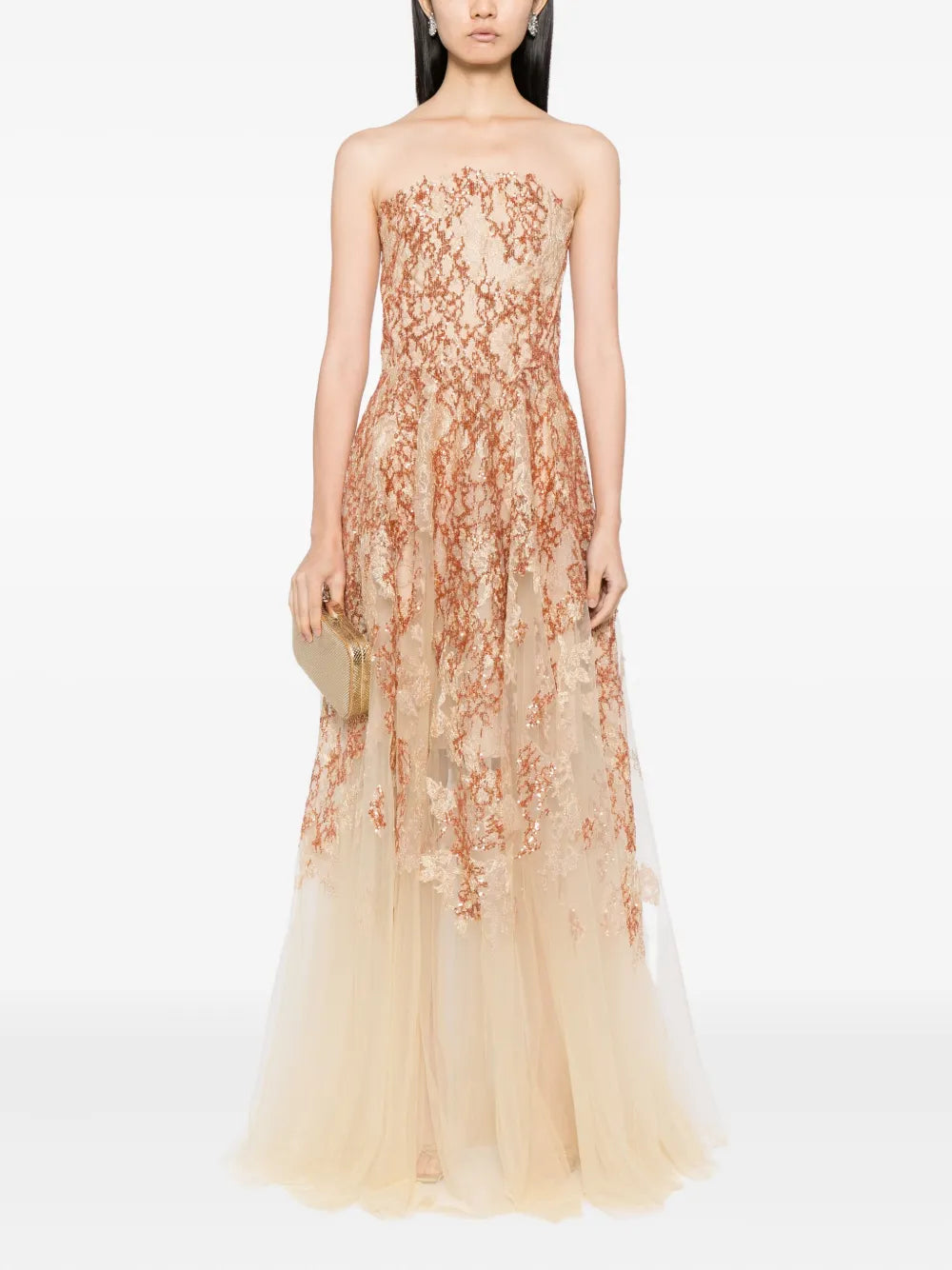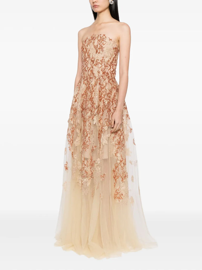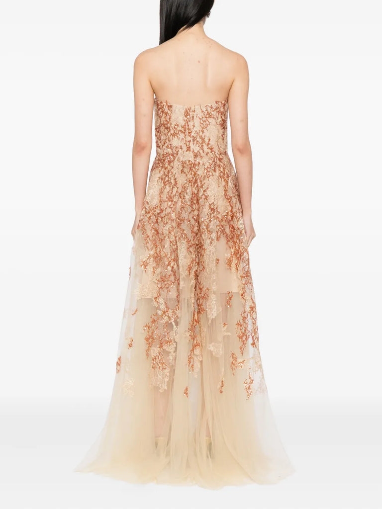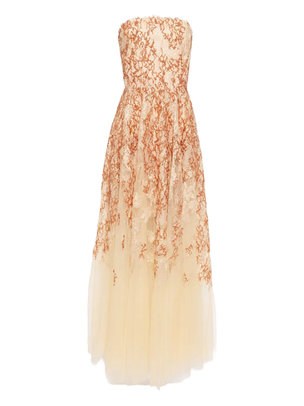 Off-white and gold embroidered strapless dress features a flowing, embroidered tulle design with a floor-length skirt. The strapless silhouette highlights the intricate floral pattern in off-white, accented with shimmering gold details