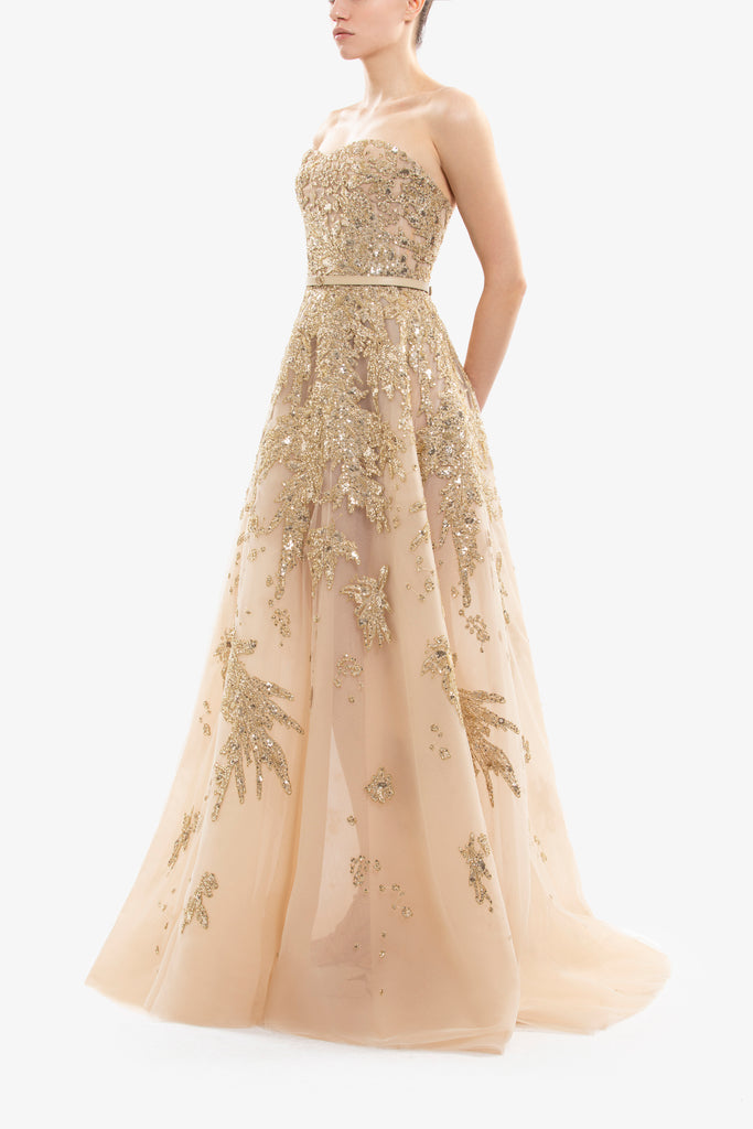 A light gold strapless dress with an A-line skirt, beautifully embroidered with intricate designs in light gold sequins and beads that gradually diminish toward the hemline. The dress is paired with a matching 100% SK leather belt.