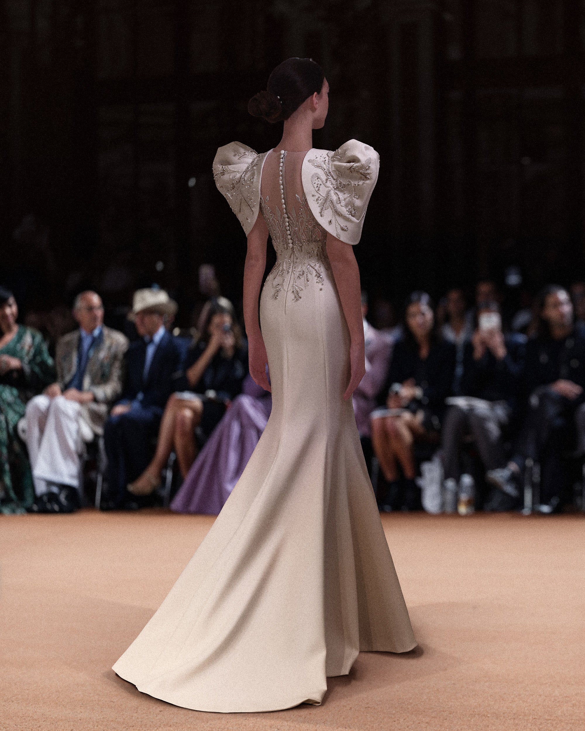 This elegant piece is paired with a shoulder cape that is fully embroidered, enhancing the overall sophistication and versatility of the dress.