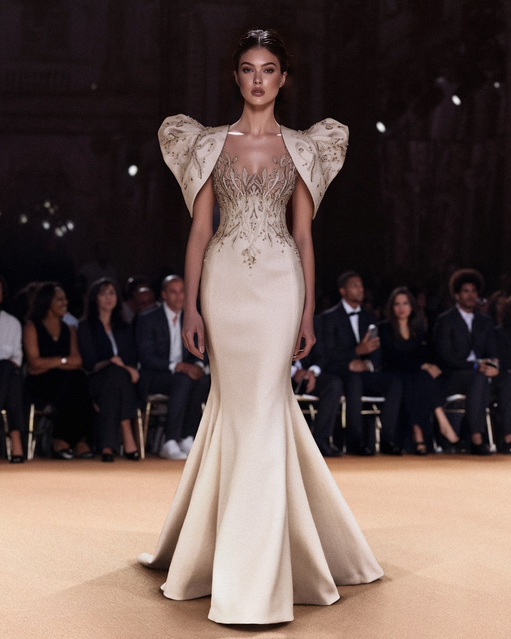 Introducing our Ivory Triple Crepe Satin Dress, designed to fit beautifully and create a stunning mermaid silhouette. The dress is fully embellished at the top with luxurious ivory materials, including ivory and light gold beads and threads, along with delicate lace accents for added texture.