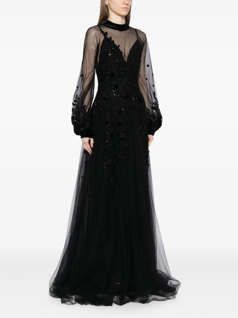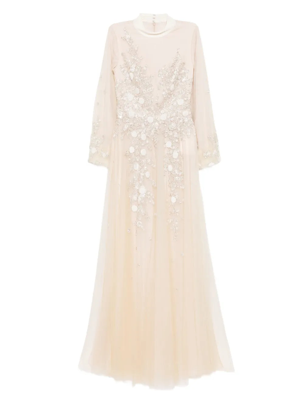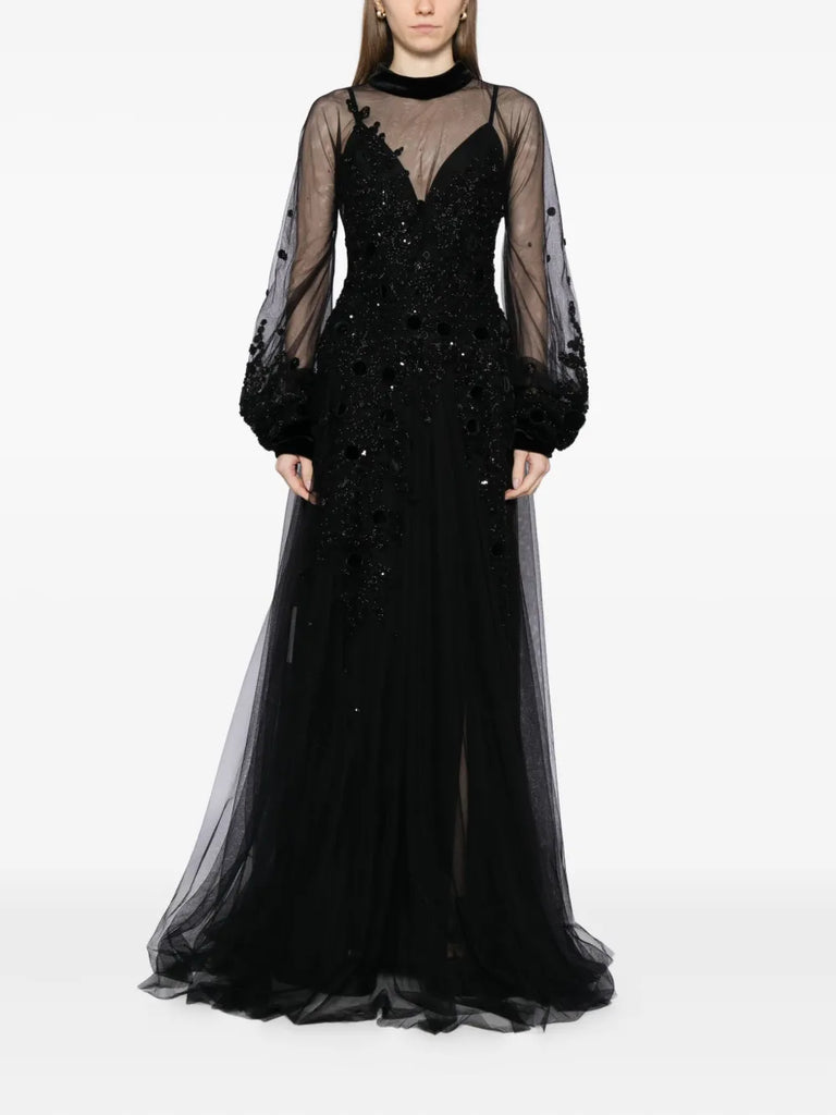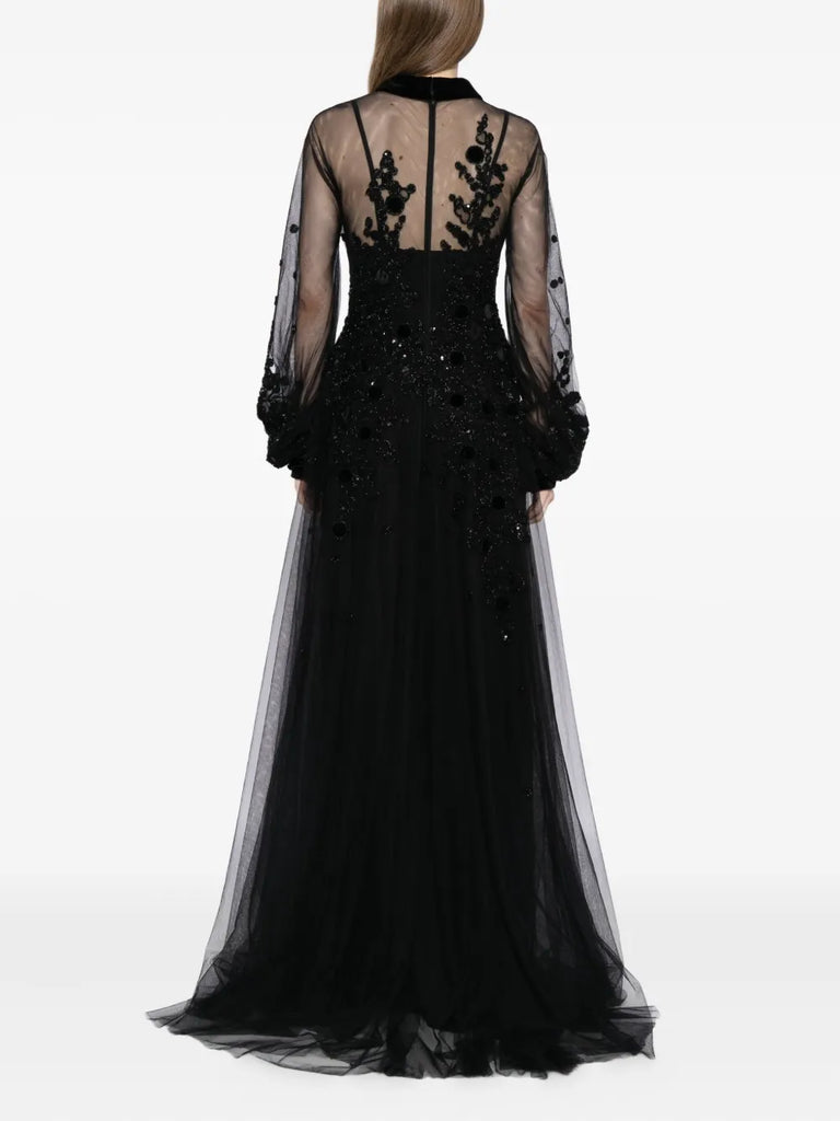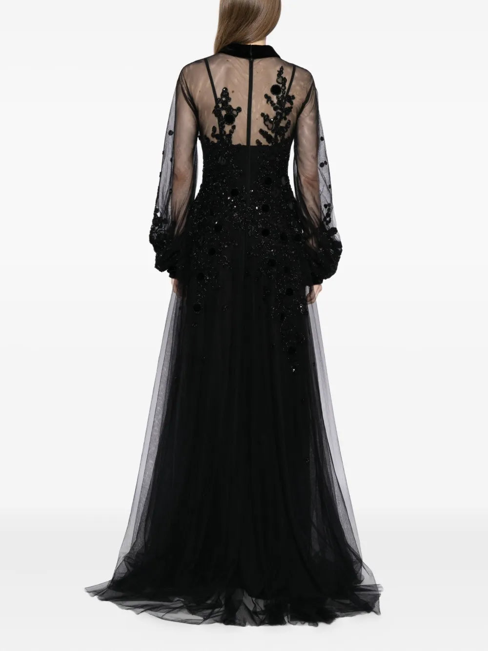 The burgundy embroidered velvet circles dress features long sleeves with velvet cuffs, the intricate embroidery begins on the bust and gracefully extends onto the skirt.
