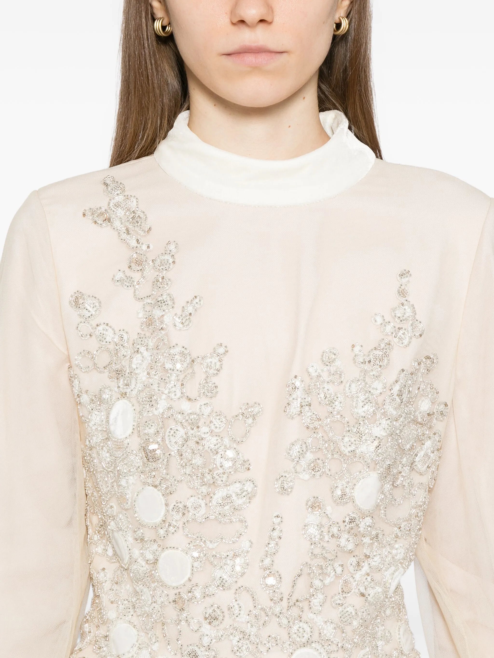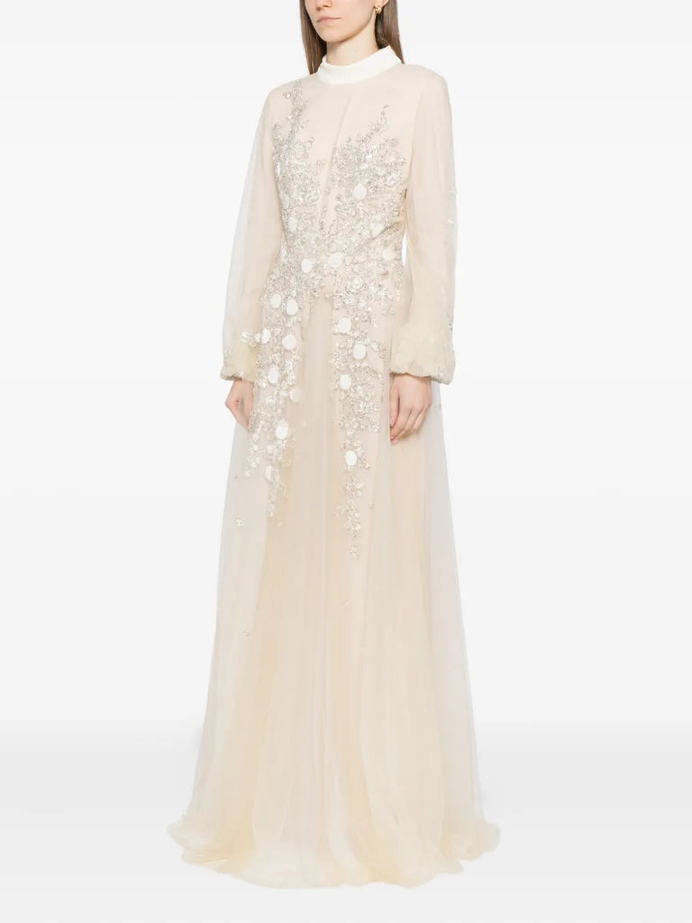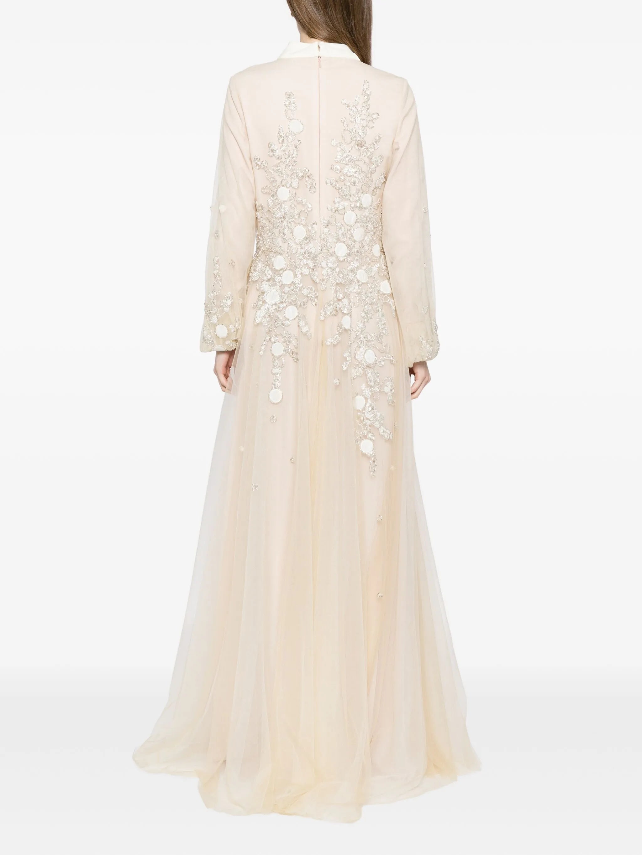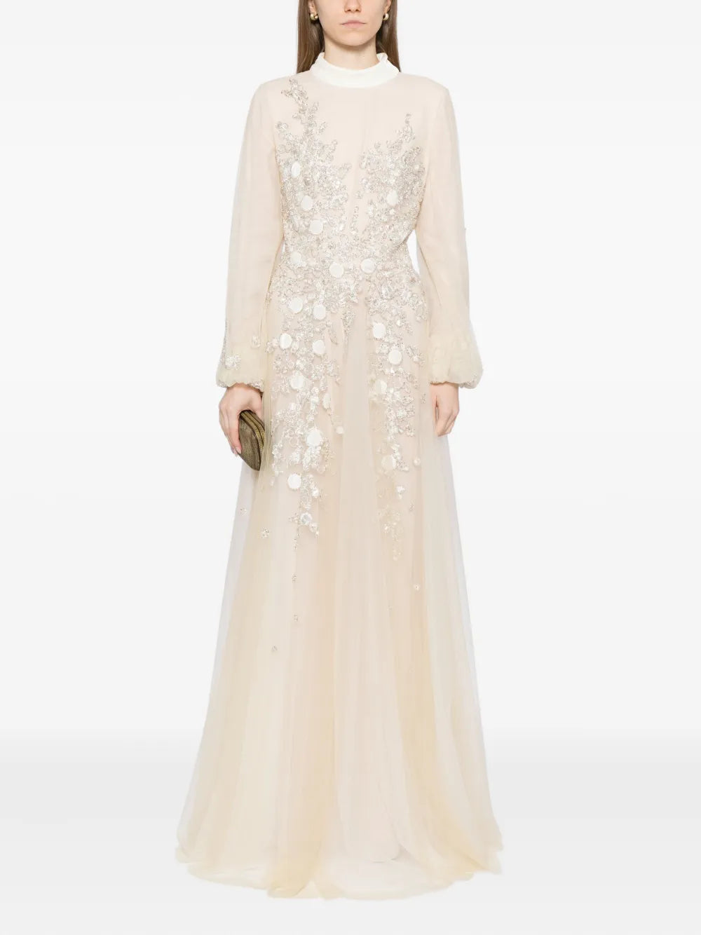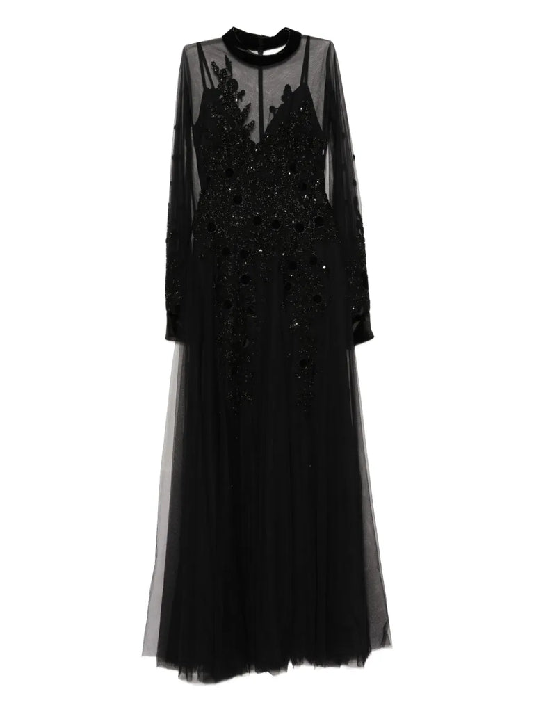 The burgundy embroidered velvet circles dress features long sleeves with velvet cuffs, the intricate embroidery begins on the bust and gracefully extends onto the skirt.