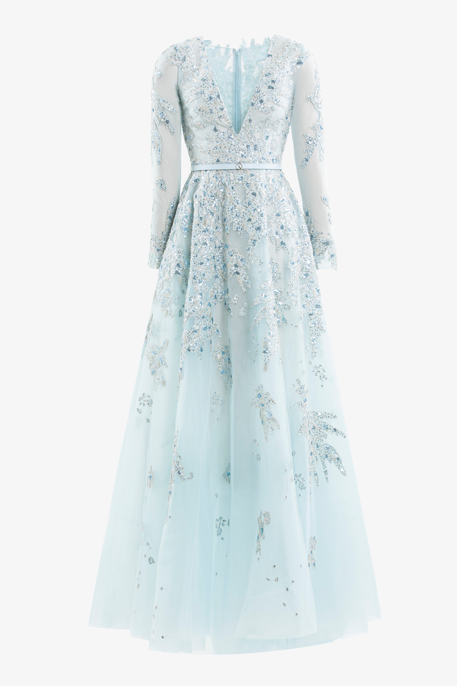 An Ice blue dress featuring a deep V-neckline, long sleeves, and an A- line skirt, fully embroidered with intricate designs in silver and blue using materials like sequins, beads, and crystals. It is elegantly paired with a matching 100% leather SK belt.