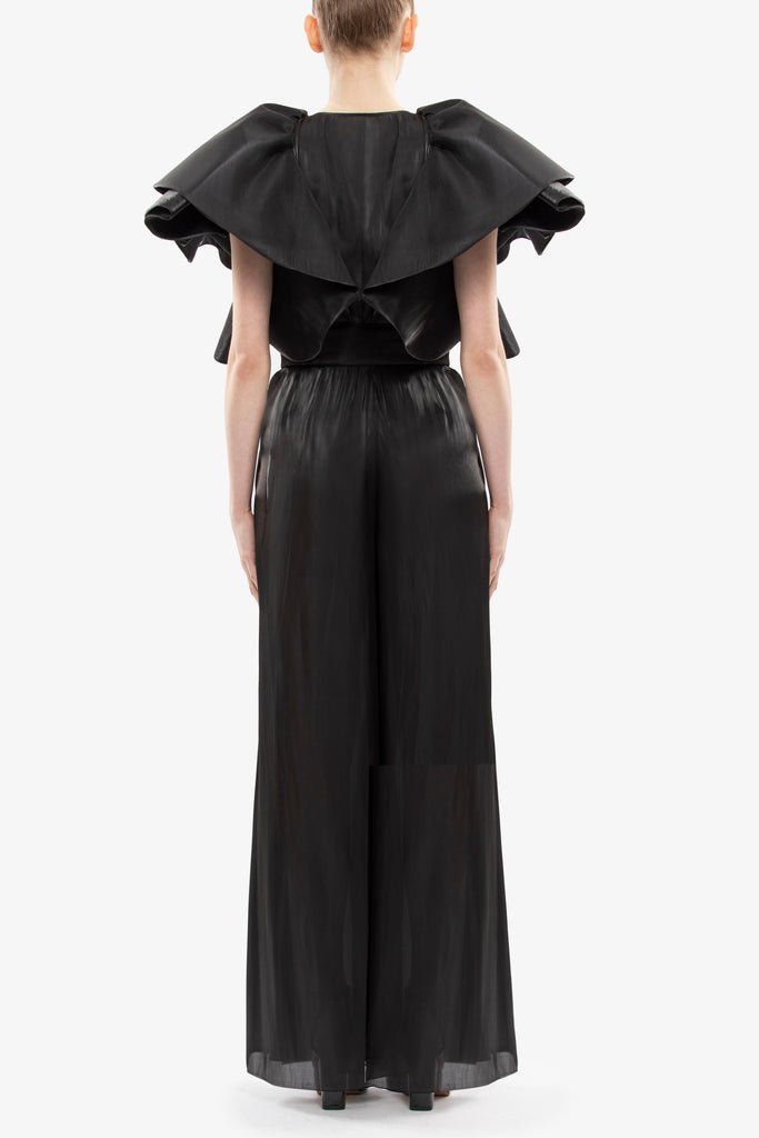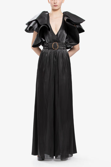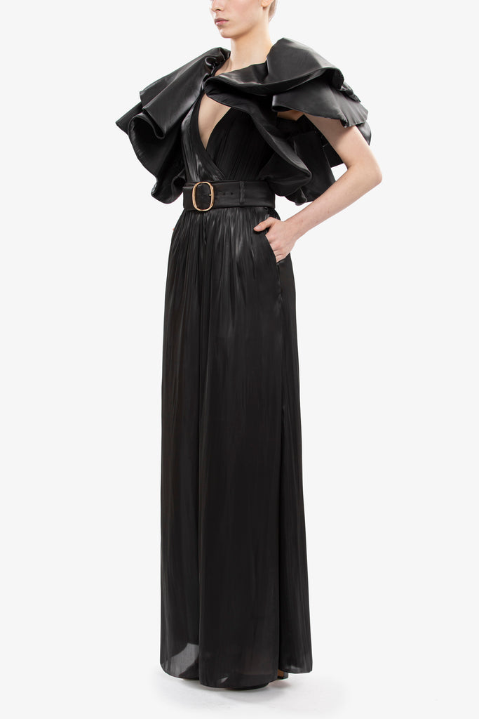Jet black satin wide-cut pants, elegantly paired with a belt featuring a gold buckle