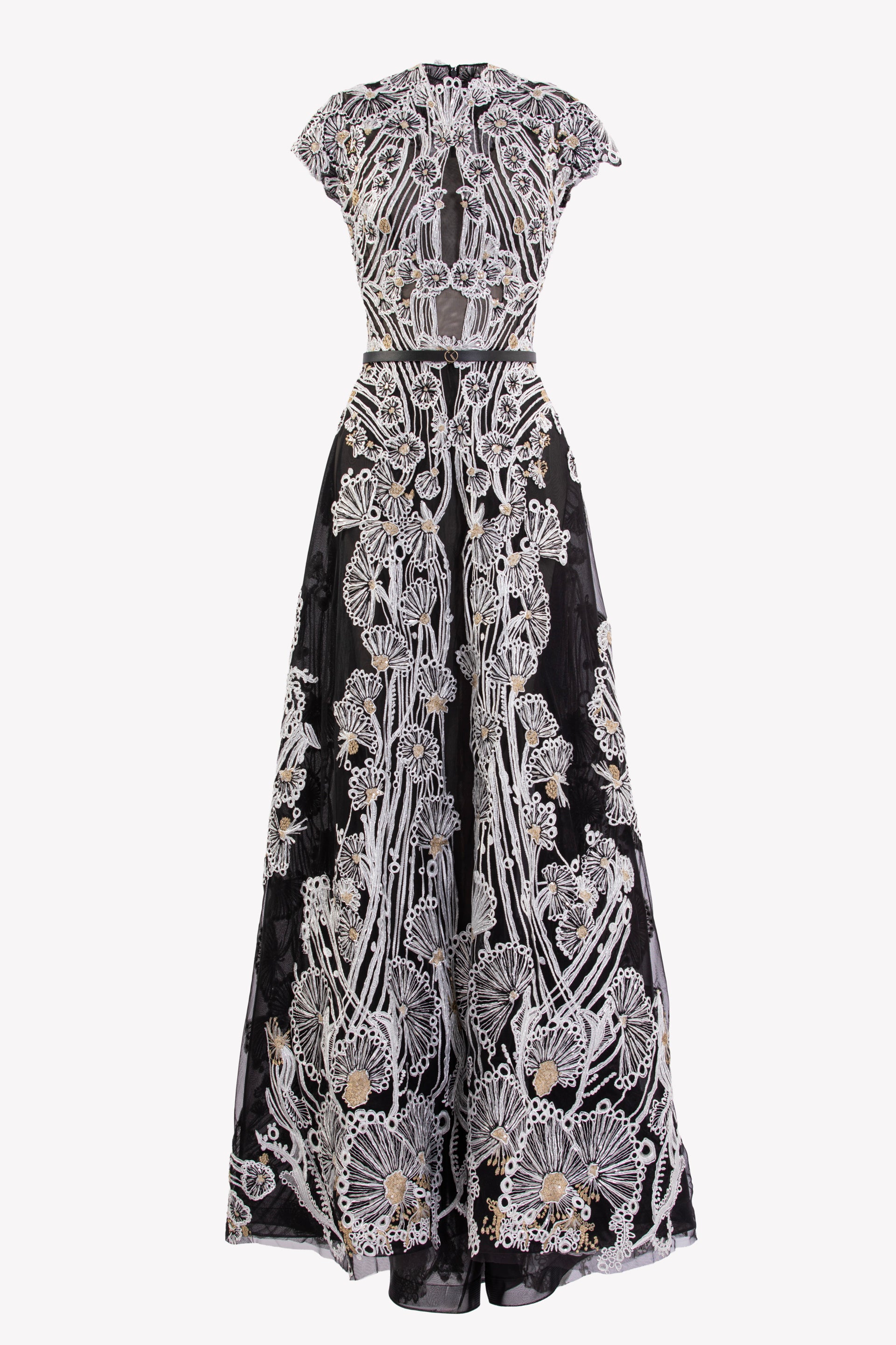 Jet-black fully embroidered tulle gown with intricate raffia off-white thread, fitted bodice with cap sleeves, and A-line skirt.