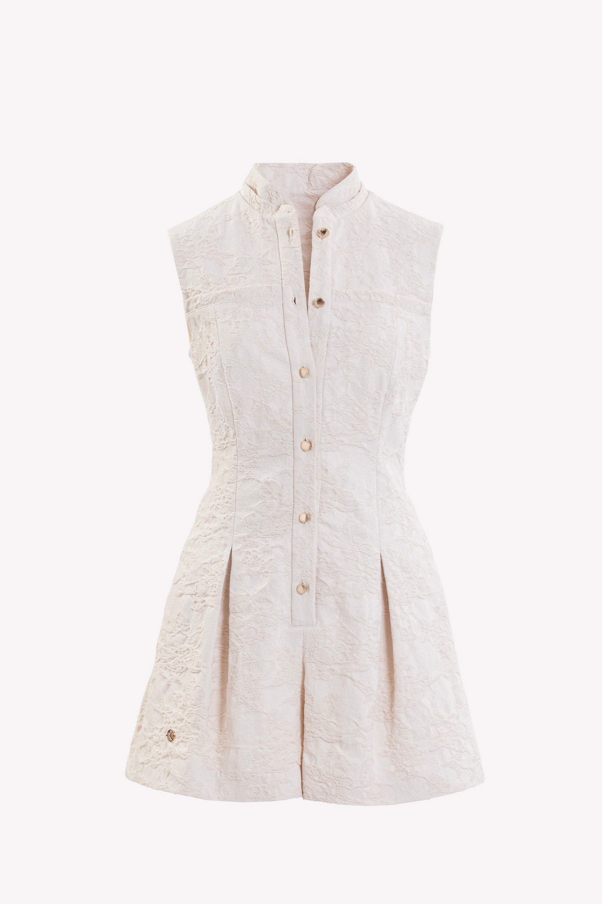 Ivory jacquard sleeveless jumpsuit with a stand collar and button-down front, featuring a fitted bodice, structured pleated shorts with side pockets, and a mid-thigh length.