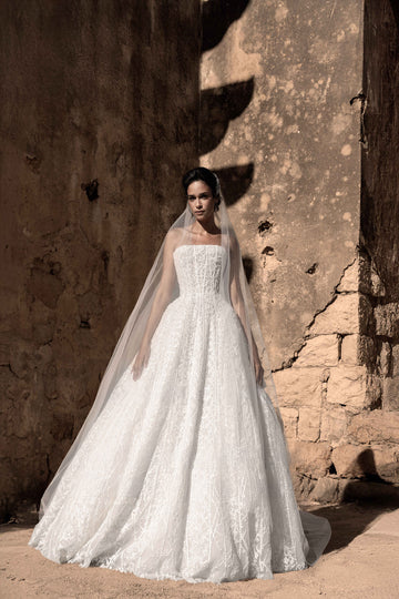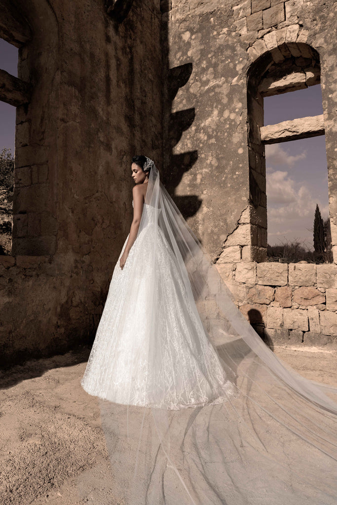 Off-white dress in embroidered tulle with a strapless straight-across neckline and a structured corset bodice. The full skirt is richly embroidered with linear patterns all over. The back features a clean, modern cut that flows into a graceful train. Paired with a matching 3.25 meters plain veil.