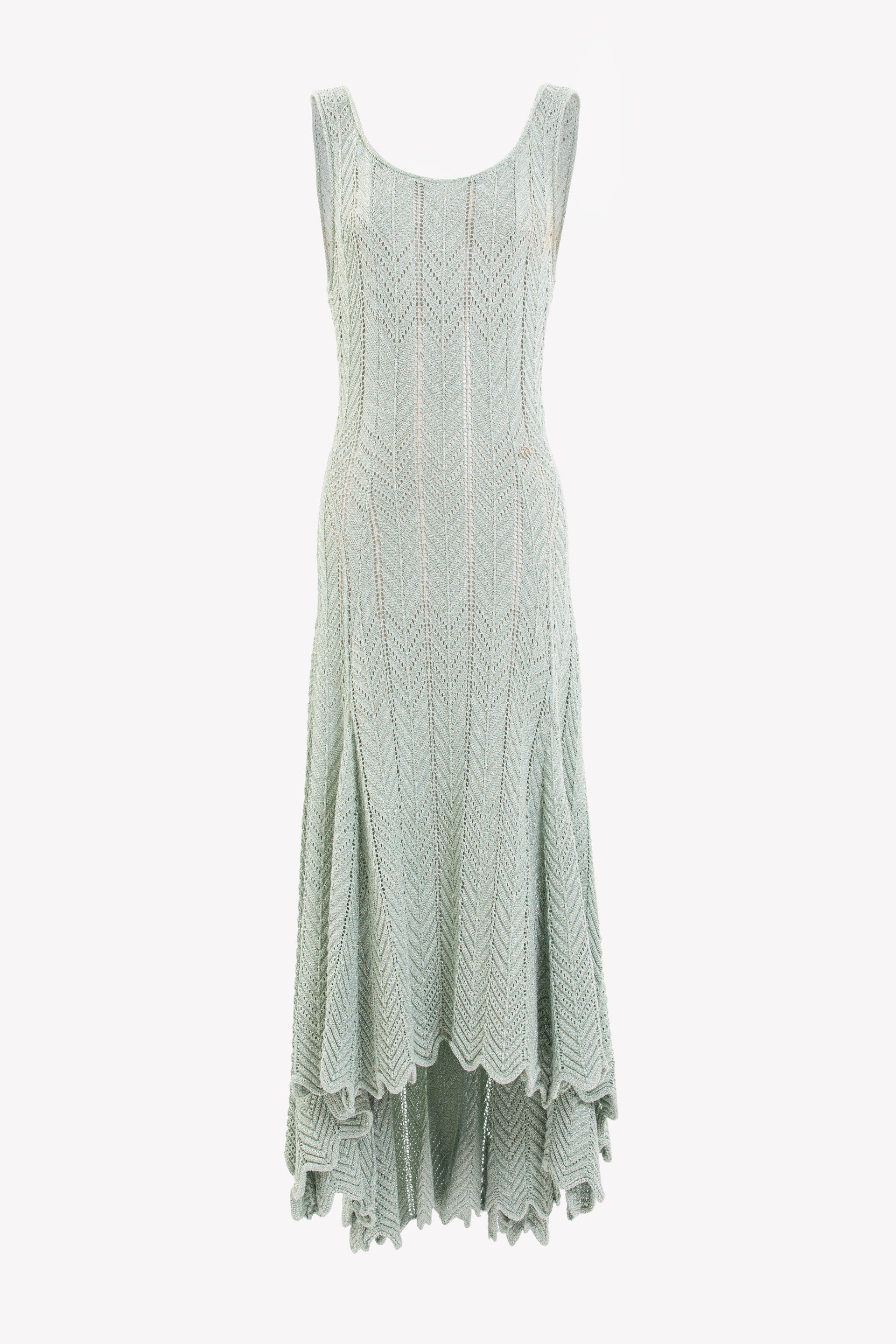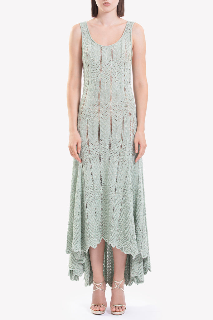 Reed knit midi dress with a geometric pattern and open stitching, featuring a scoop neckline, flowing silhouette, and an uneven high-low hemline, adorned with the SK logo.