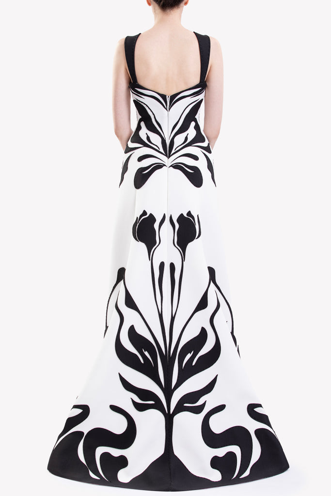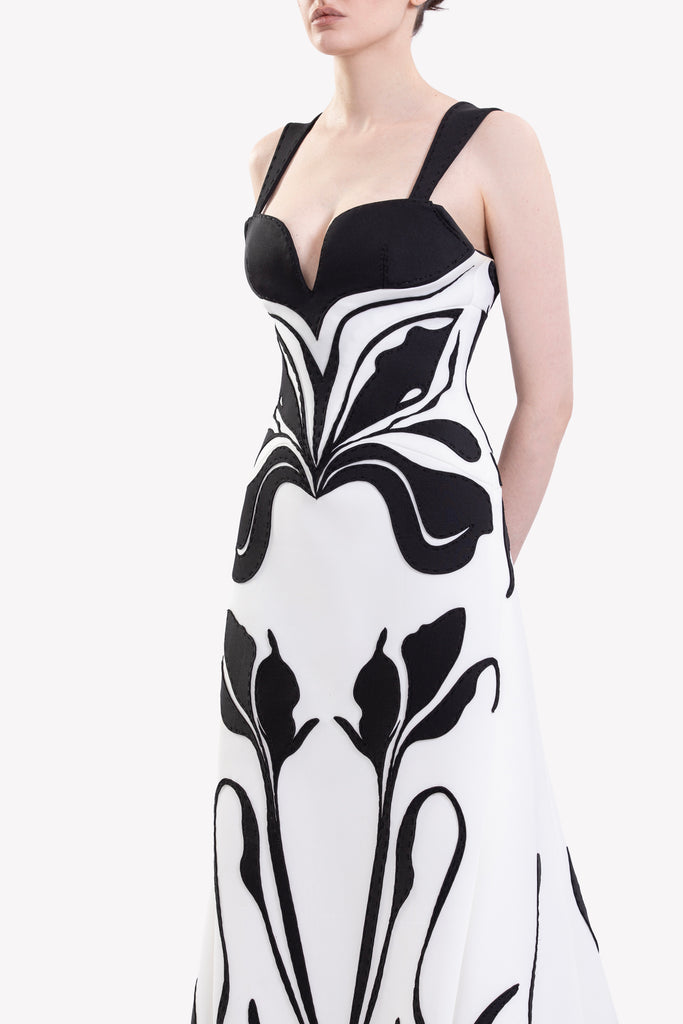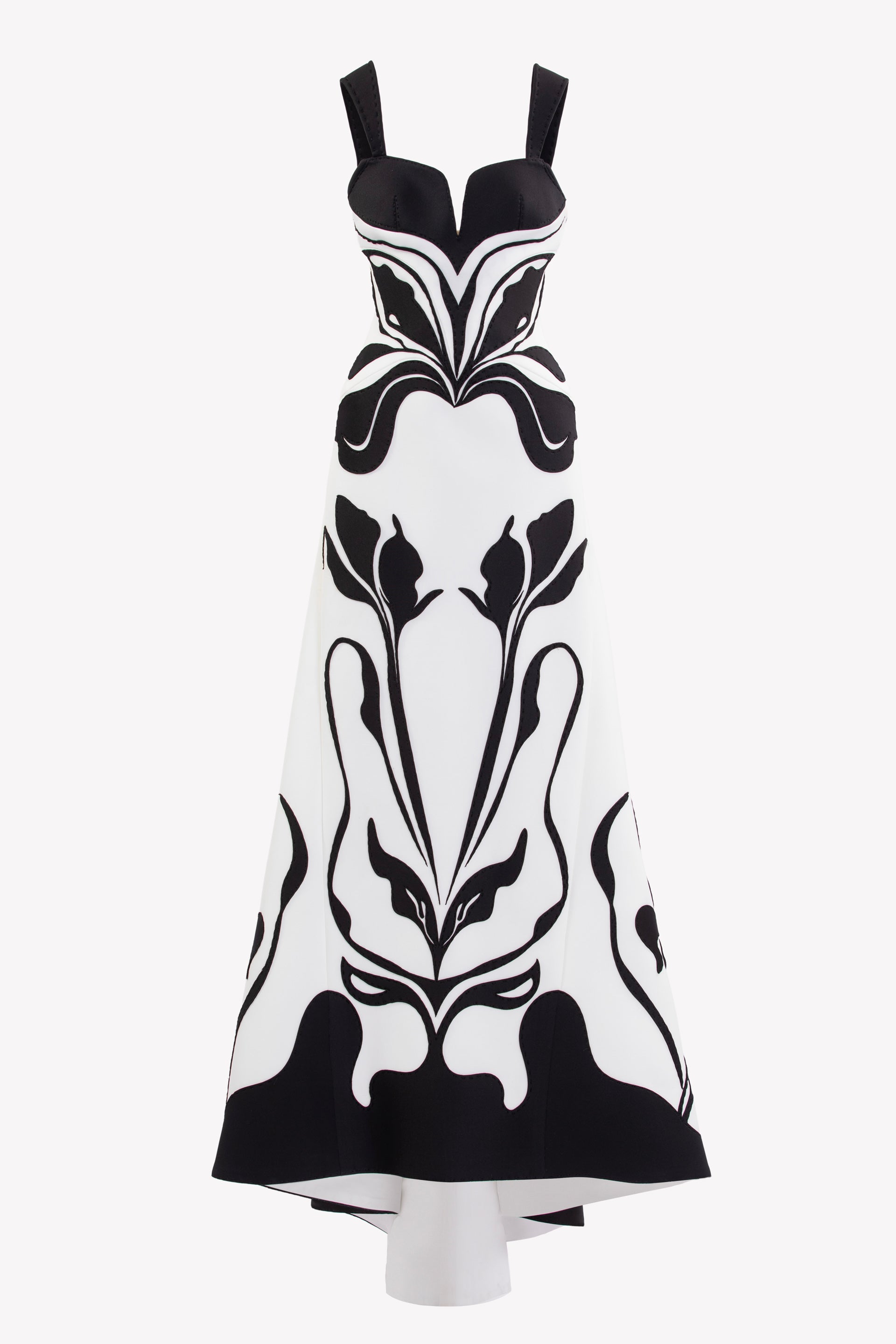 Jet-black and off-white scuba dress with a fitted bodice and wide straps, featuring a jet-black laser-cut floral pattern layered over a white base. The design flows into a floor-length A-line skirt with a structured silhouette, finished with a subtle train at the back.