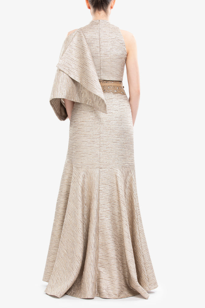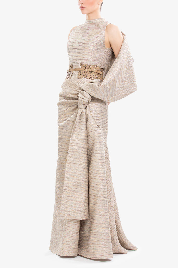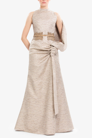 A stunning light gold halter neck dress, floor-length, featuring knotted fabric at the hipline that gracefully extends to the back.
