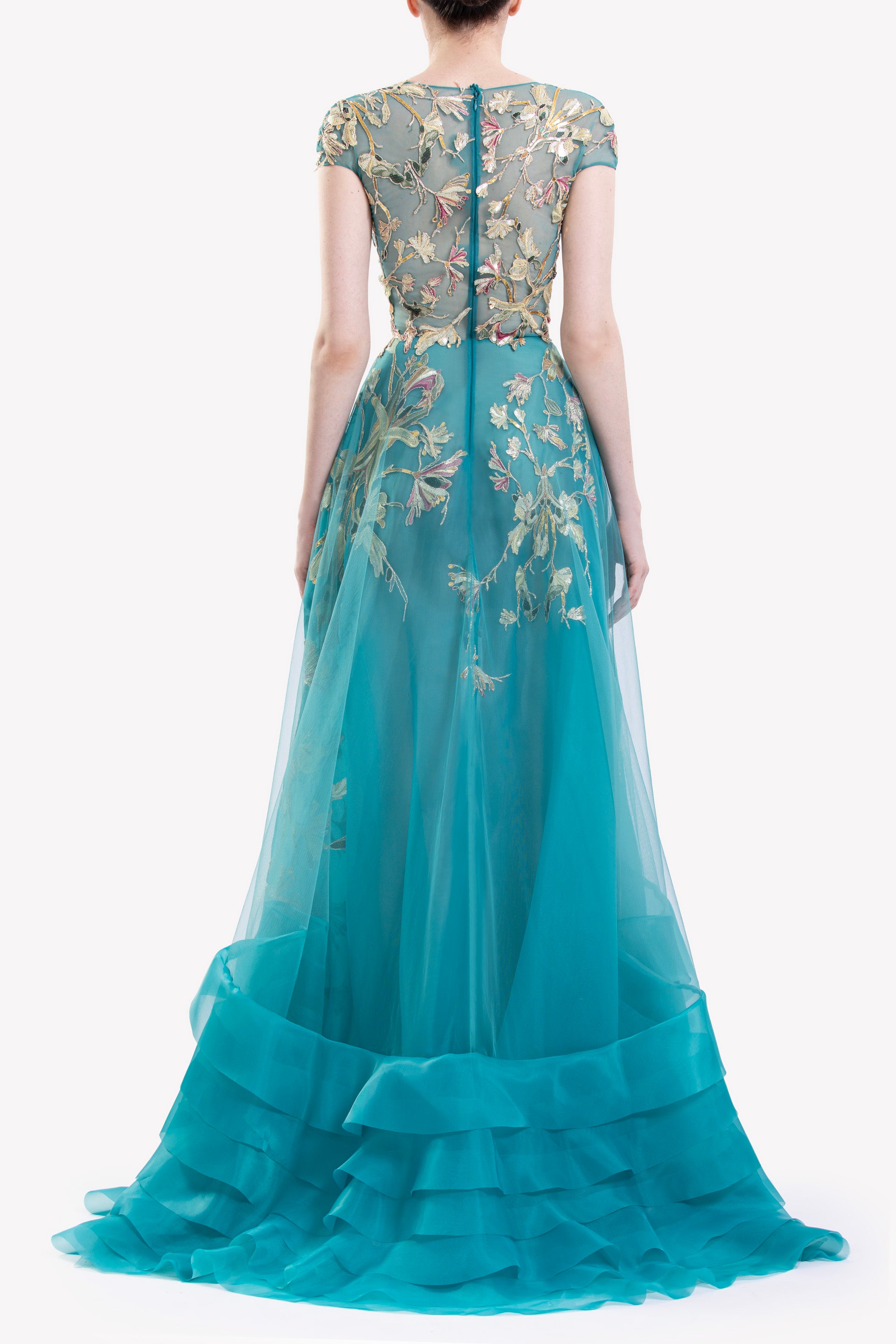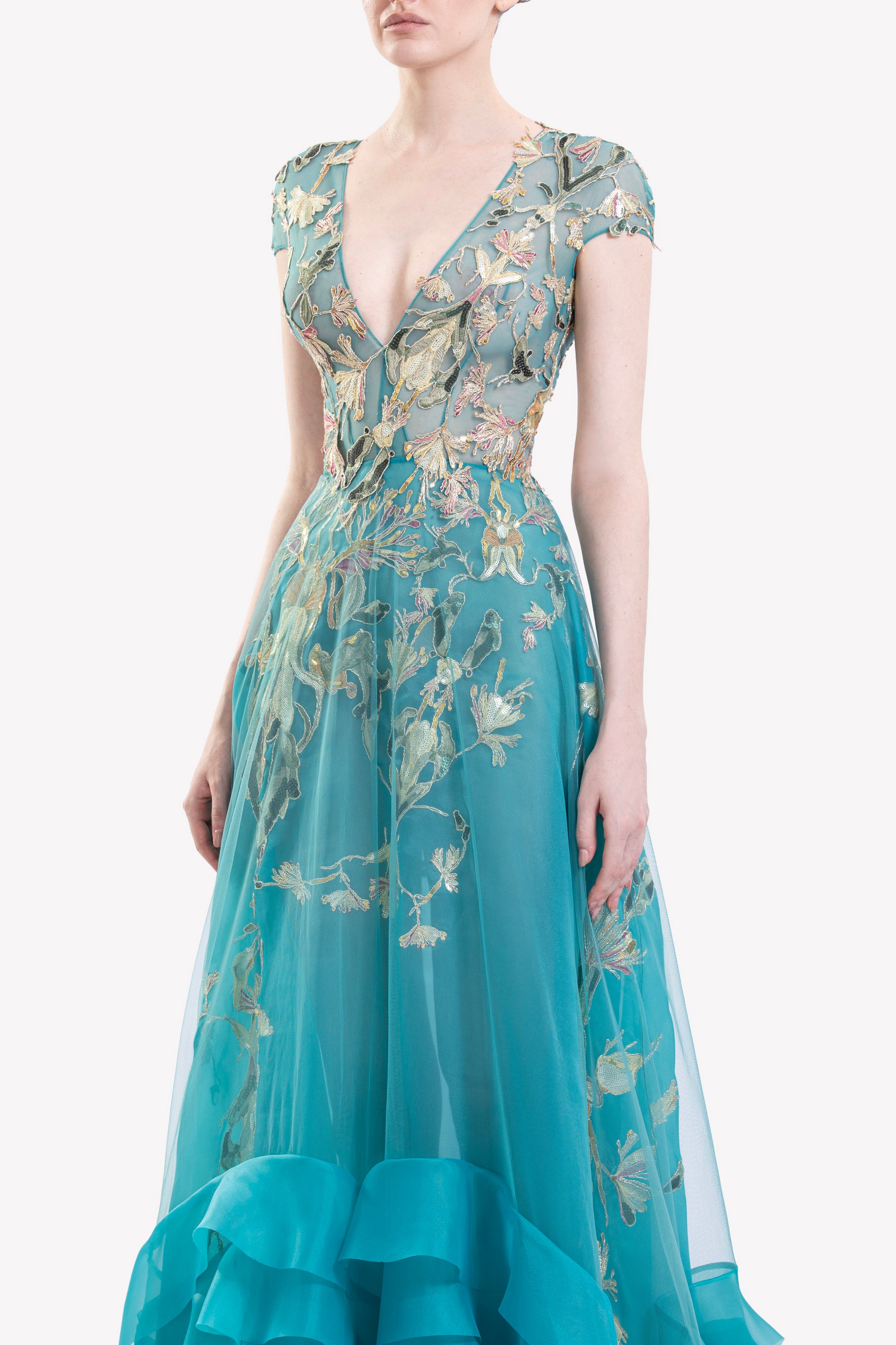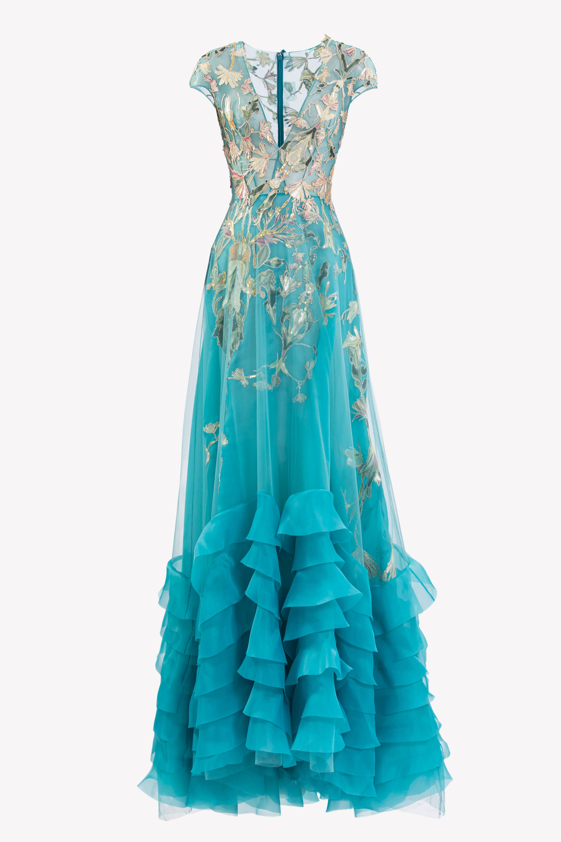 Paired with North Sea blue tulle gown with a sheer, ethereal quality. Fitted bodice with deep Vneckline, cap sleeves, and intricate soft metallic floral embroidery. Skirt flows into layered cascading ruffles at the hem