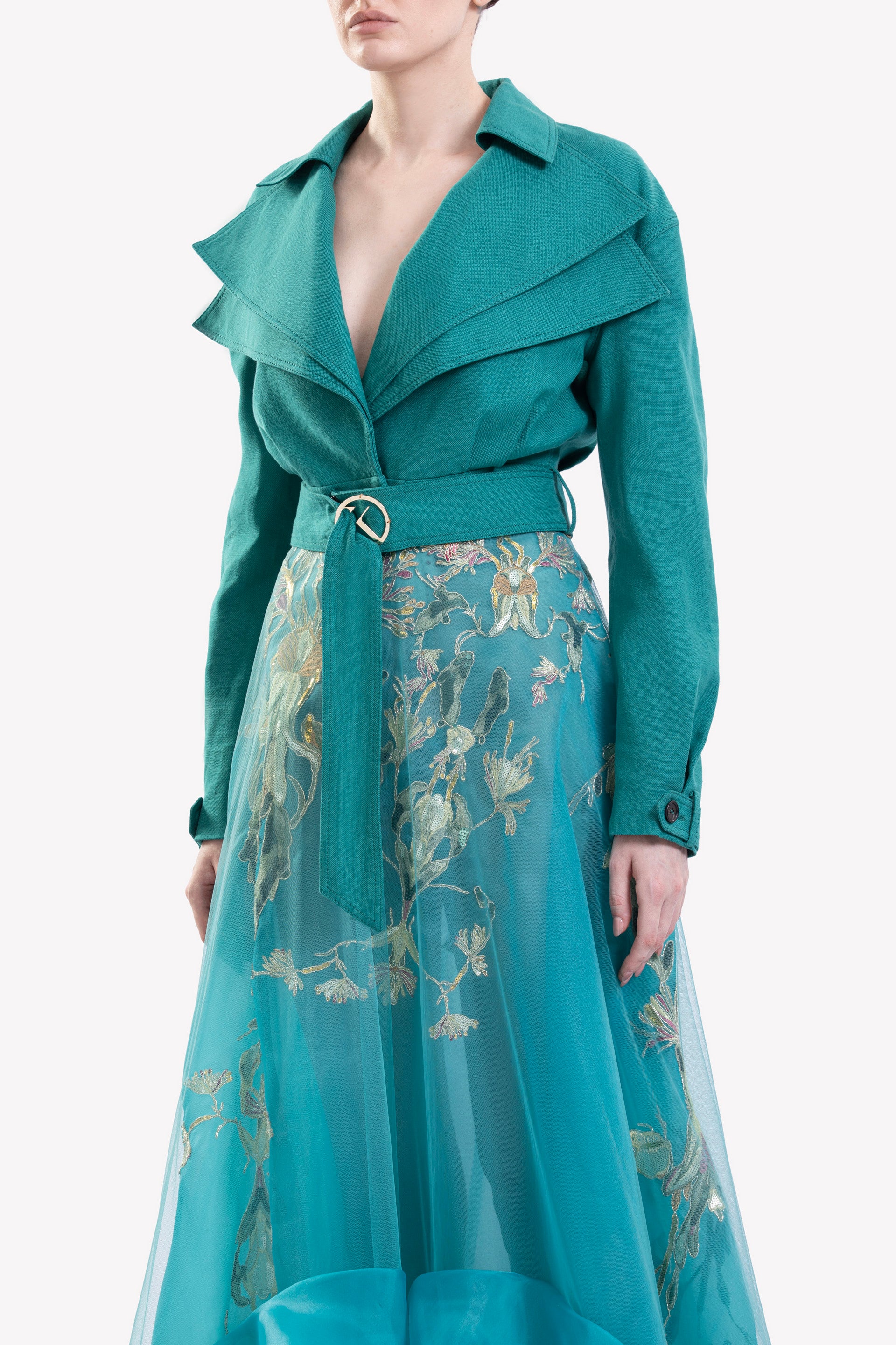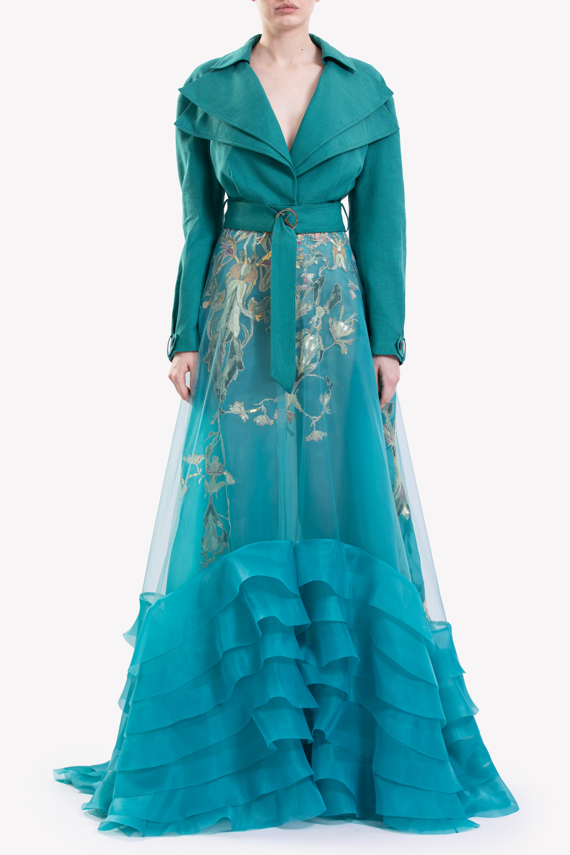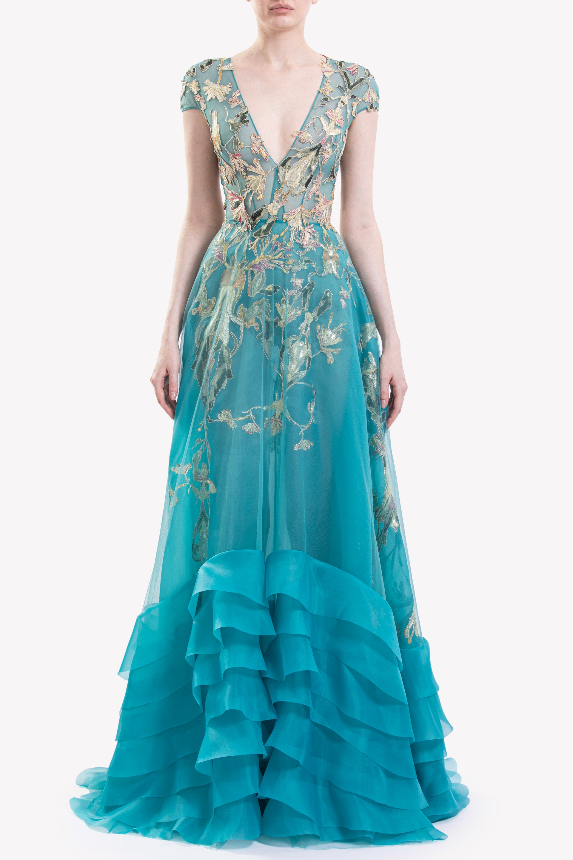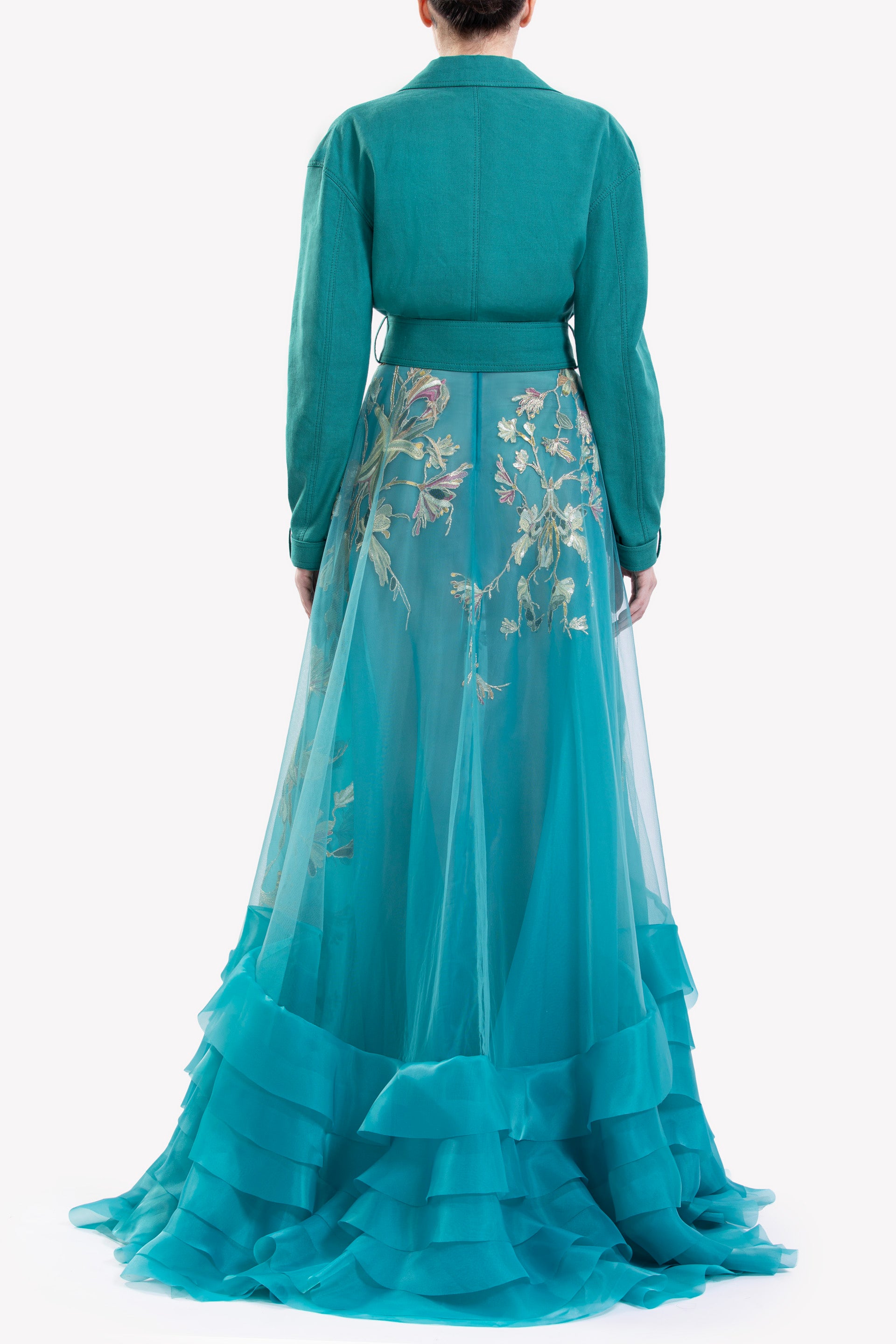 Paired with North Sea blue tulle gown with a sheer, ethereal quality. Fitted bodice with deep Vneckline, cap sleeves, and intricate soft metallic floral embroidery. Skirt flows into layered cascading ruffles at the hem