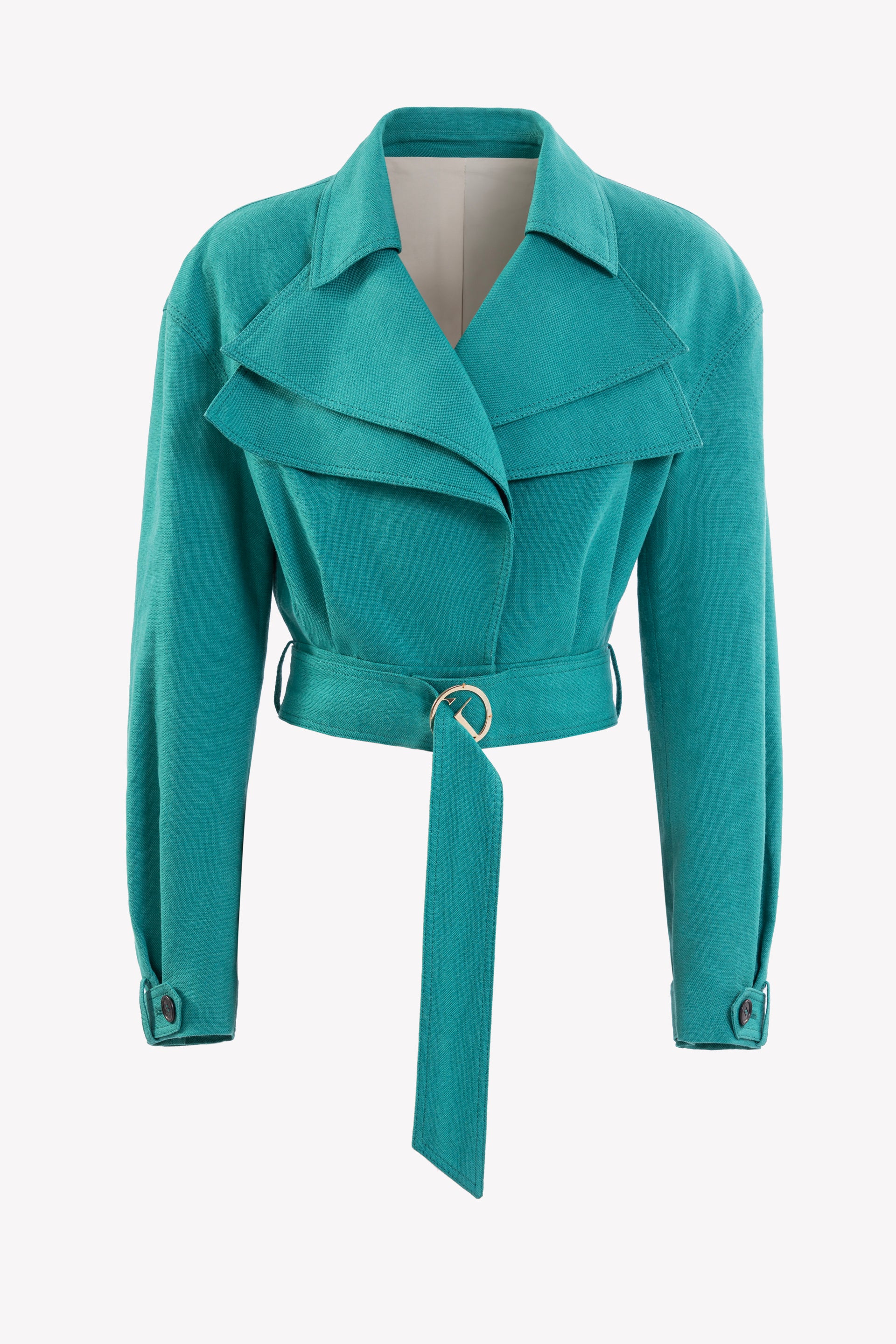 North Sea jacket in a structured cropped silhouette with double wide lapels adorned with the SK logo, featuring long sleeves, tailored seams, and a belted waist with SK logo detailing.