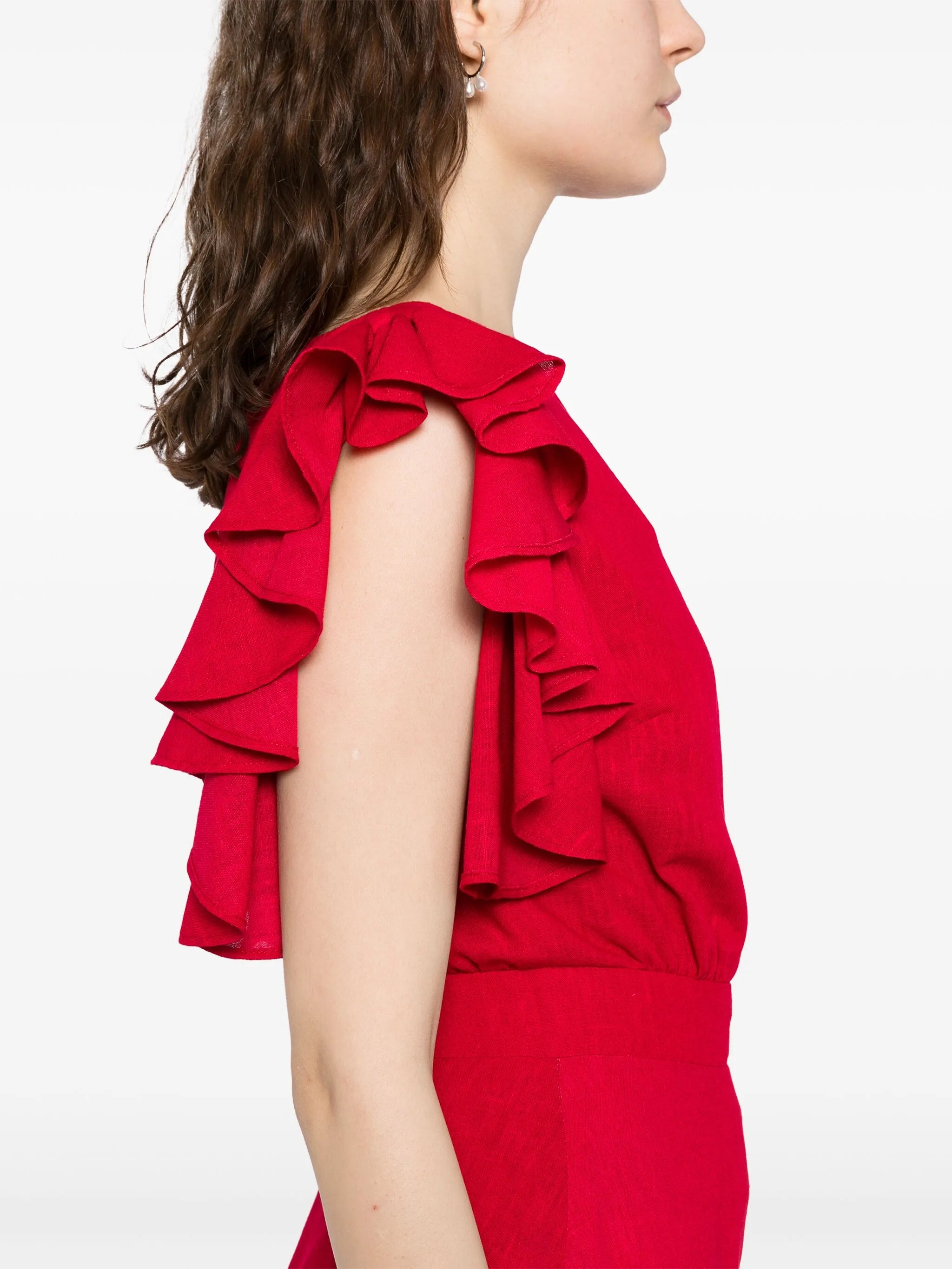 This red linen short dress showcases expert tailoring with a refined bateau neckline and an asymmetrical ruffle volant on one shoulder, adding a sophisticated touch. The skirt features layered ruffles that create movement and dimension, combining comfort and elegance in breathable linen fabric—ideal for warm weather occasions.