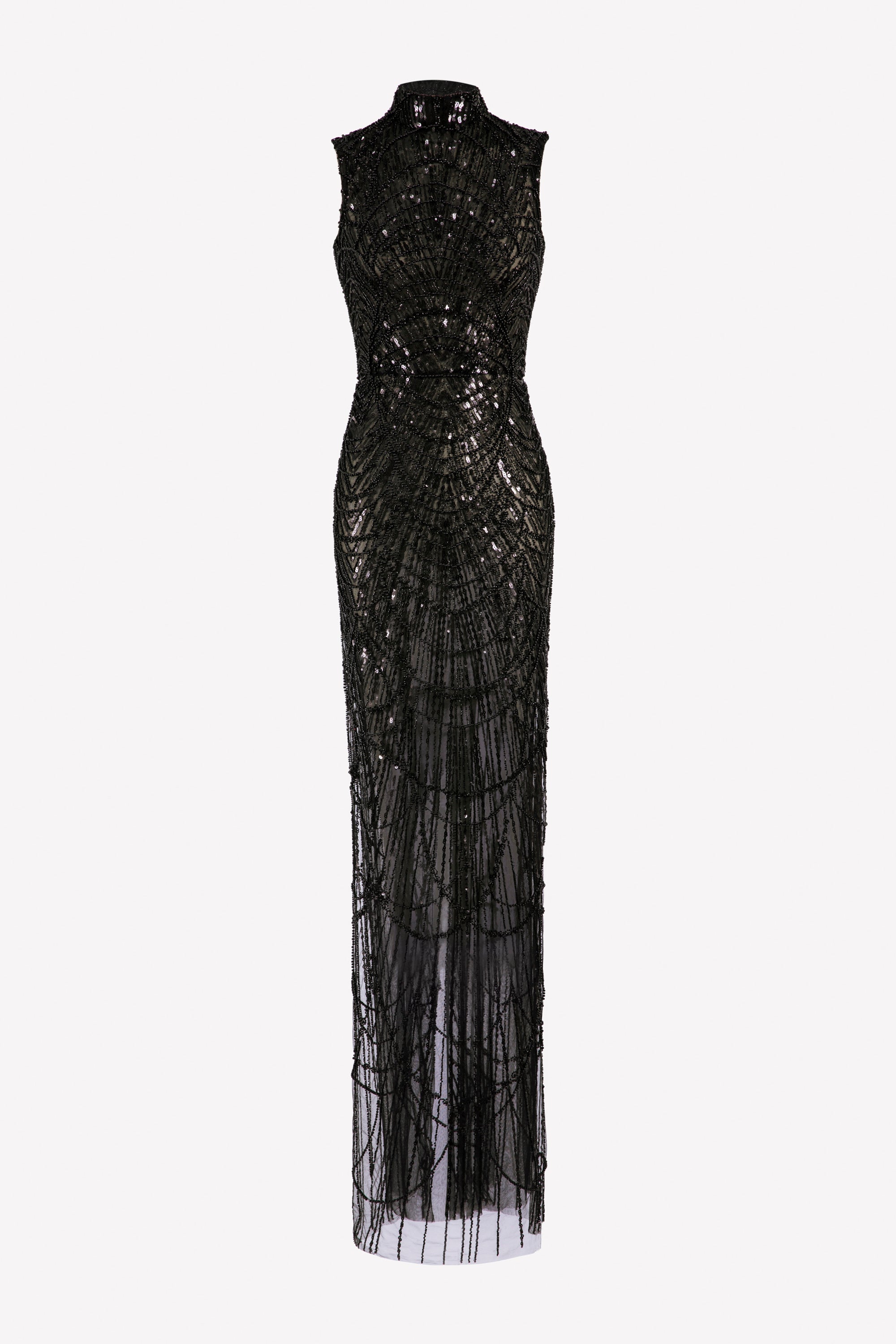 The Jet Black fully beaded long fitted dress features intricate sequins and beadwork in a captivating pattern.