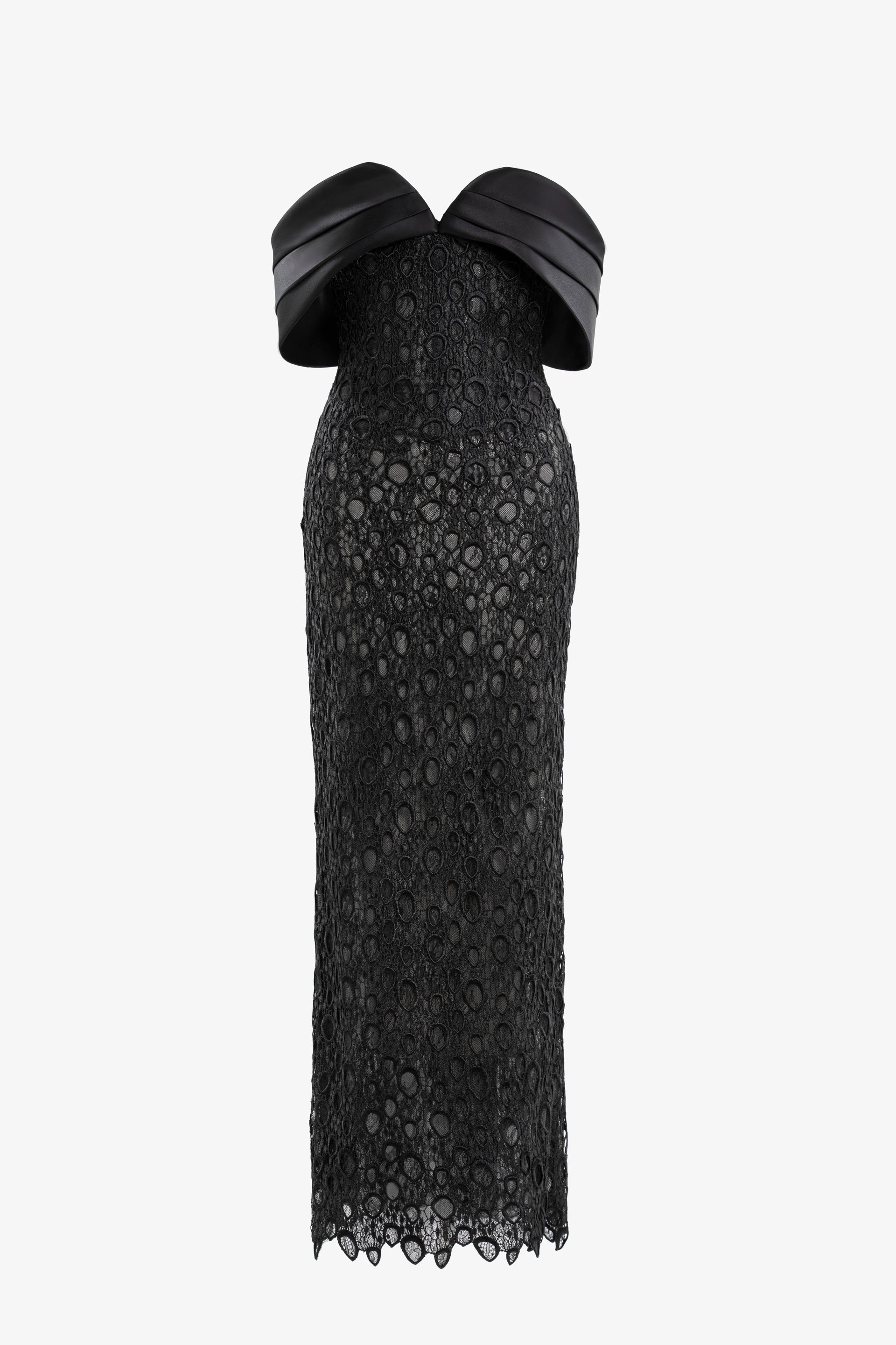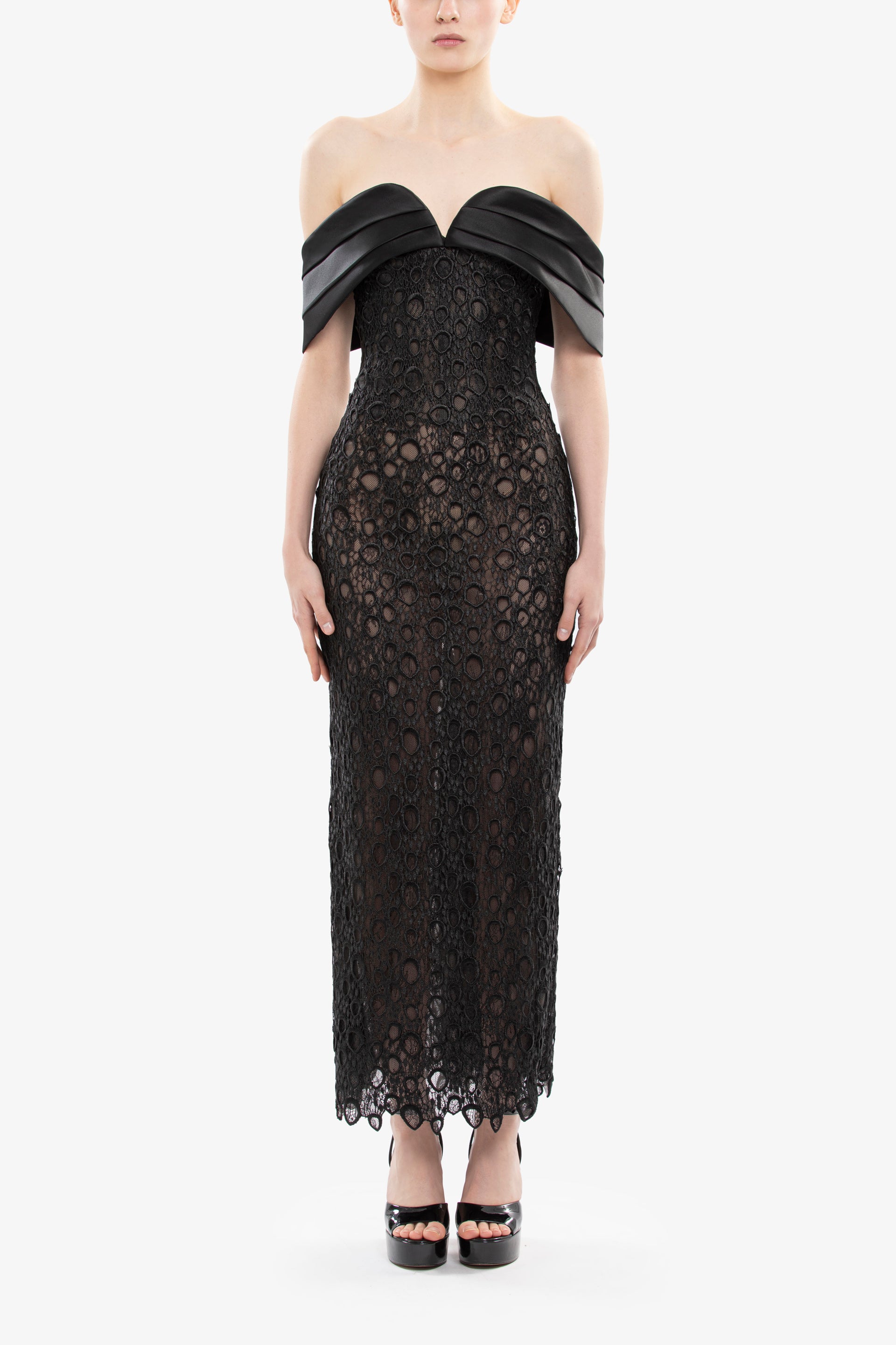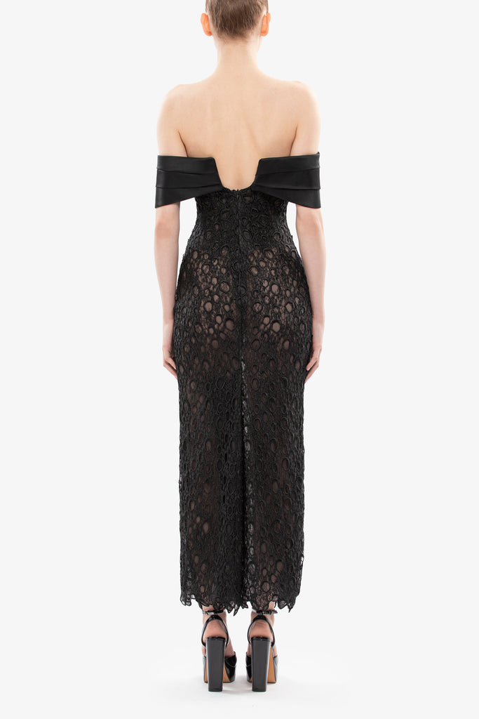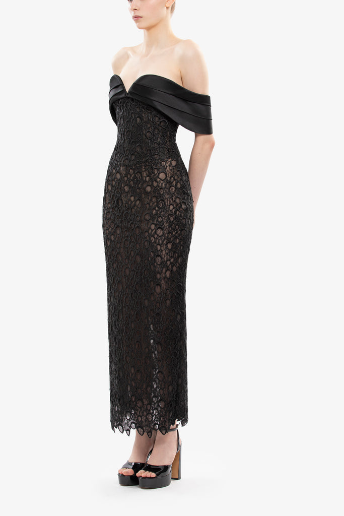 A jet-black off-shoulder dress with a midi-length skirt, crafted from luxurious guipure fabric. The dress is enhanced with delicate crepe satin detailing and features an elegant draped off-shoulder design.