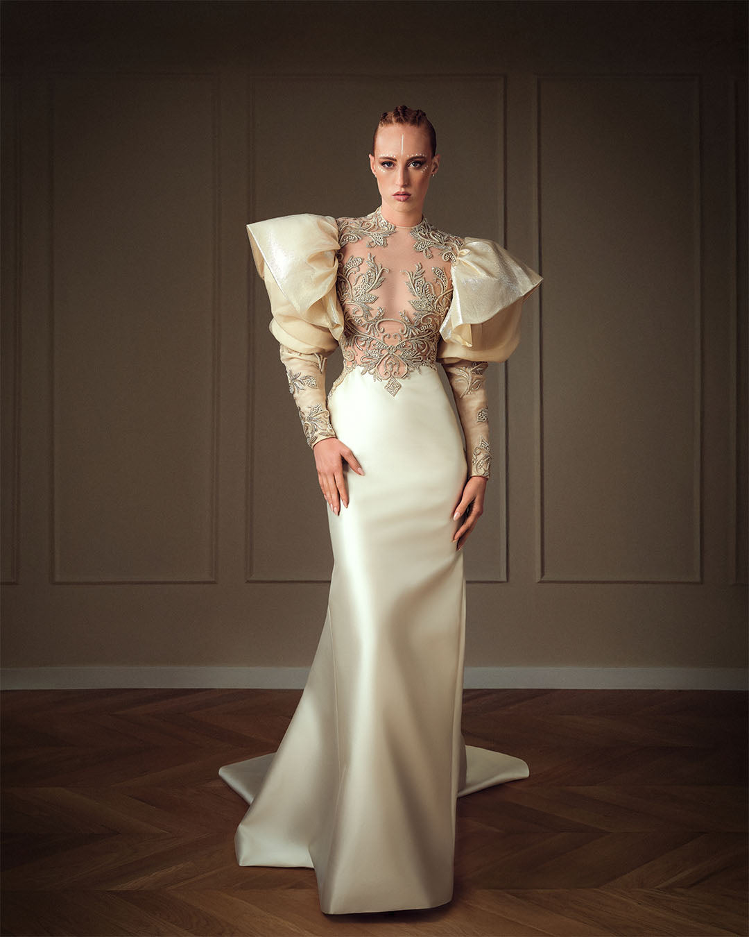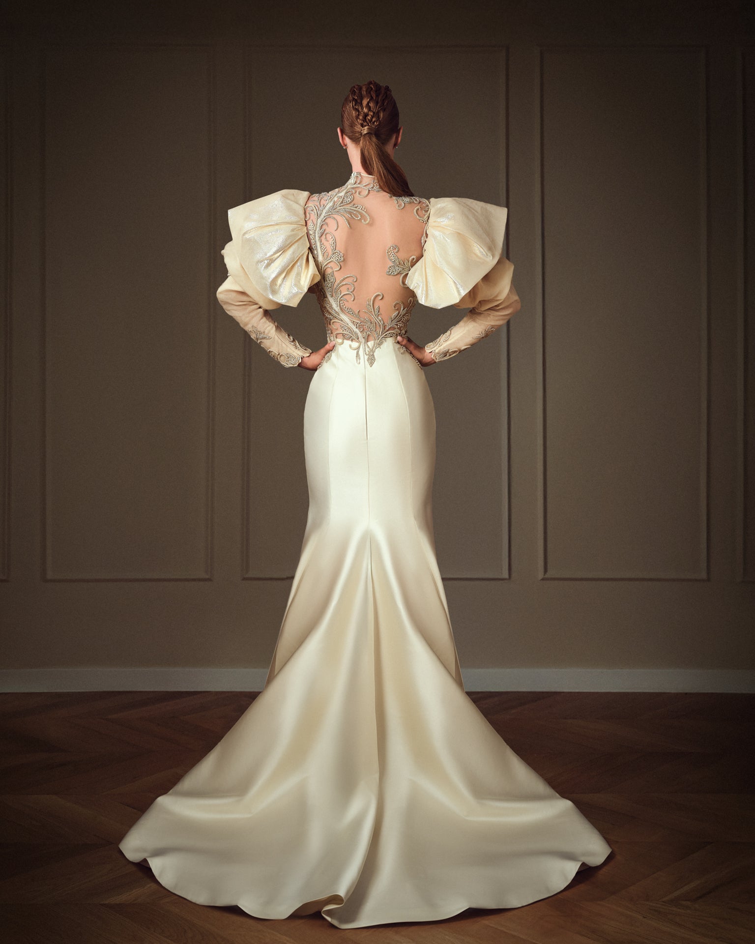 Introducing our Champagne Mikado Embroidered Dress. Crafted from luxurious champagne Mikado, the silhouette mermaid contours the body before flaring into a soft, subtle sweeping train, radiating quiet grandeur with every step.