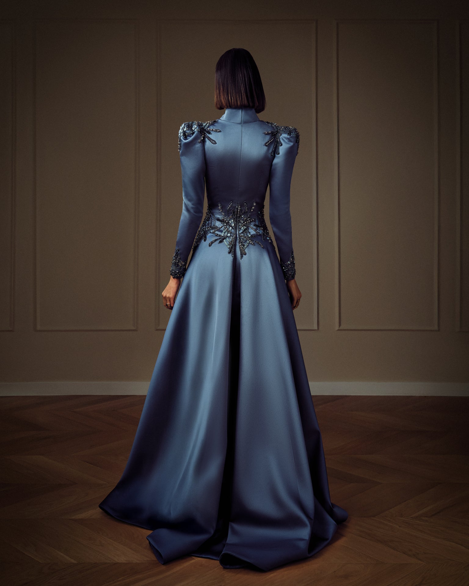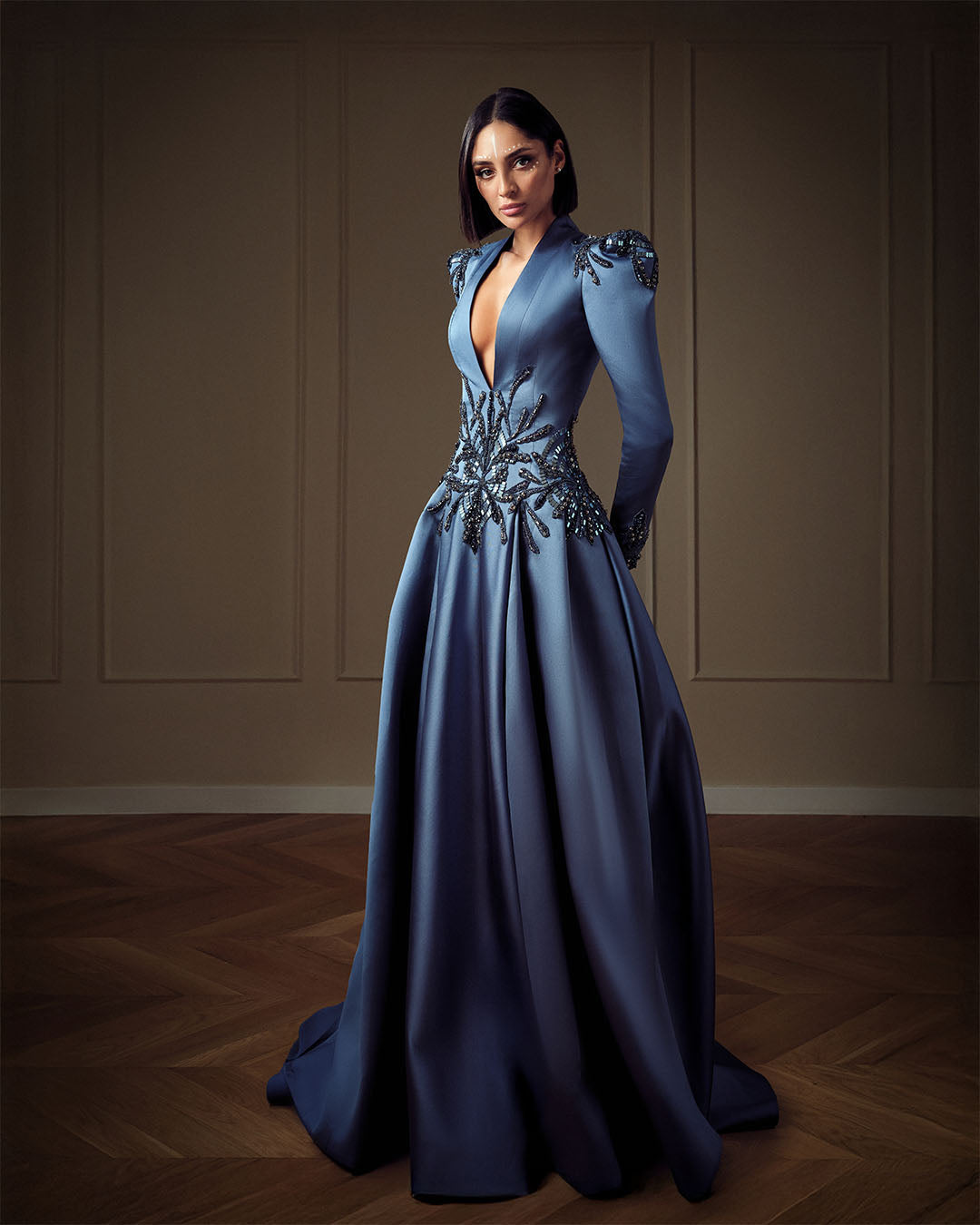 Introducing our Blue Horizon Mikado Structured Dress. This dress features a plunging V-neckline and sharply defined shoulders, creating a bold yet elegant frame. Intricate jet black bead and crystal embroidery spread out across the bodice, shoulders, and sleeves in an organic, branching motif.