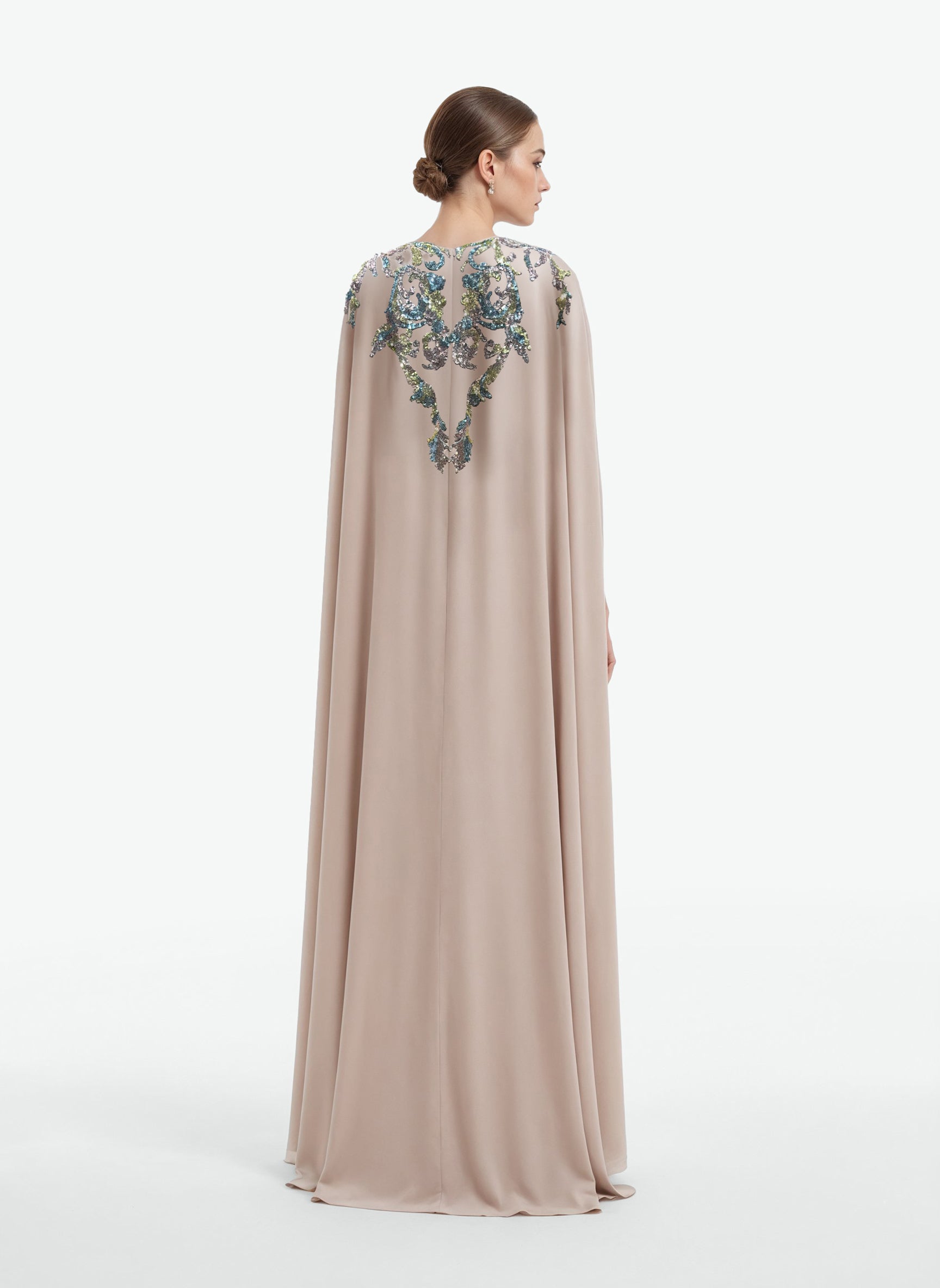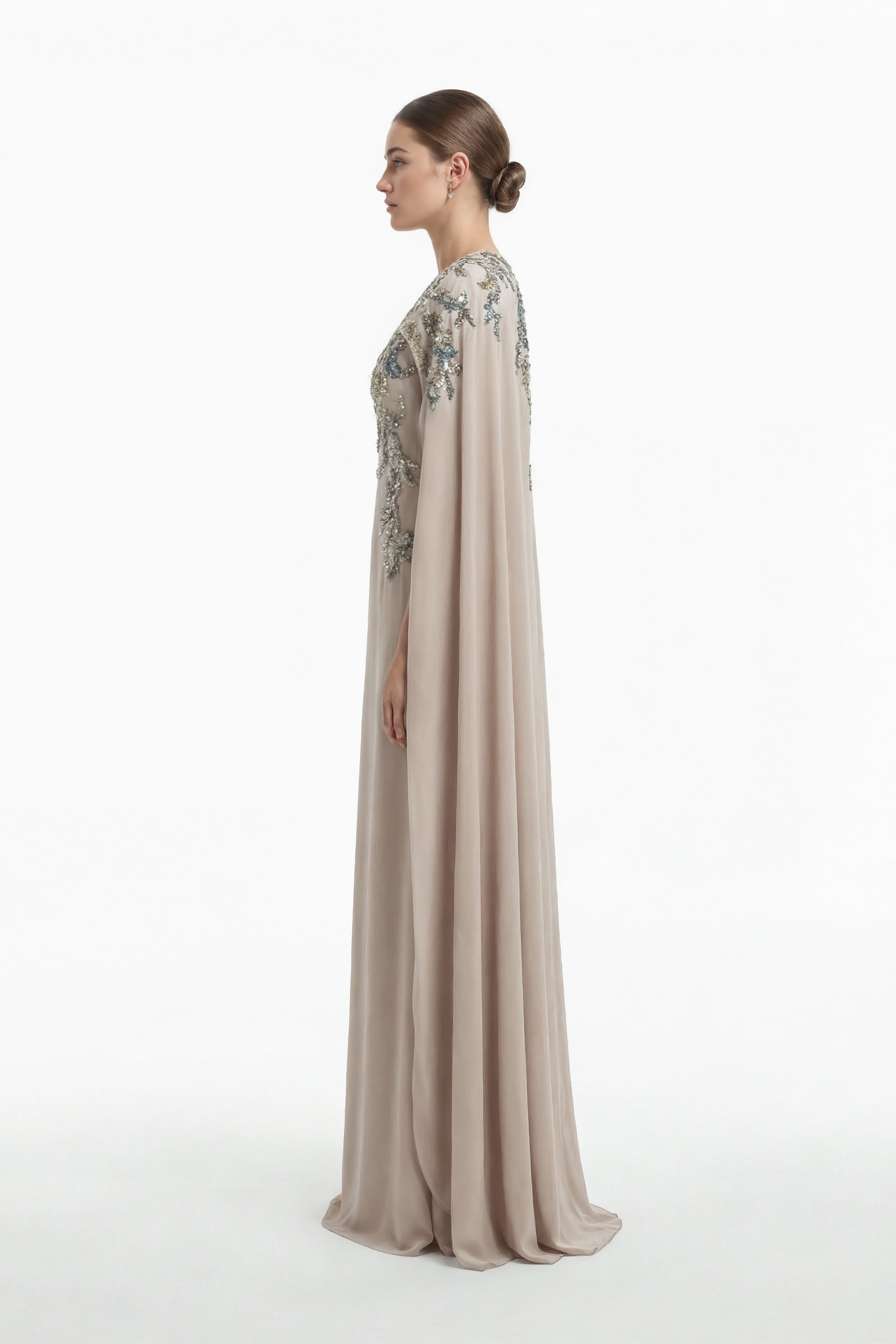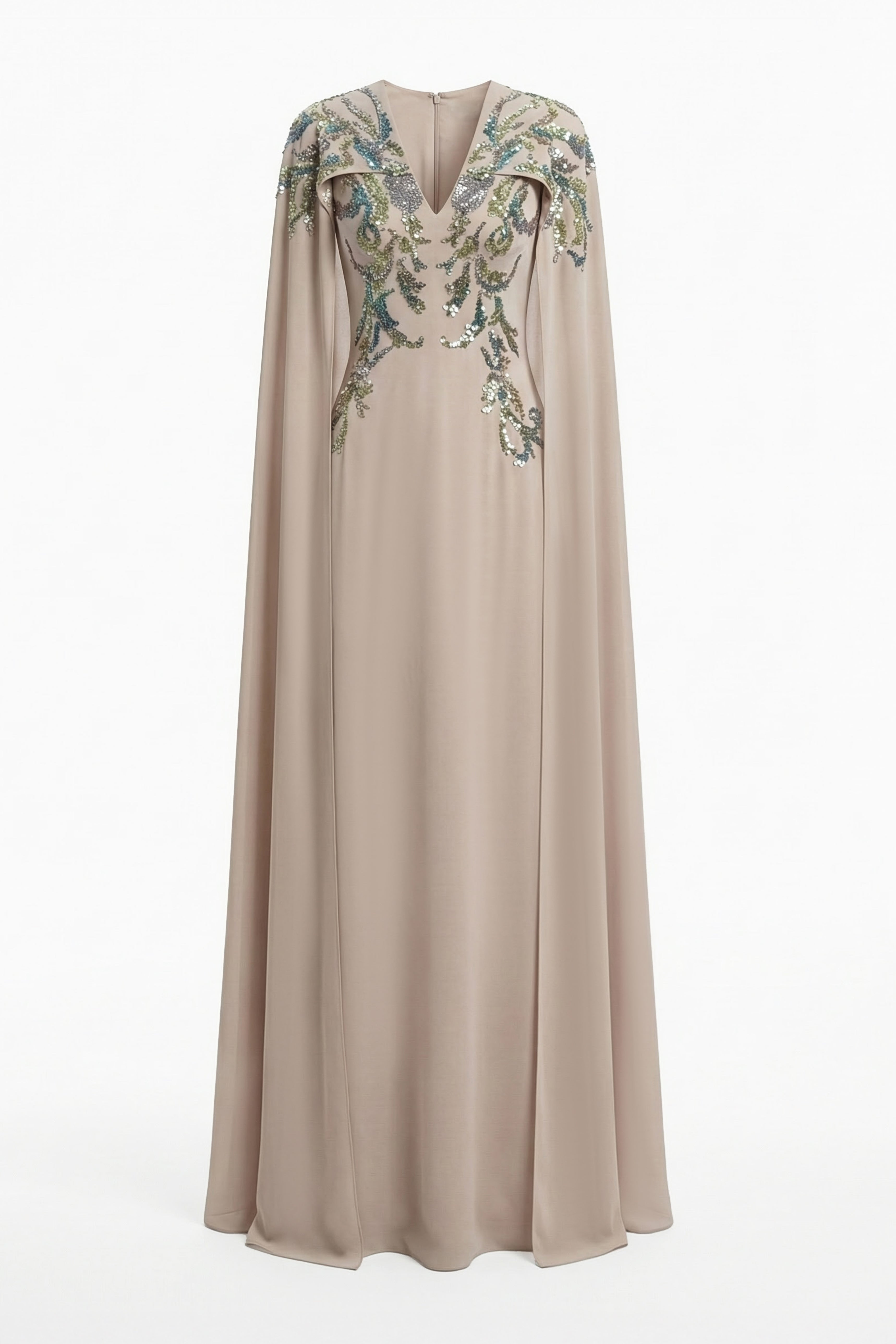 A beige rose crepe abaya featuring a V-neckline and an attached design cape. The bodice is adorned with a multicolor sequin embellishment, creating a vibrant and detailed pattern that enhances the top of the abaya.