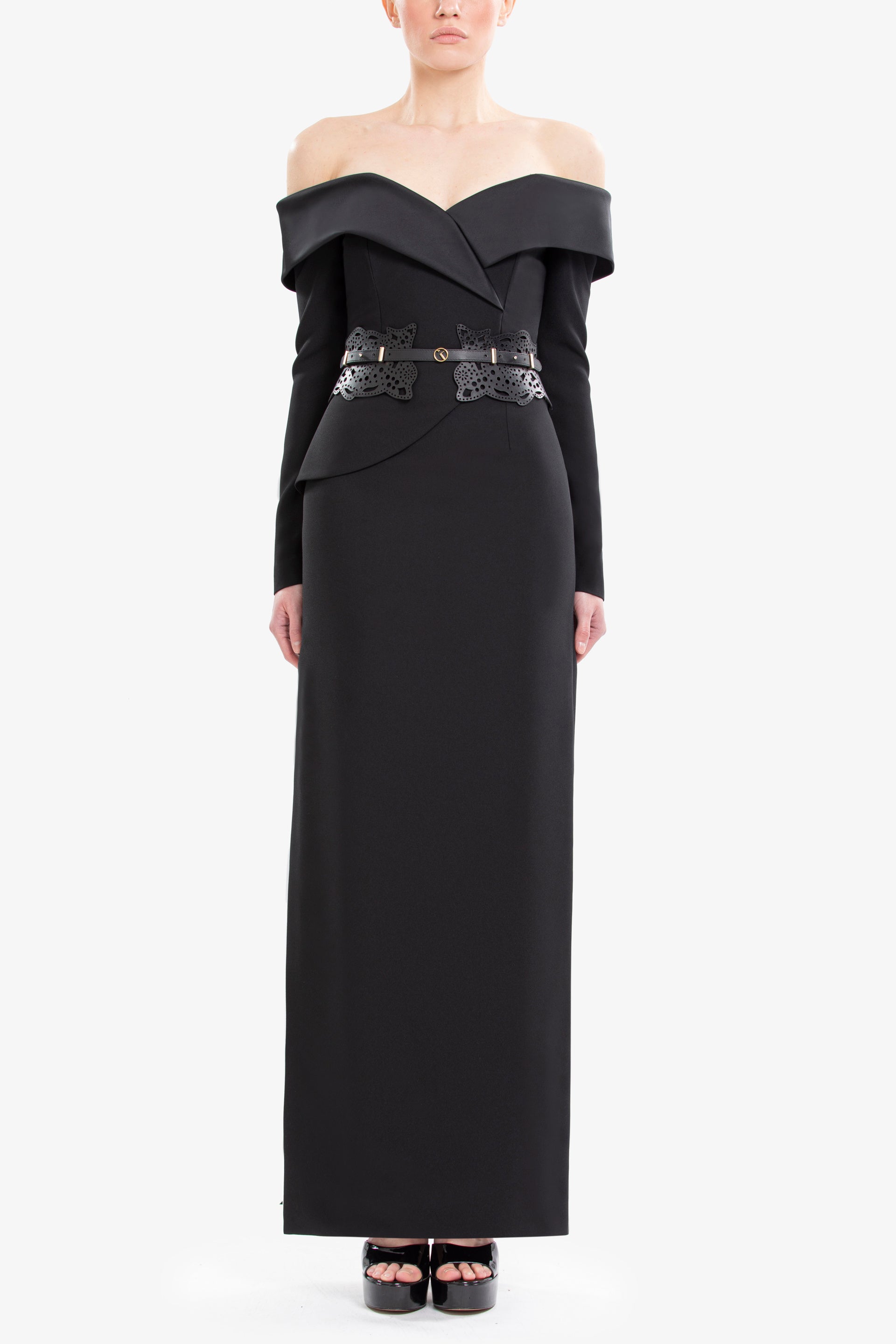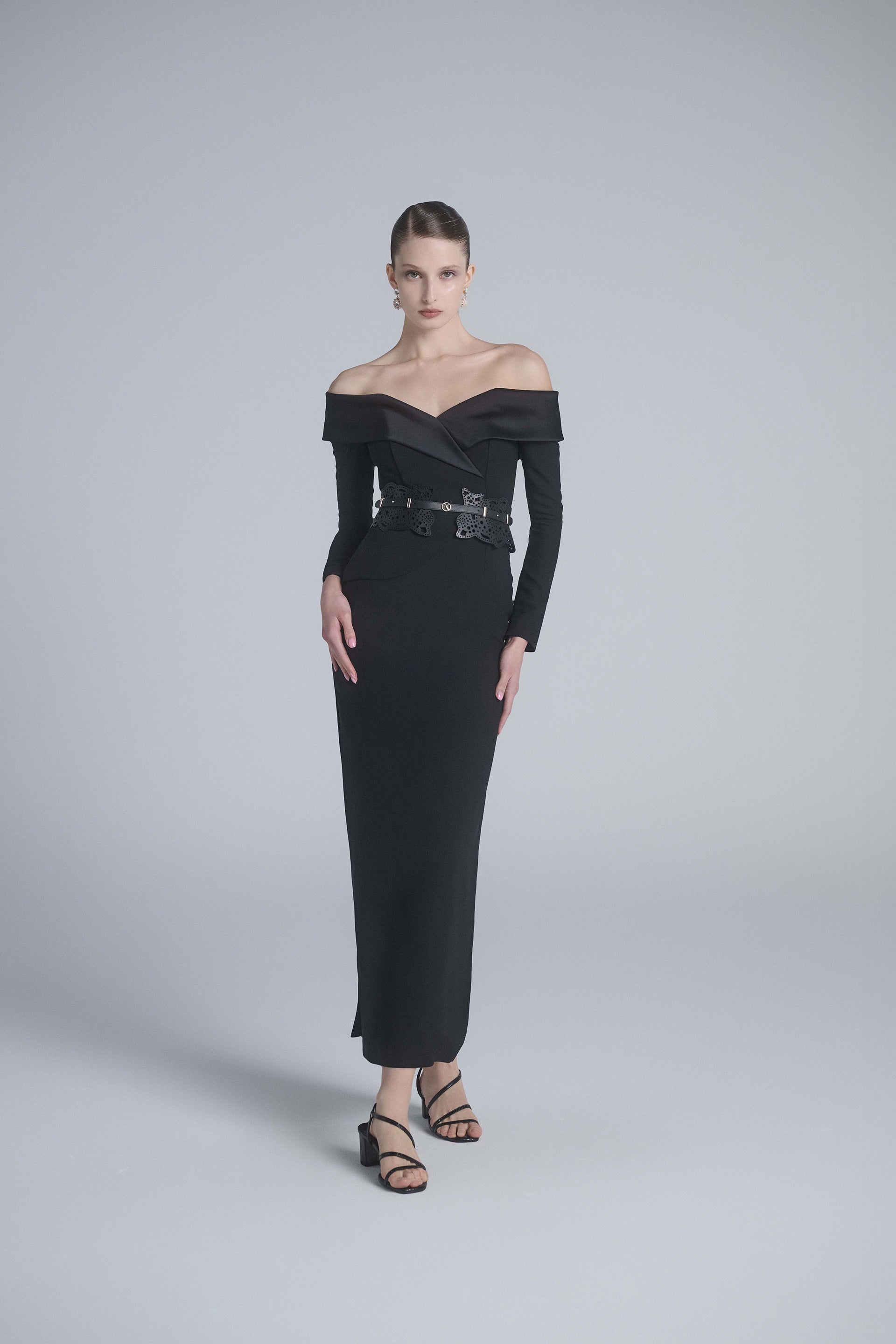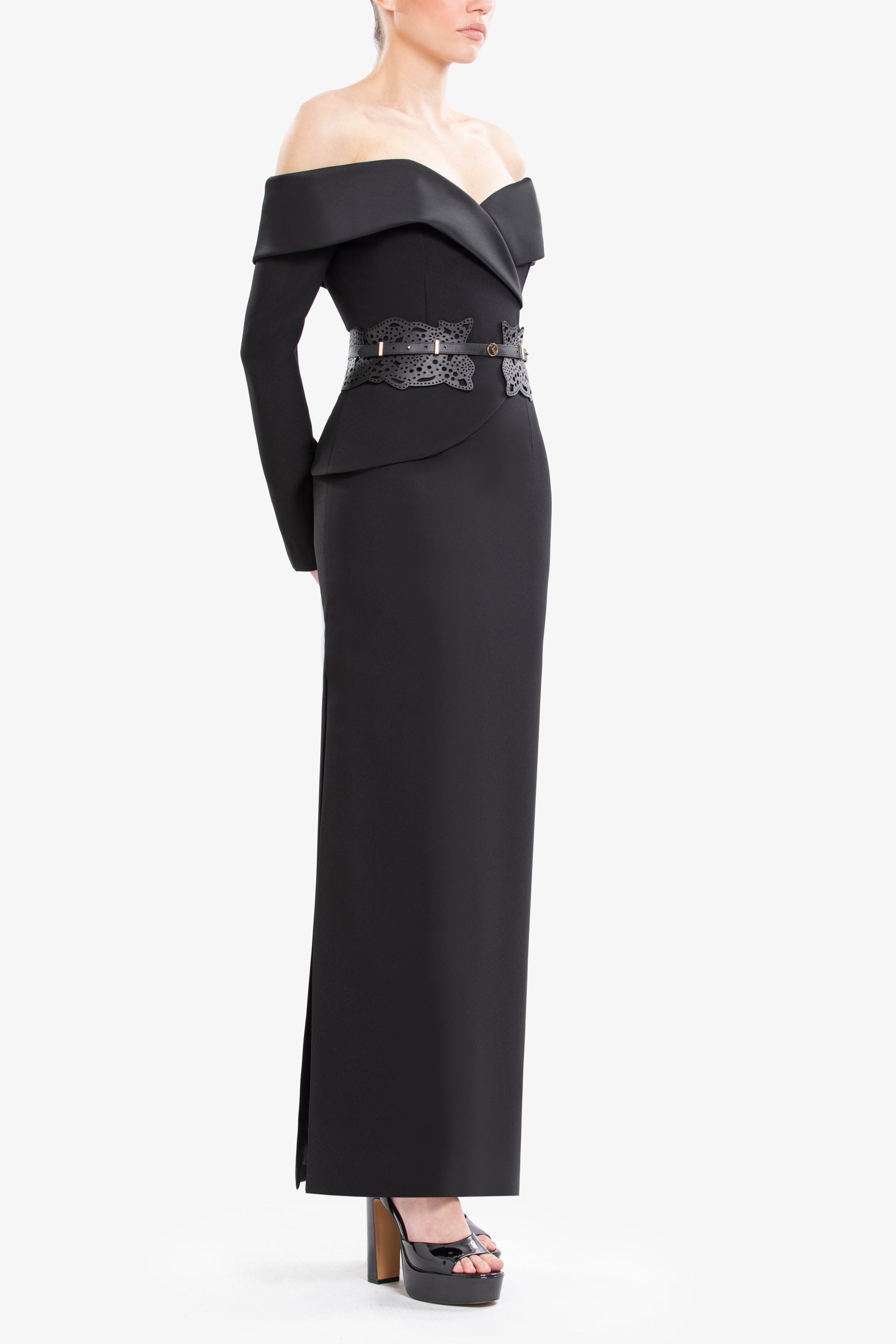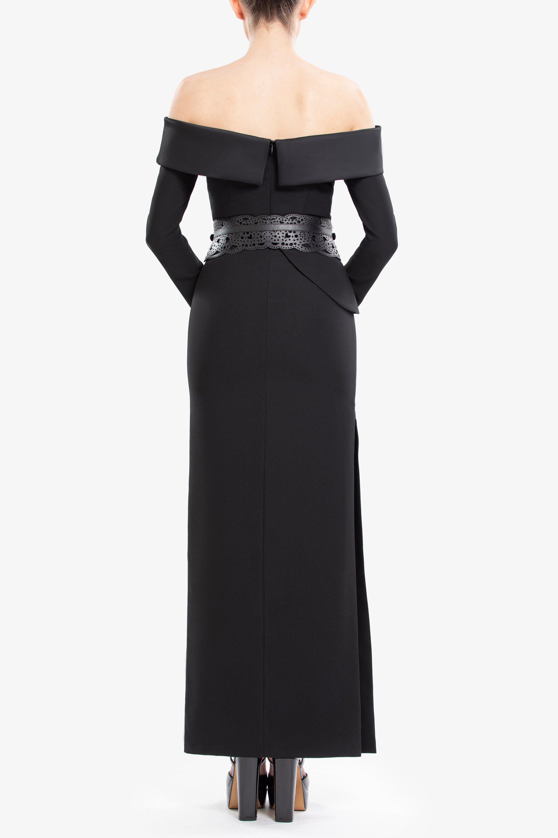 An elegant jet-black dress crafted from crepe and crepe satin, featuring an off-shoulder neckline, long sleeves, and a straight-cut midi-length skirt. It is paired with a matching 100% perforated leather SK belt.