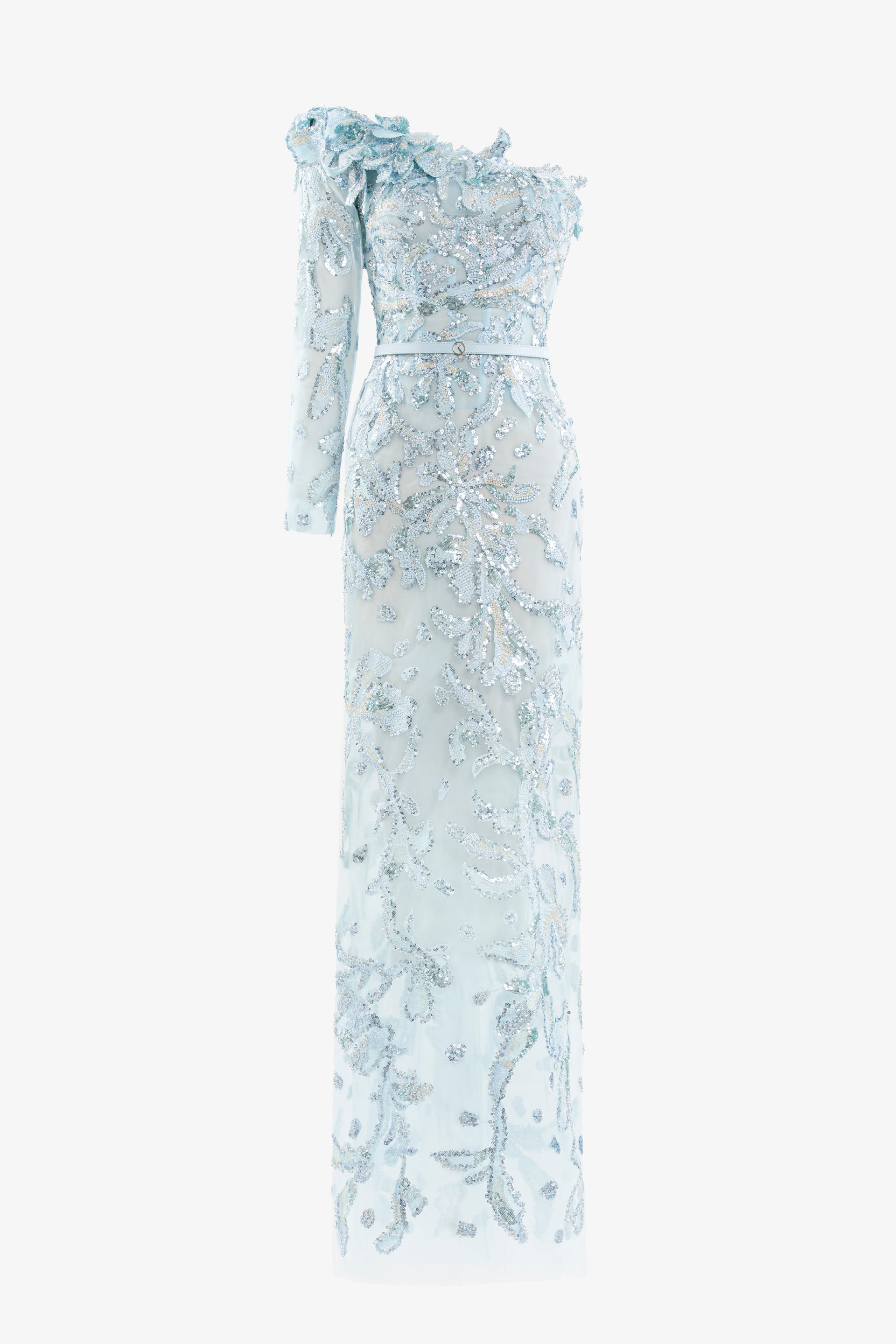 An Ice blue one-shoulder fitted embroidered tulle dress, fully adorned with intricate embroidery. Featuring one long sleeve and a floor-length silhouette, the dress is beautifully accented with 3D embroidery on the neckline. It is paired with a matching 100% leather SK belt.