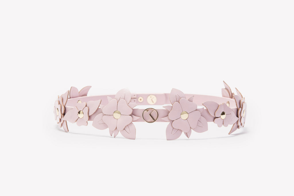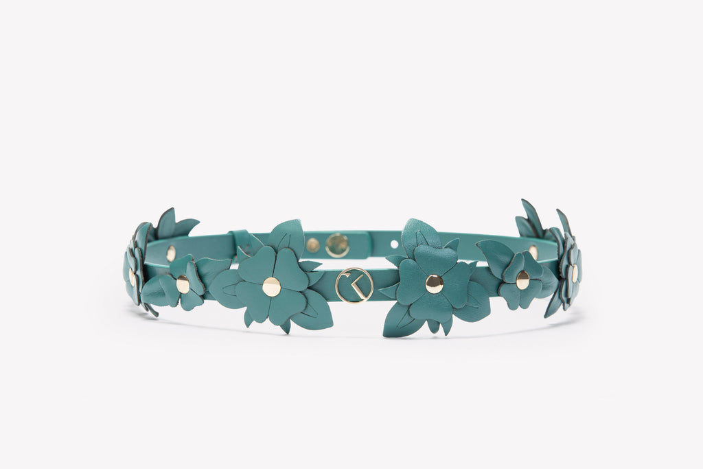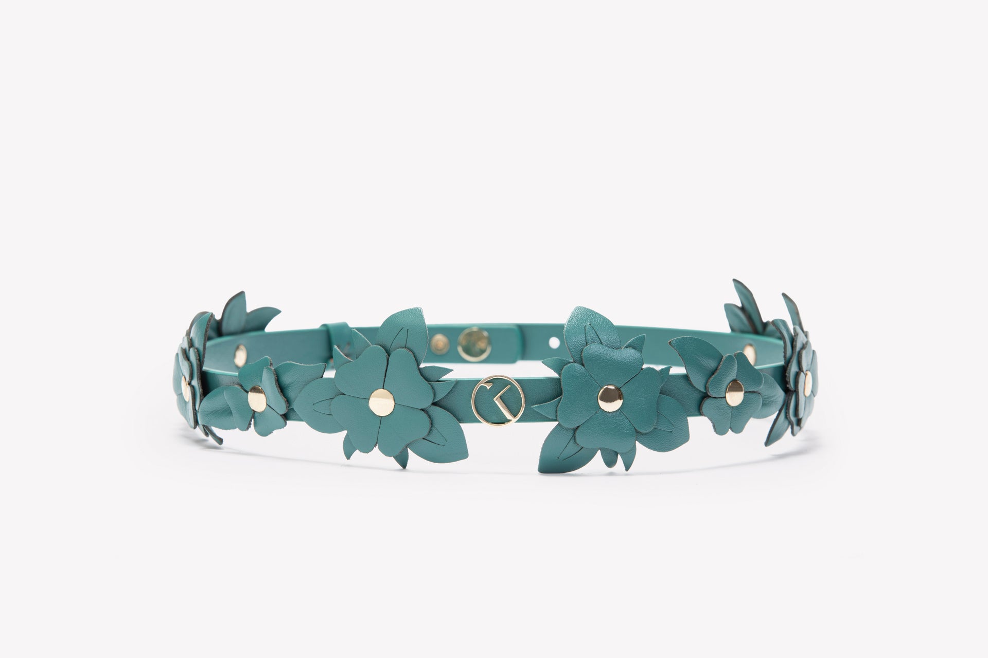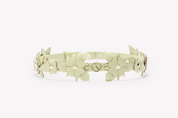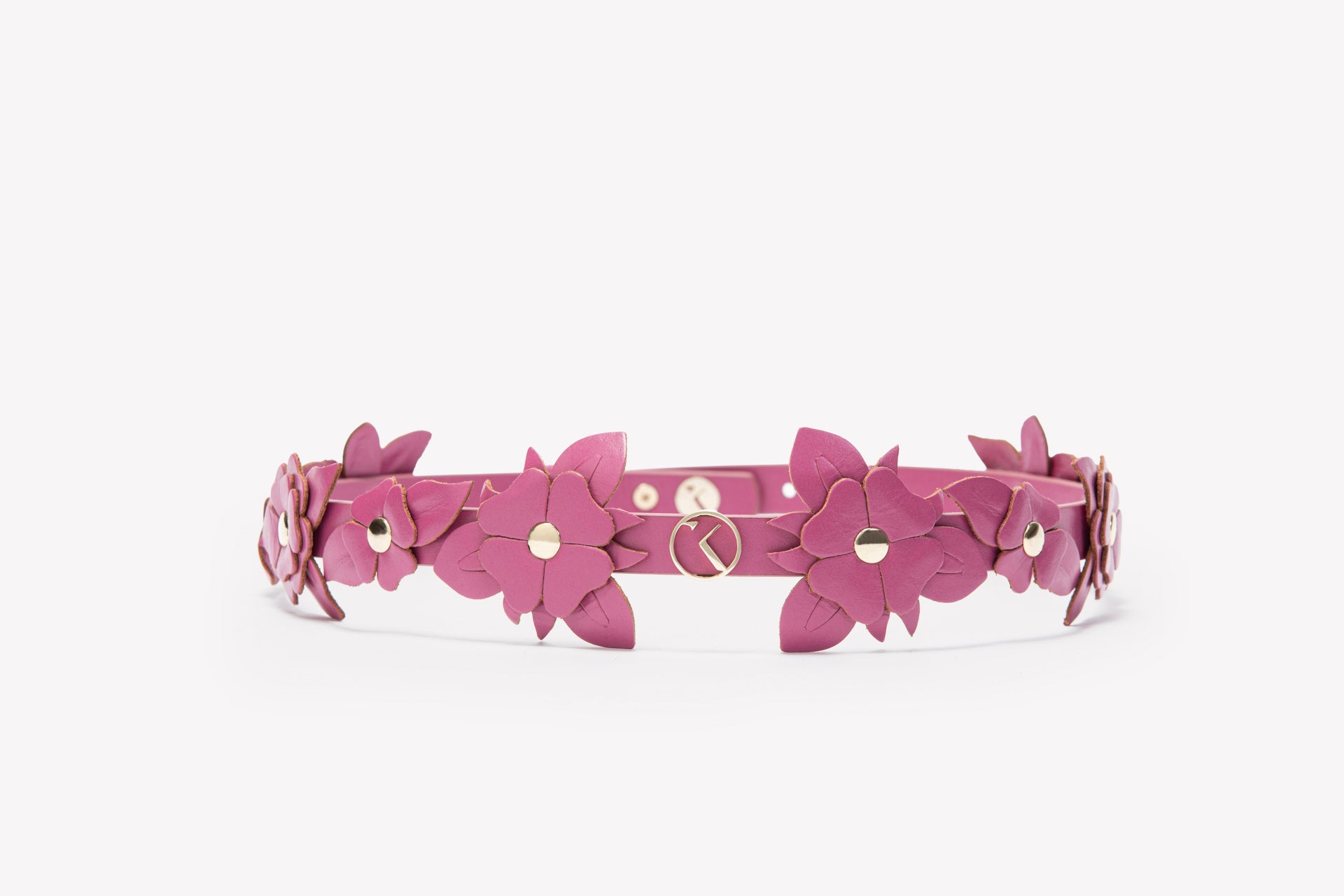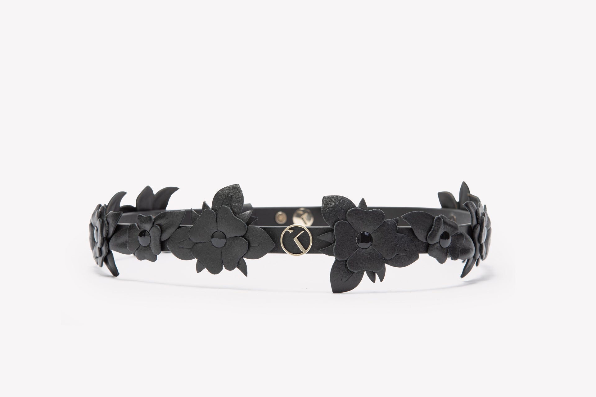 Elevate your wardrobe with our leather belt, adorned with sculpted floral leather appliqués for a touch of sophistication.