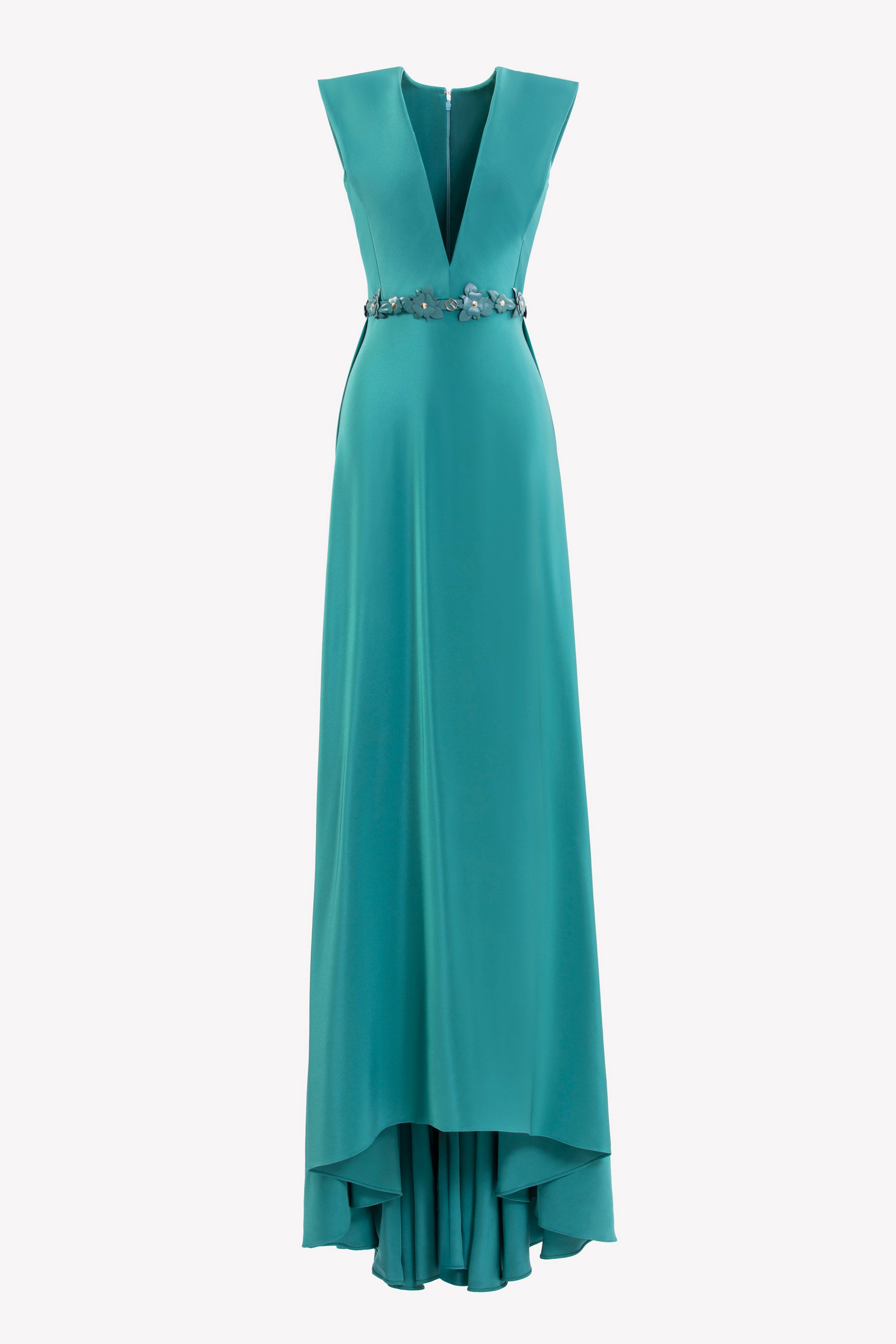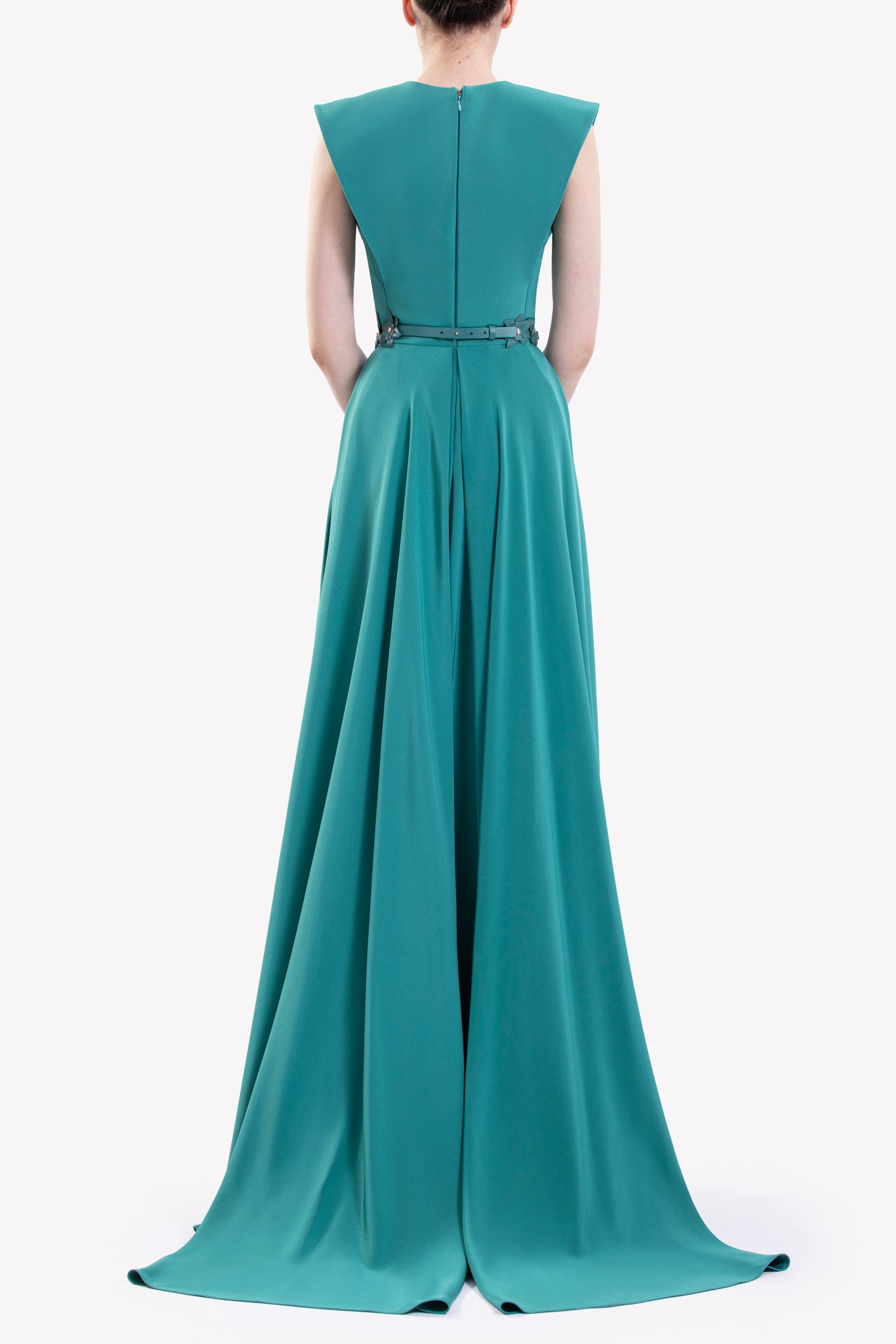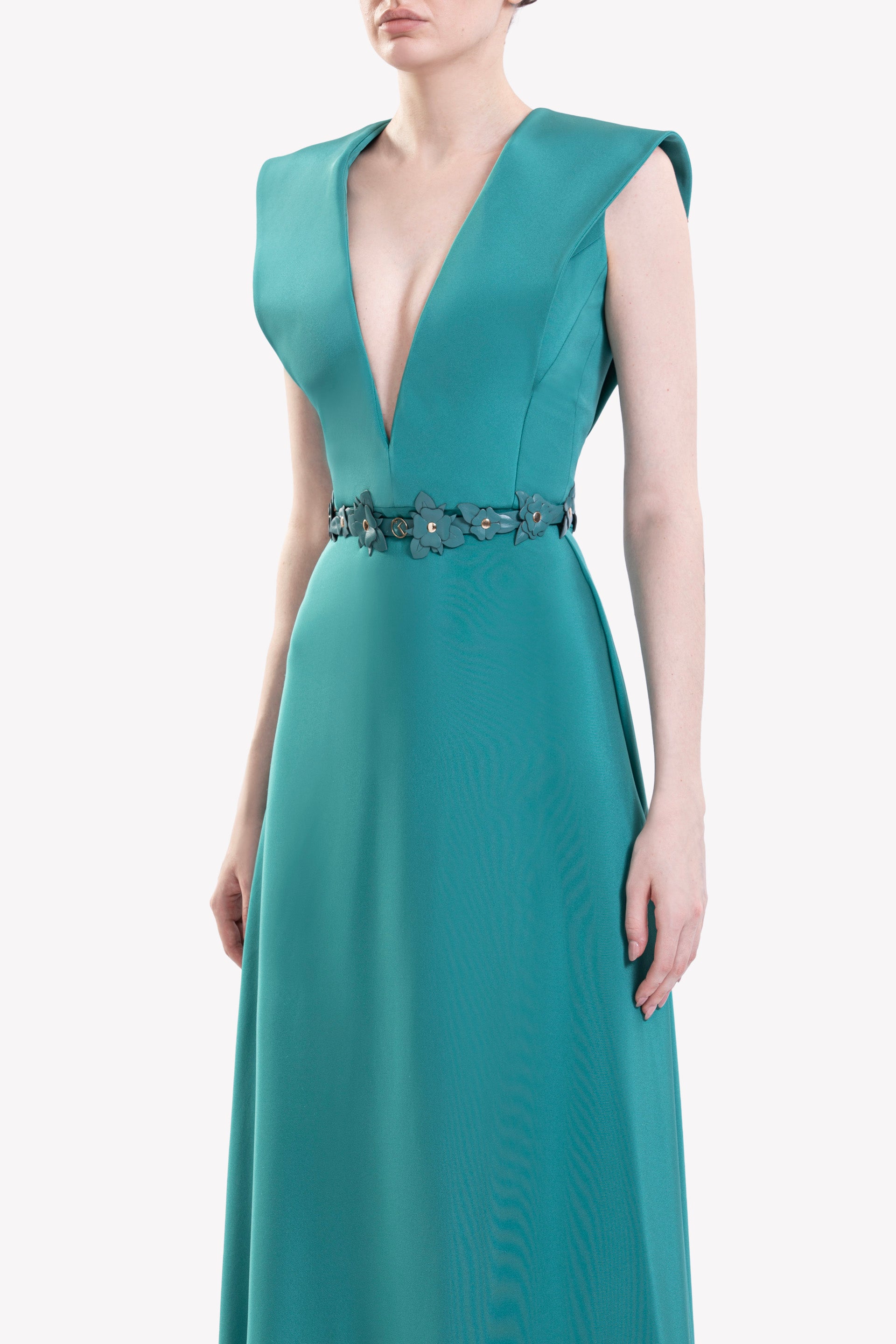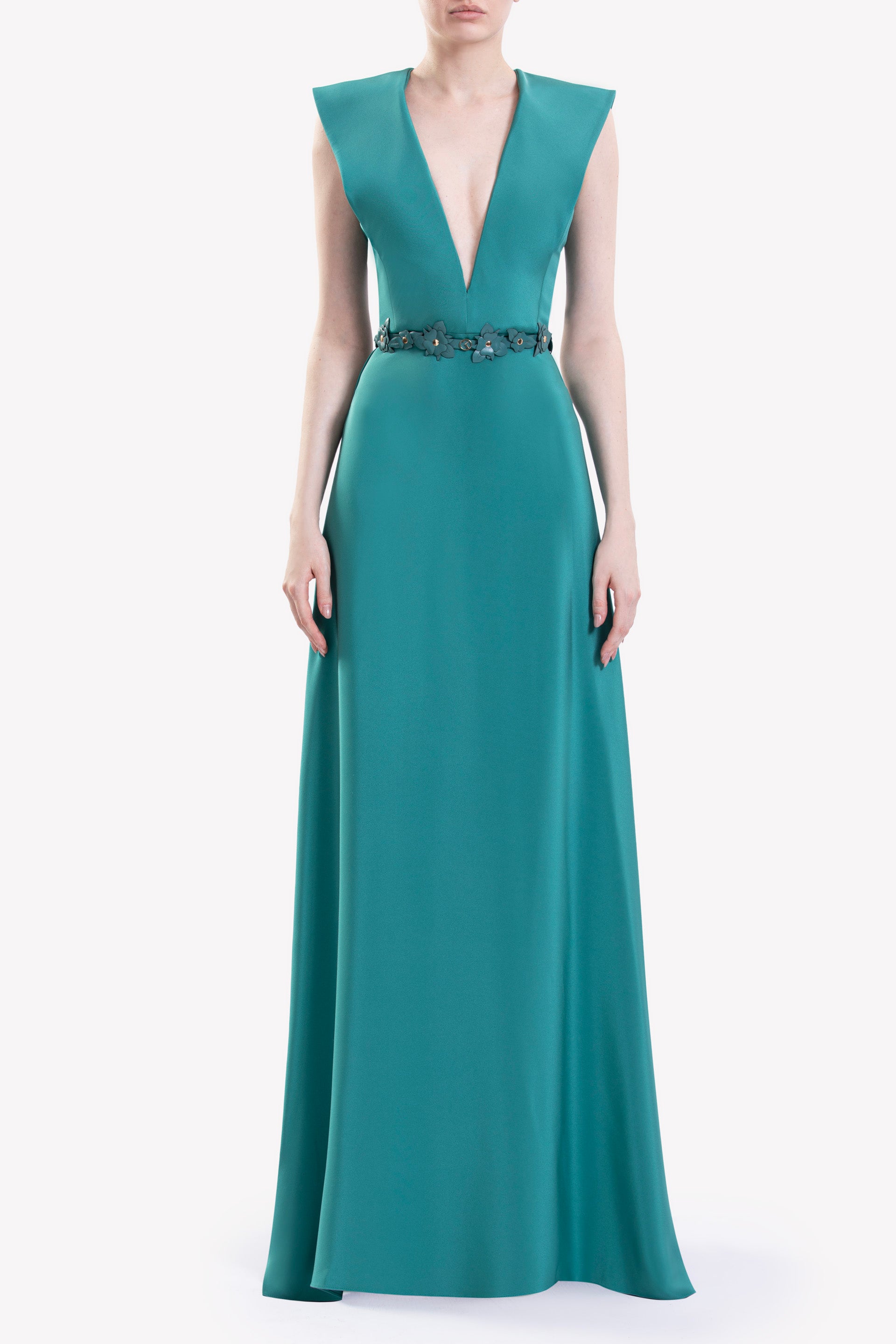 North Sea crepe dress with bold shoulder lines and a plunging Vneckline. Fitted waist flows into a floor-length skirt