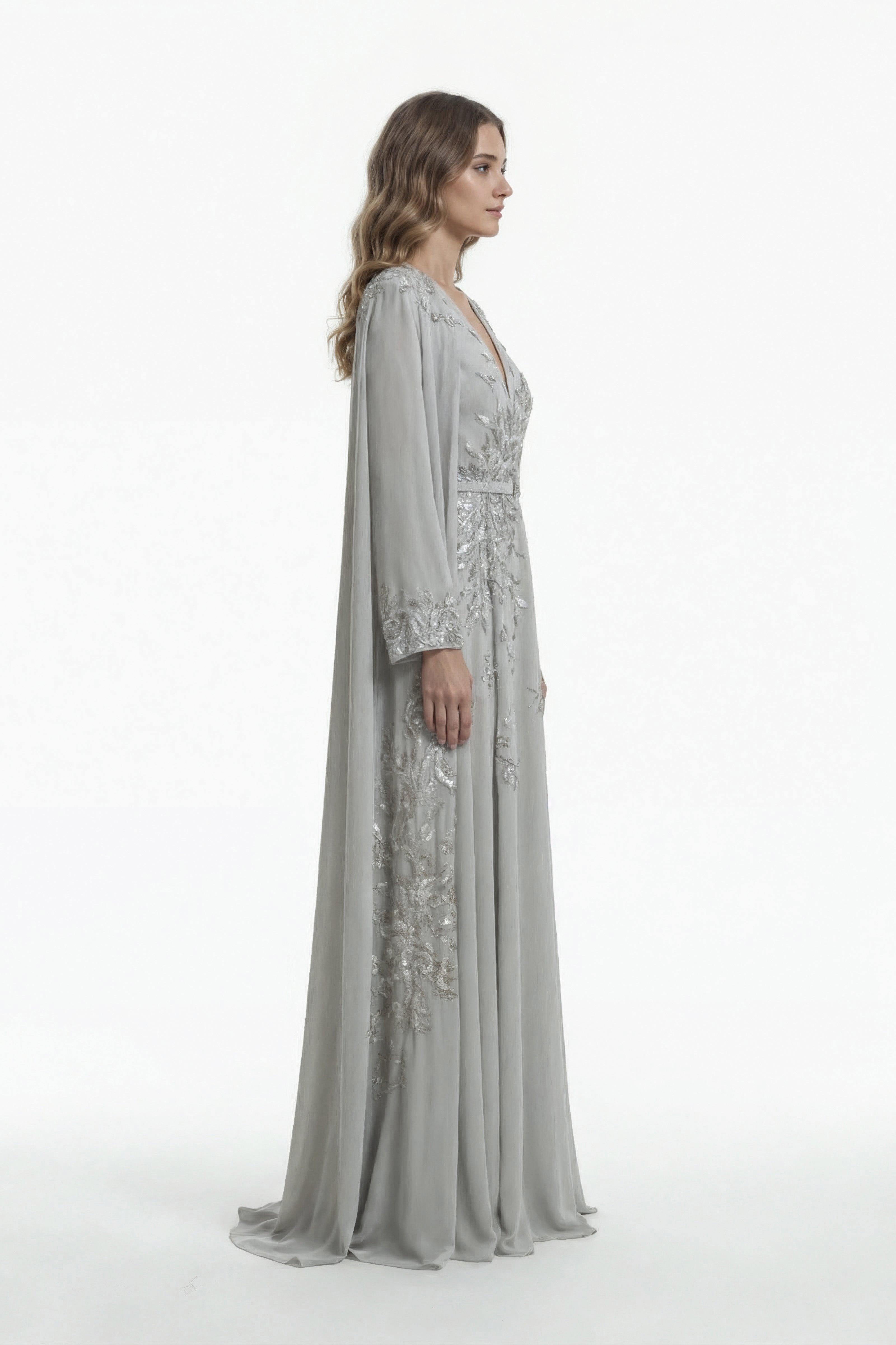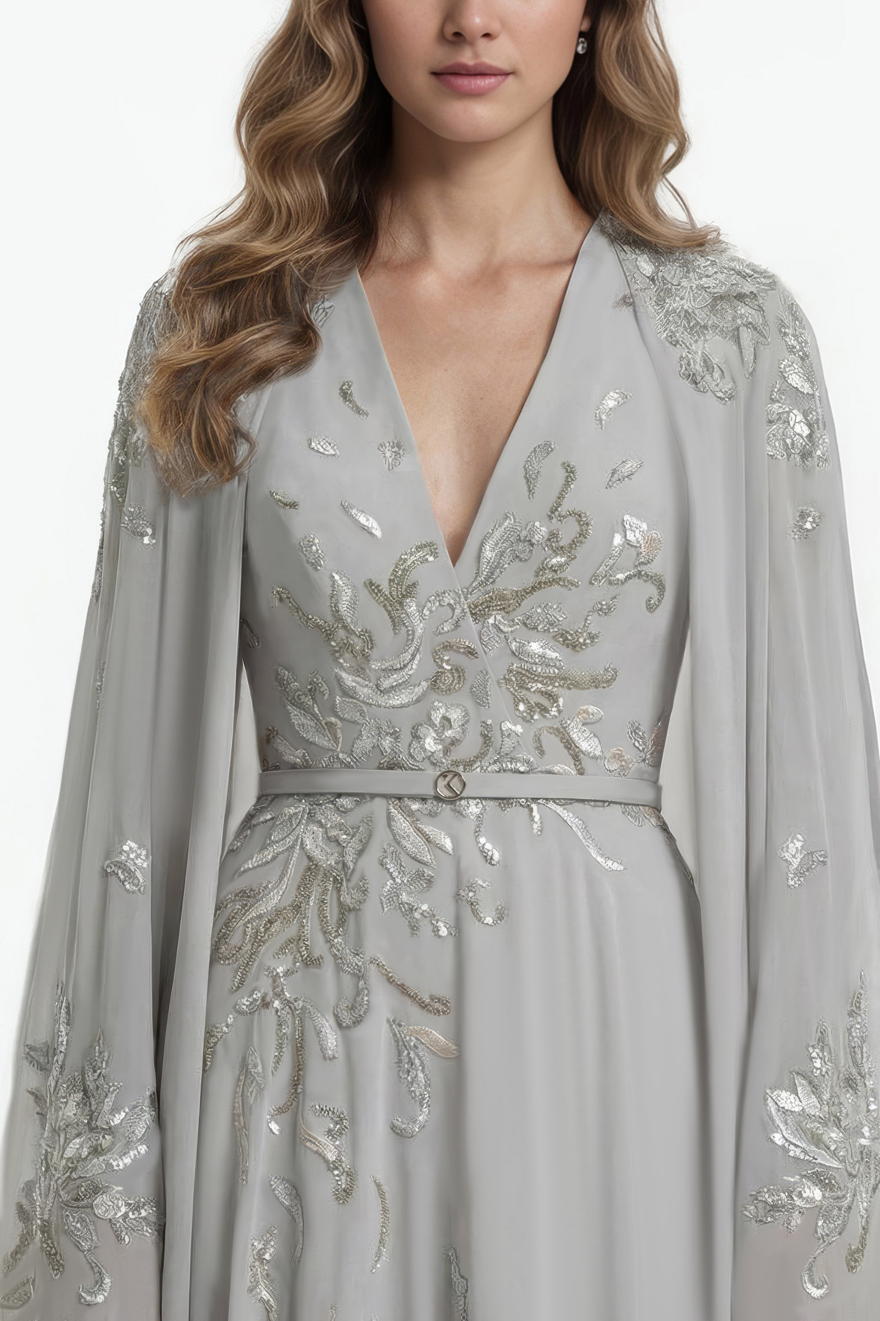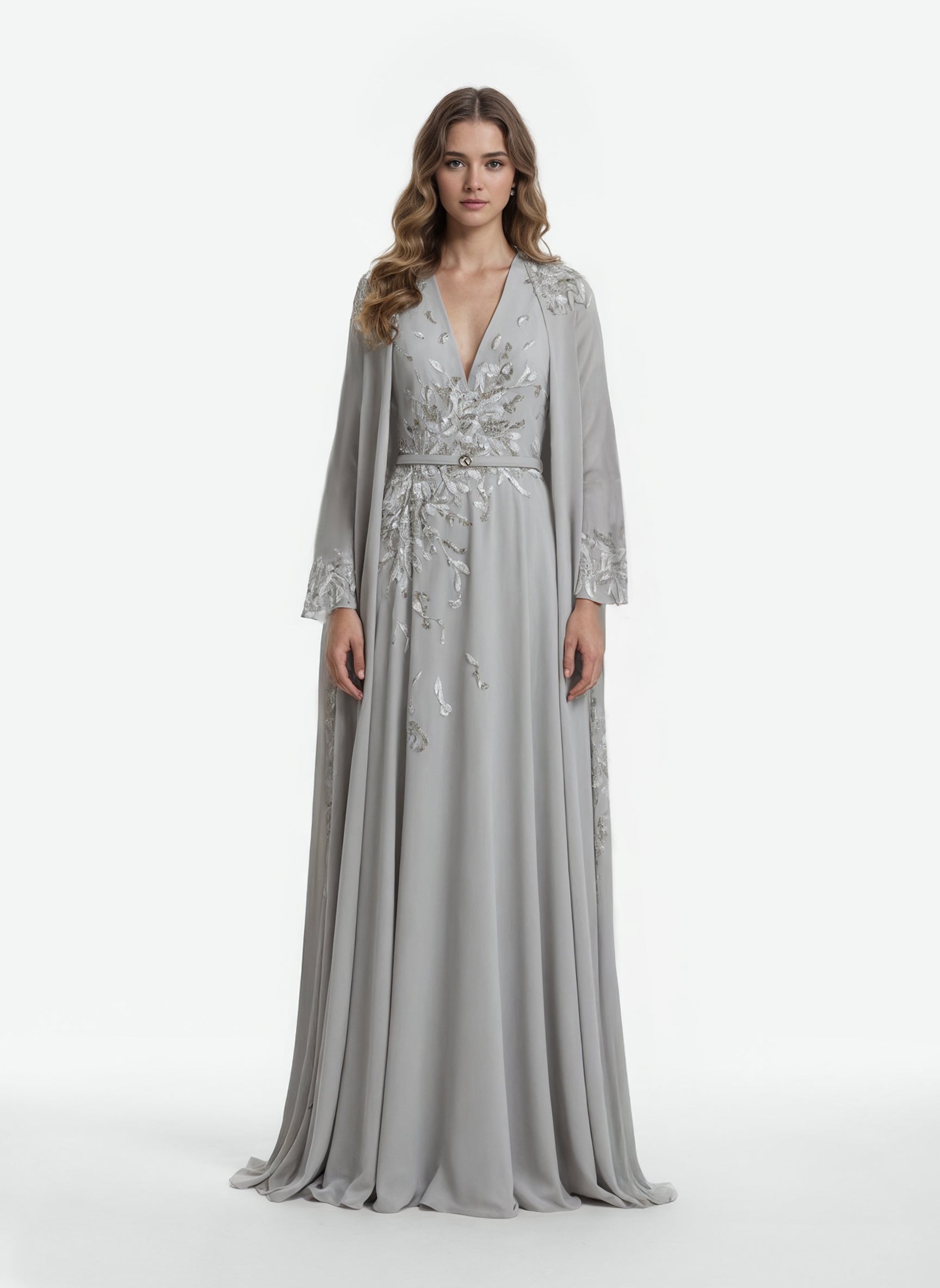 Grey dress featuring a plunging V-neckline and a floor-length, flowing silhouette. The design is adorned with intricate silver embroidery in organic, vine-like patterns that accentuate the bodice, sleeves, and skirt. Long sleeves create a cape-like effect, adding movement and elegance. Finished with a subtle SK logo belt.