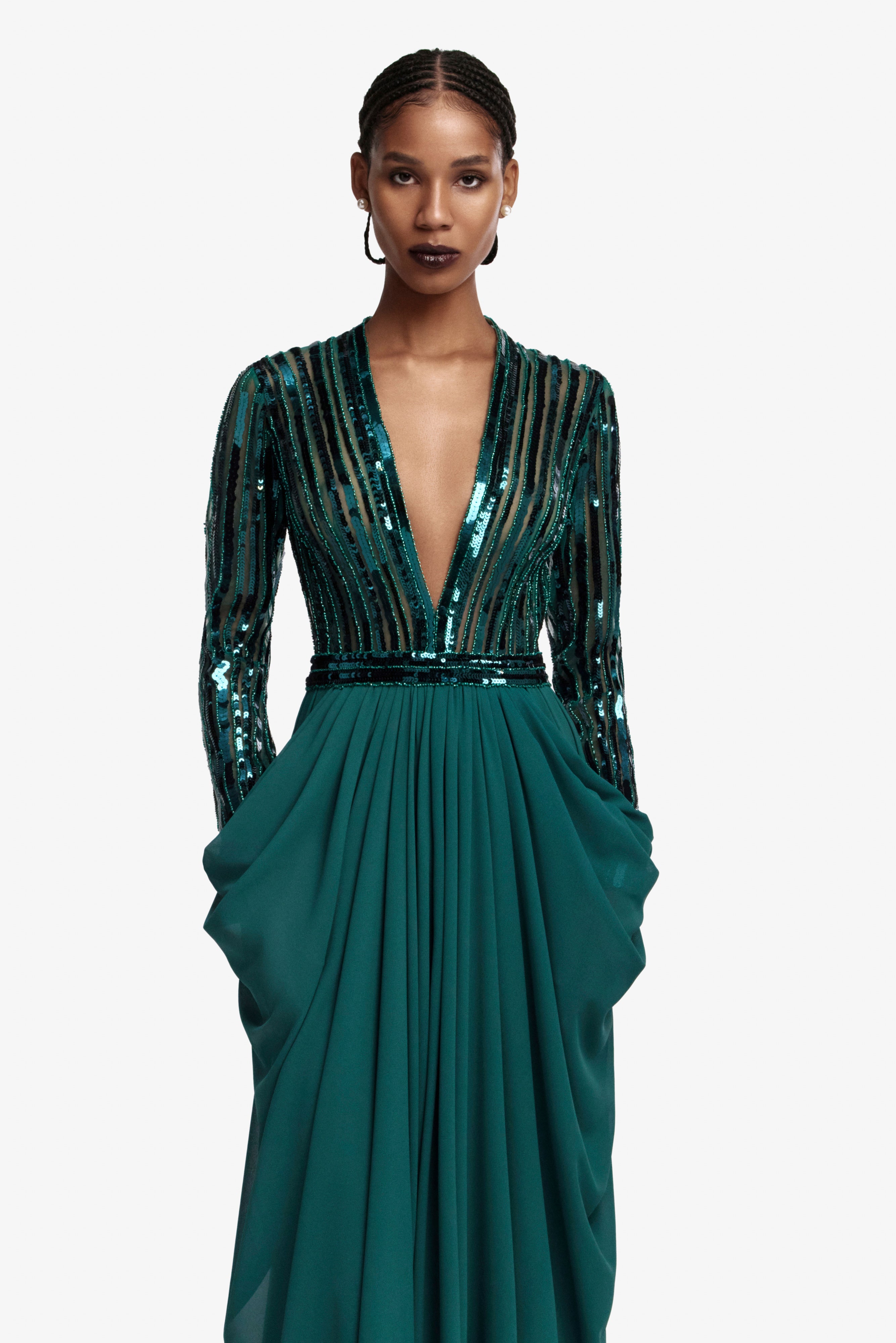 The green dress features long sleeves, fully adorned with sequins, and boasts a deep V neckline for a touch of allure. Its crepe georgette skirt is elegantly draped and falls to a midi length.