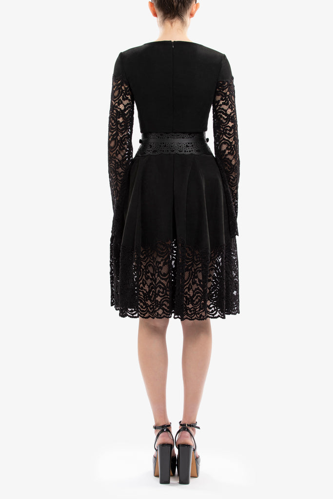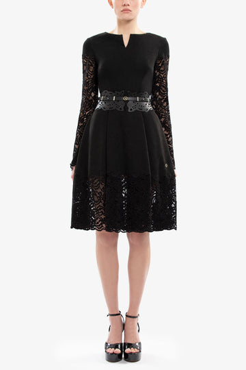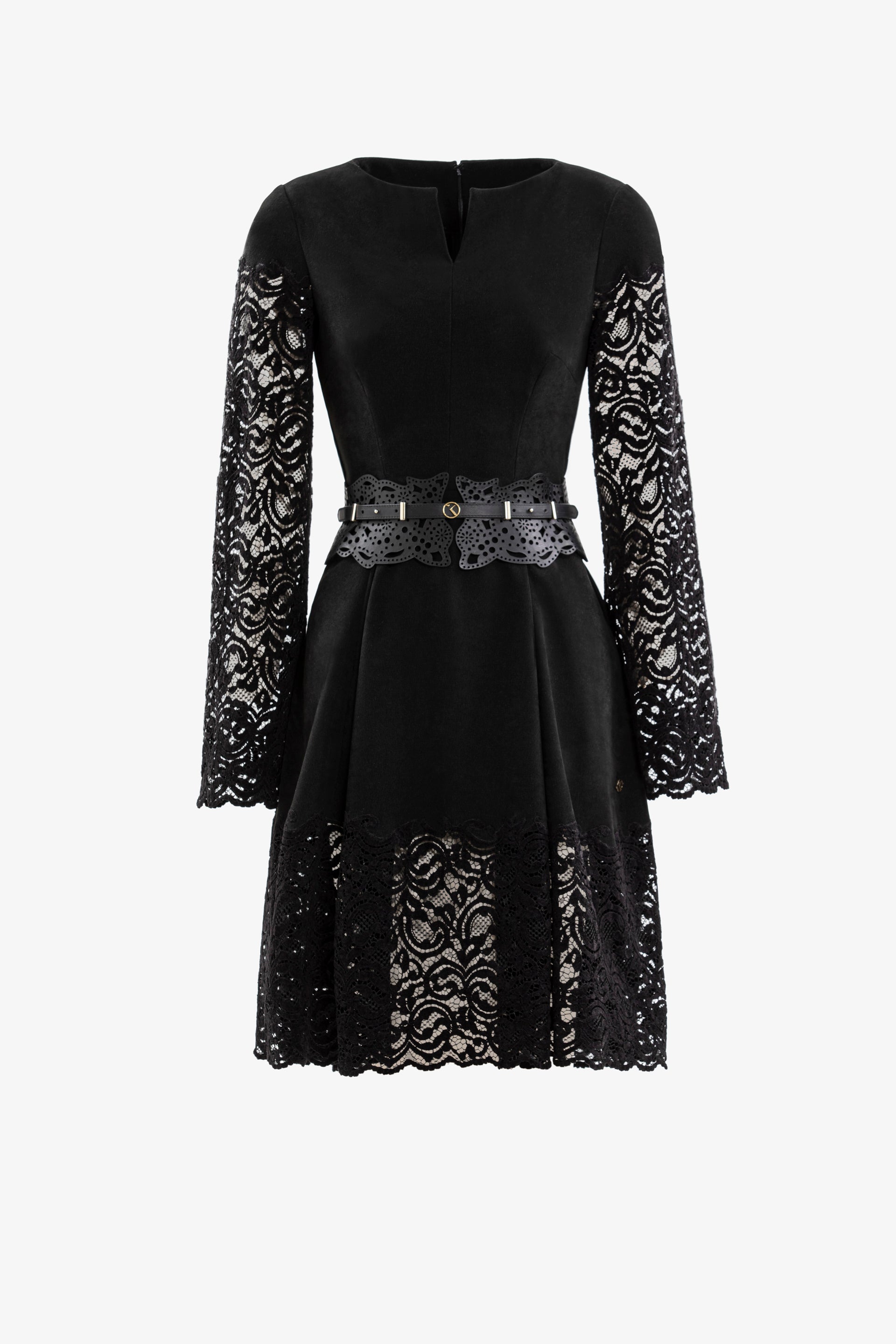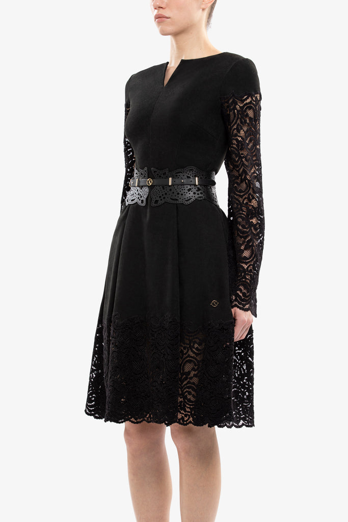 Short jet black lace dress with delicate lace detailing on the sleeves and skirt hemline, paired with a perforated 100% leather SK belt.