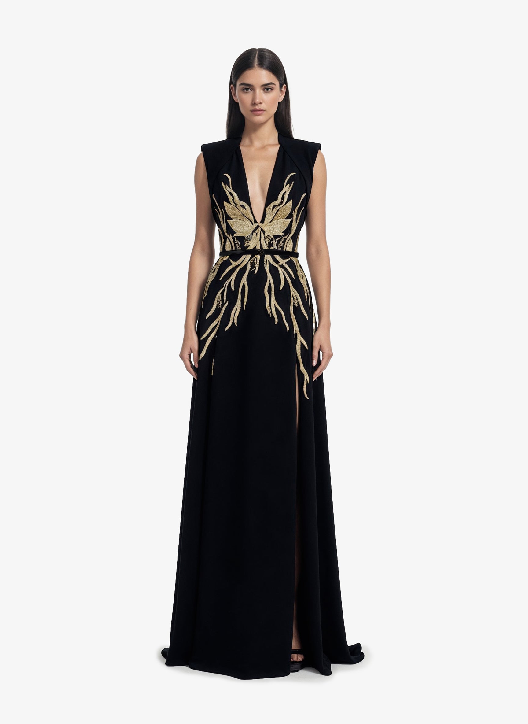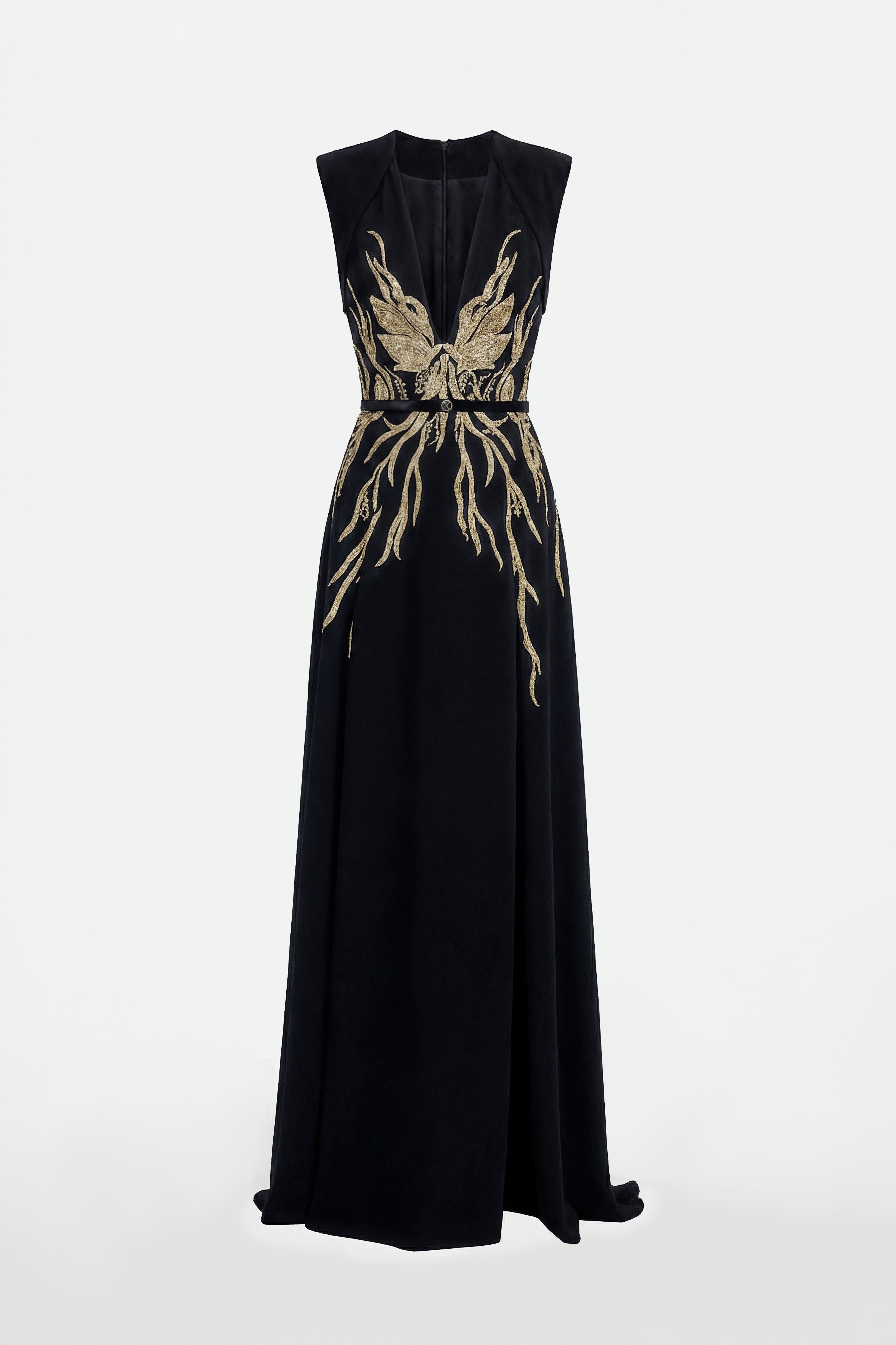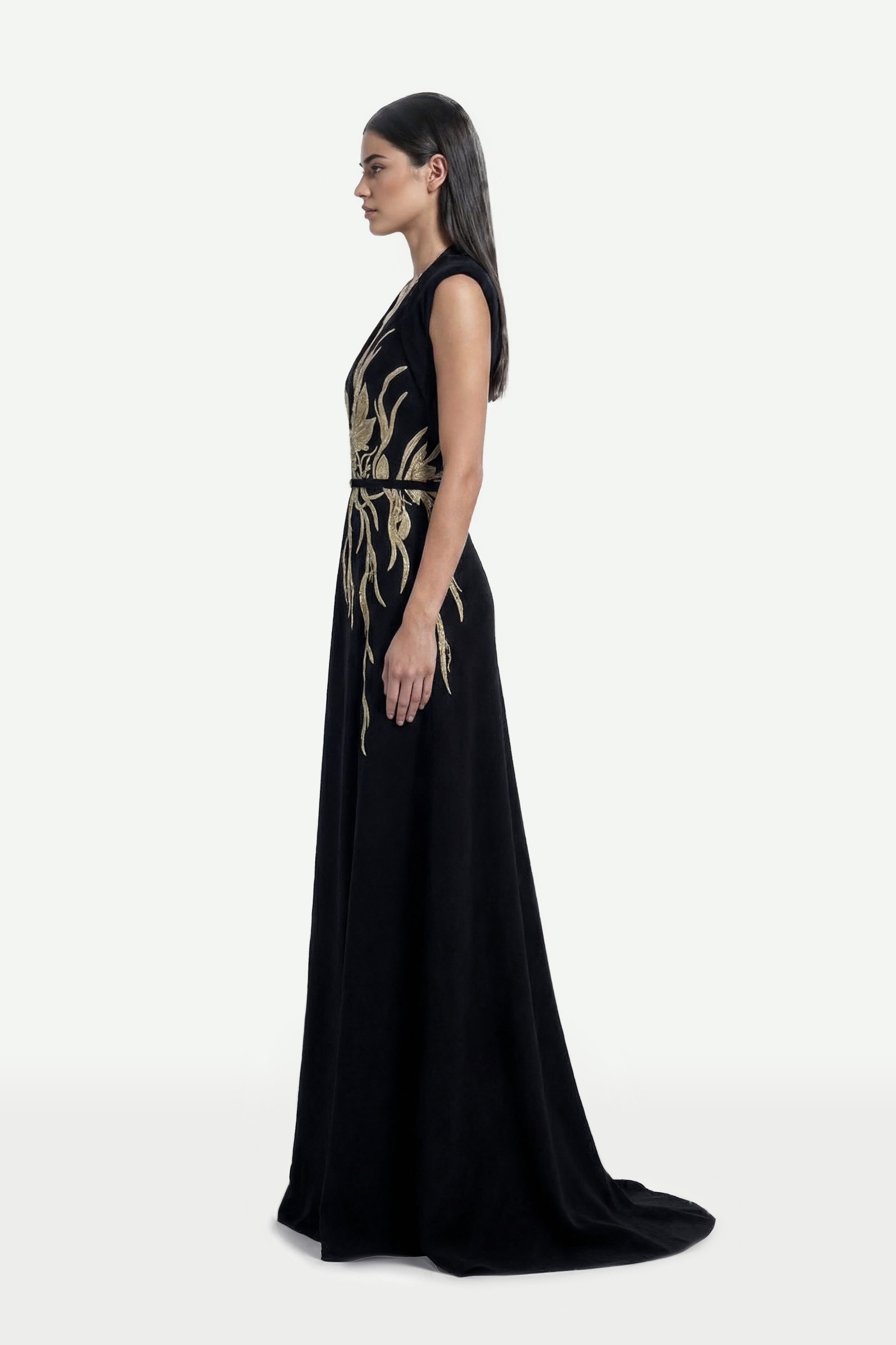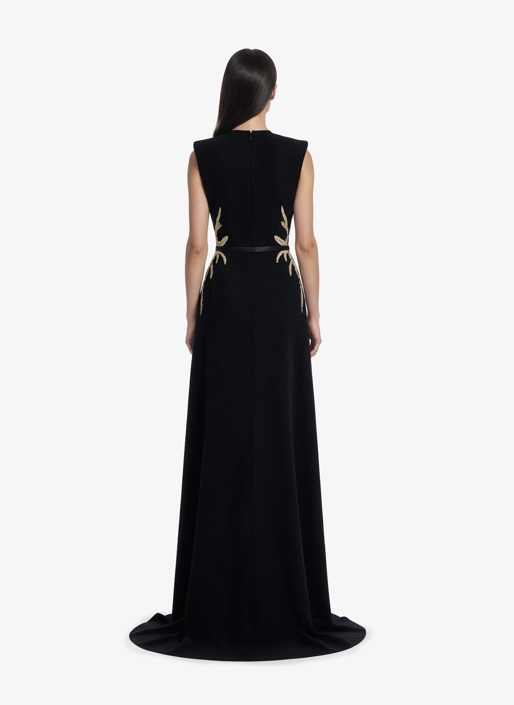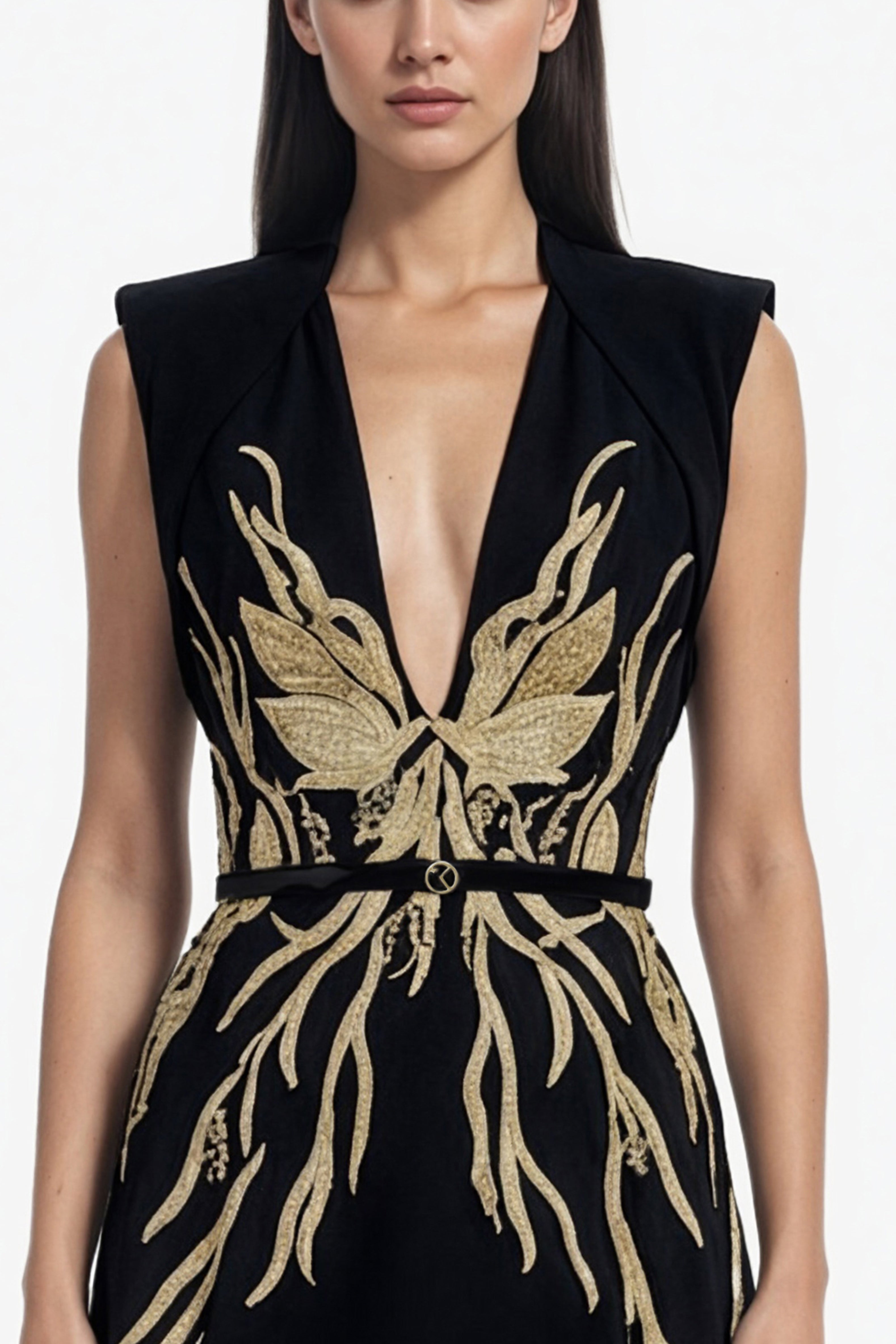 A jet-black structured crepe dress, featuring intricate gold-thread embroidery extending from the bodice to the hips. The sculpted silhouette highlights a refined elegance, blending architectural tailoring with delicate embellishments.