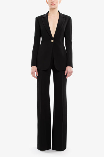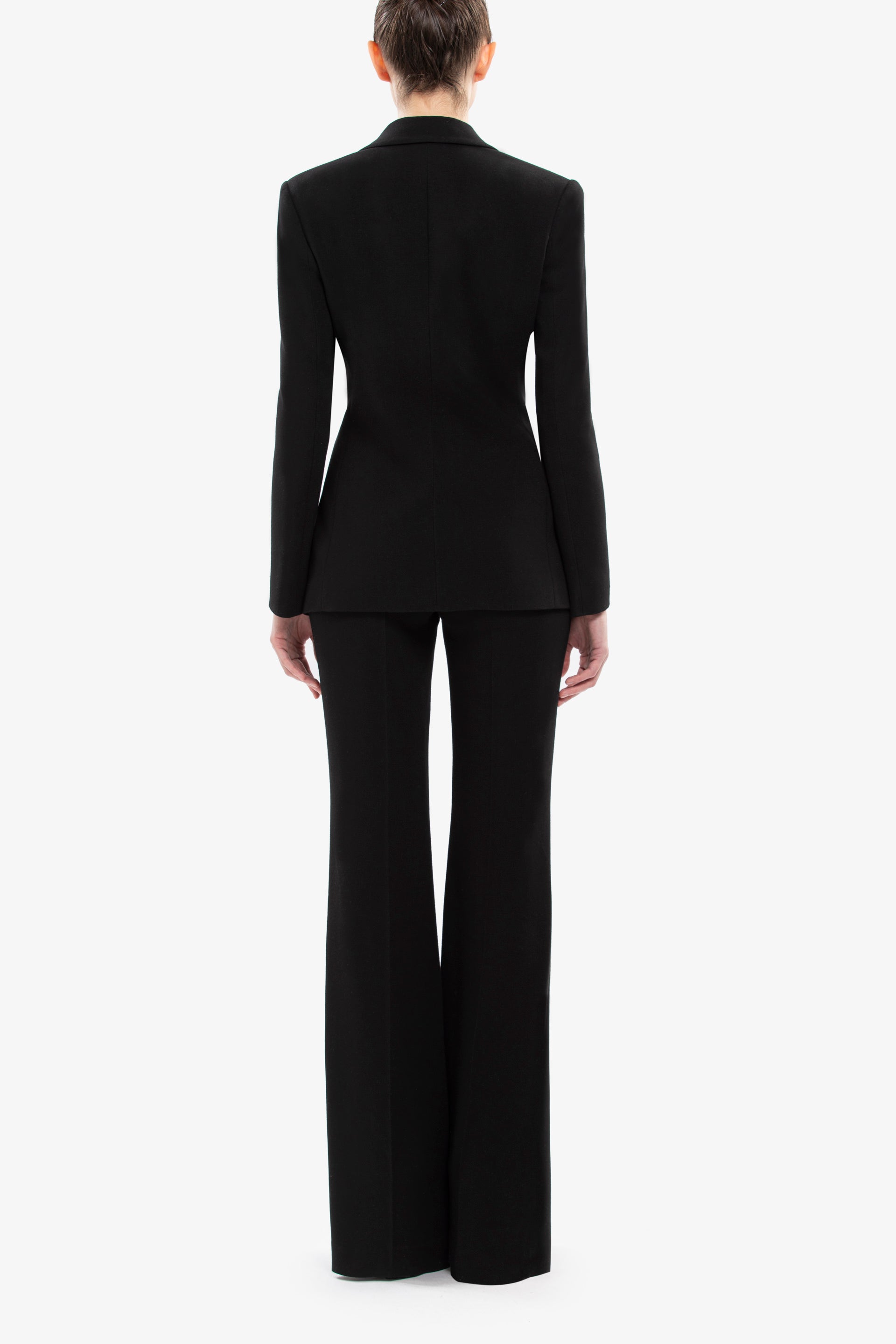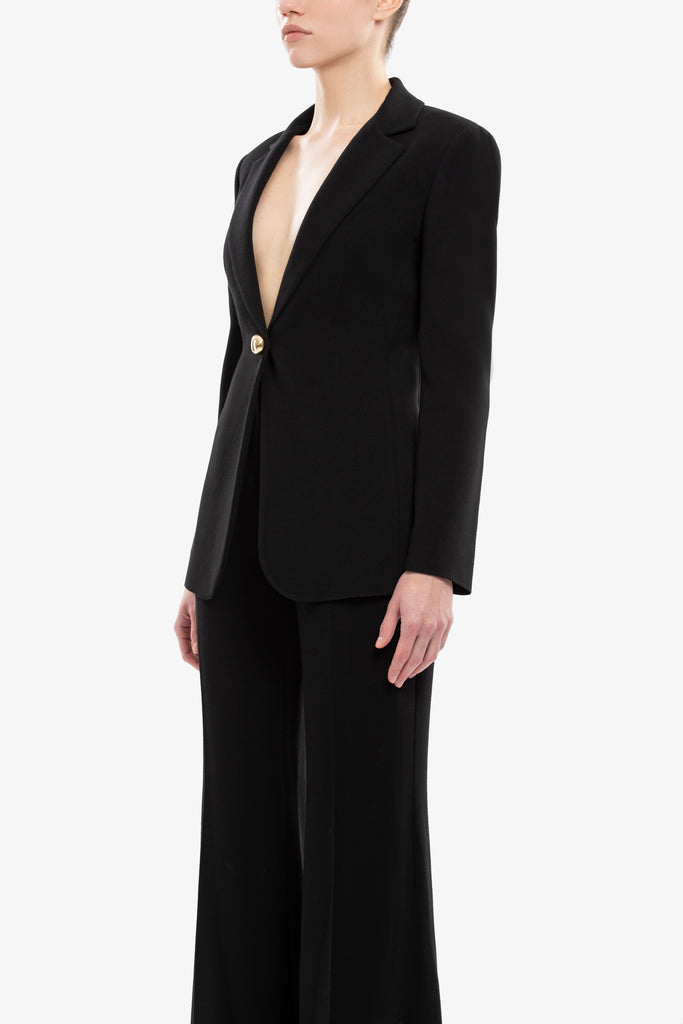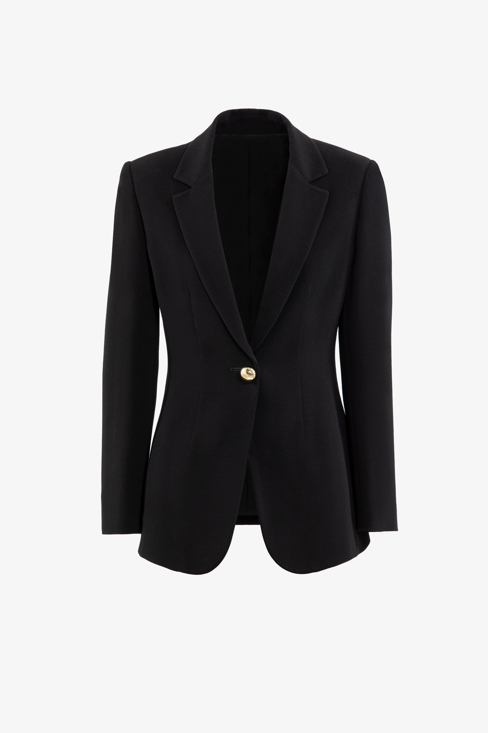 Jet black crepe jacket offers a classic tailored fit, adorned with a gold button.