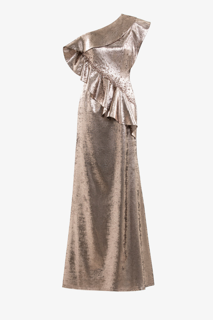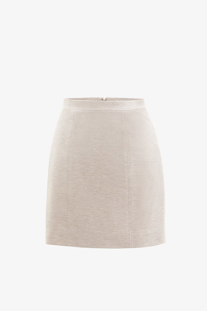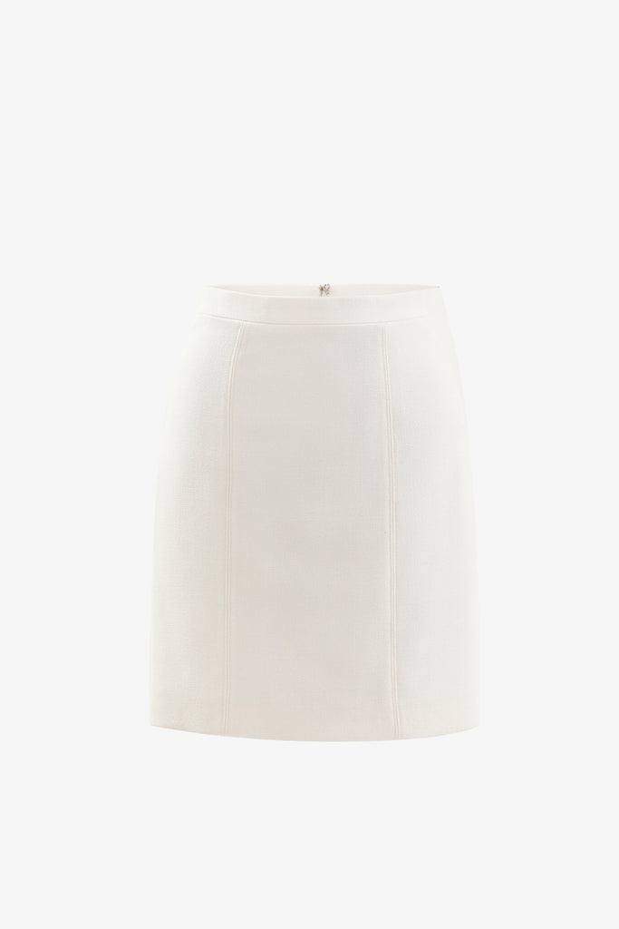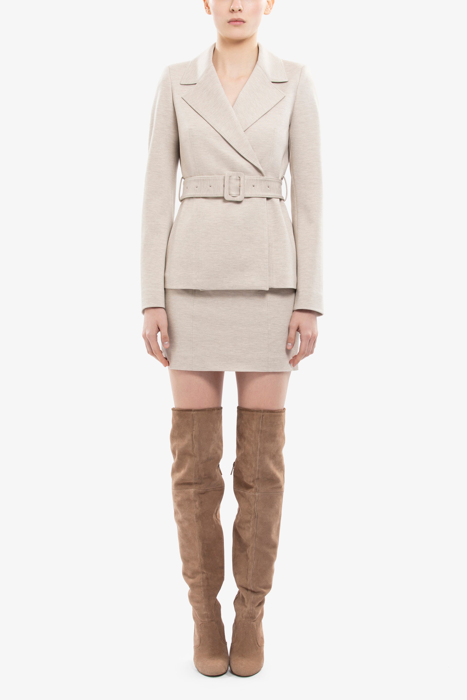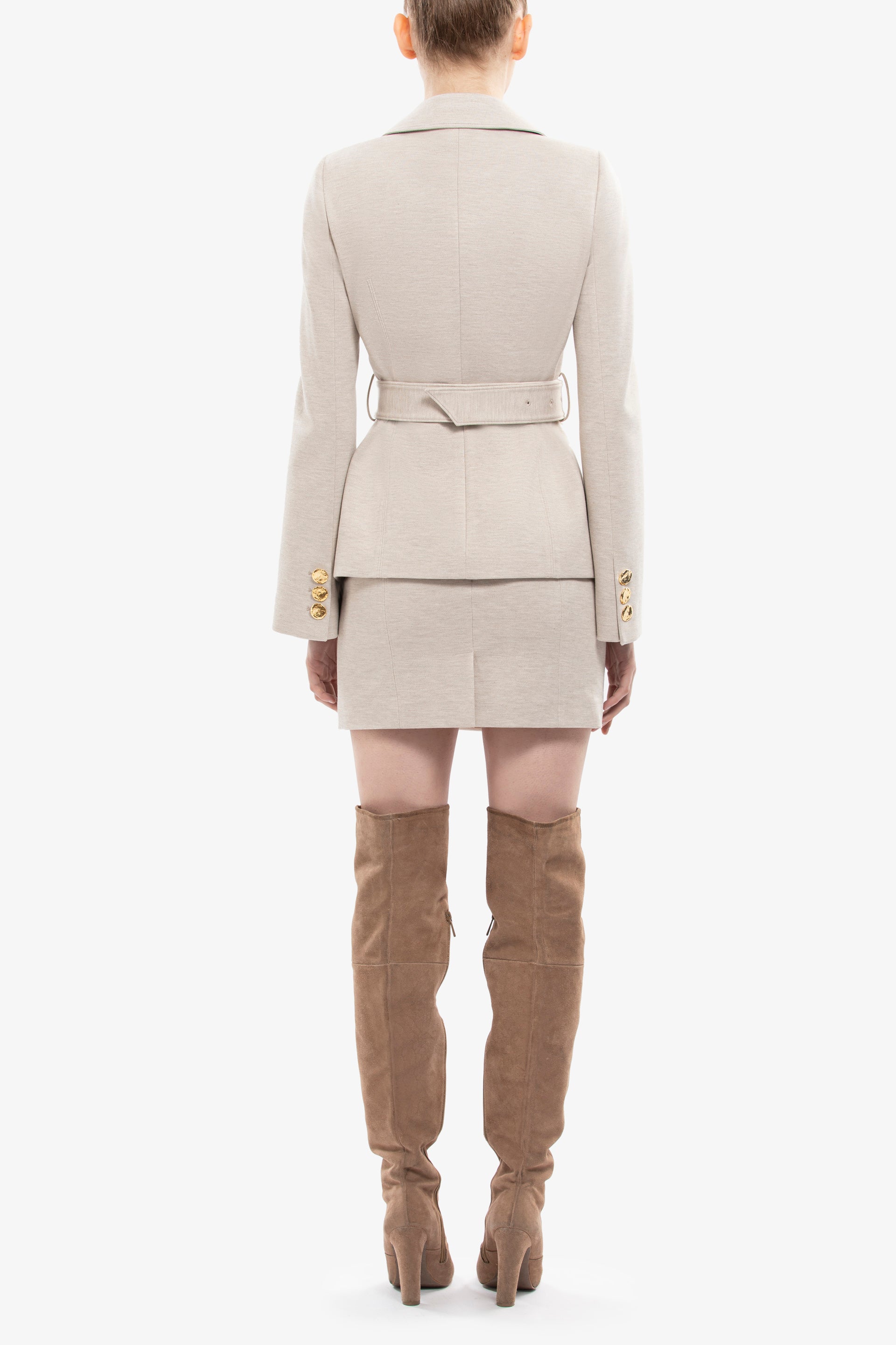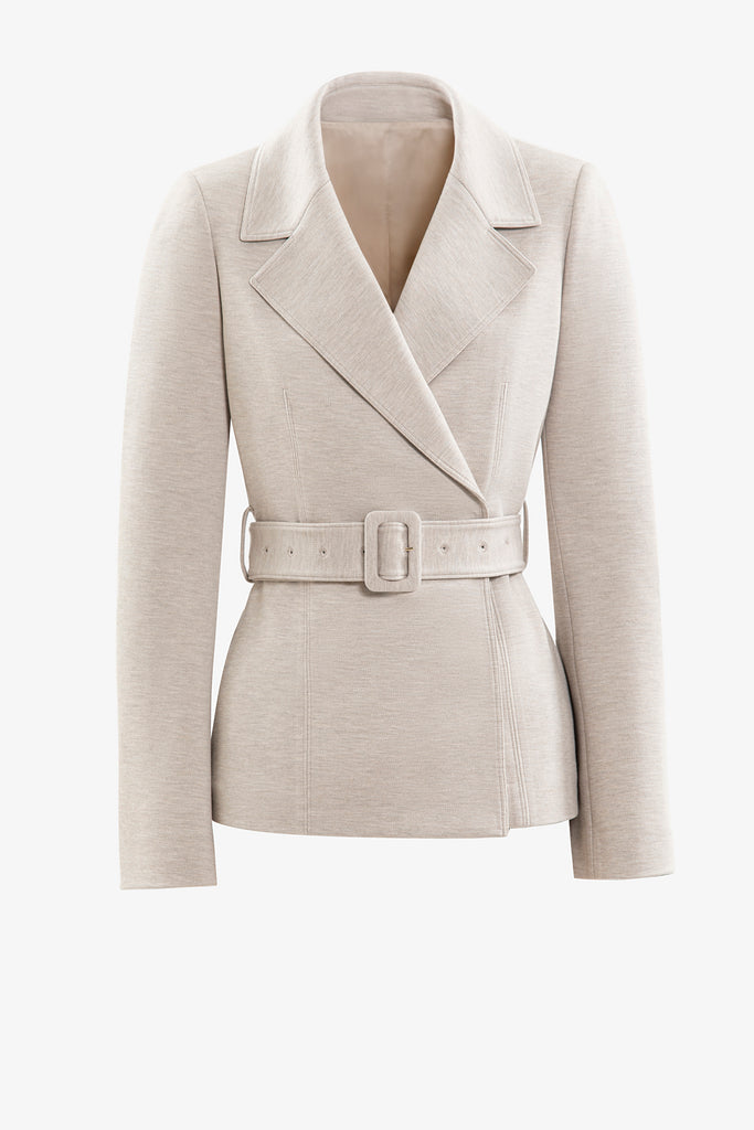 Ivory tailored jacket is elegantly paired with a matching wide belt at the waist, creating a flattering and structured silhouette.