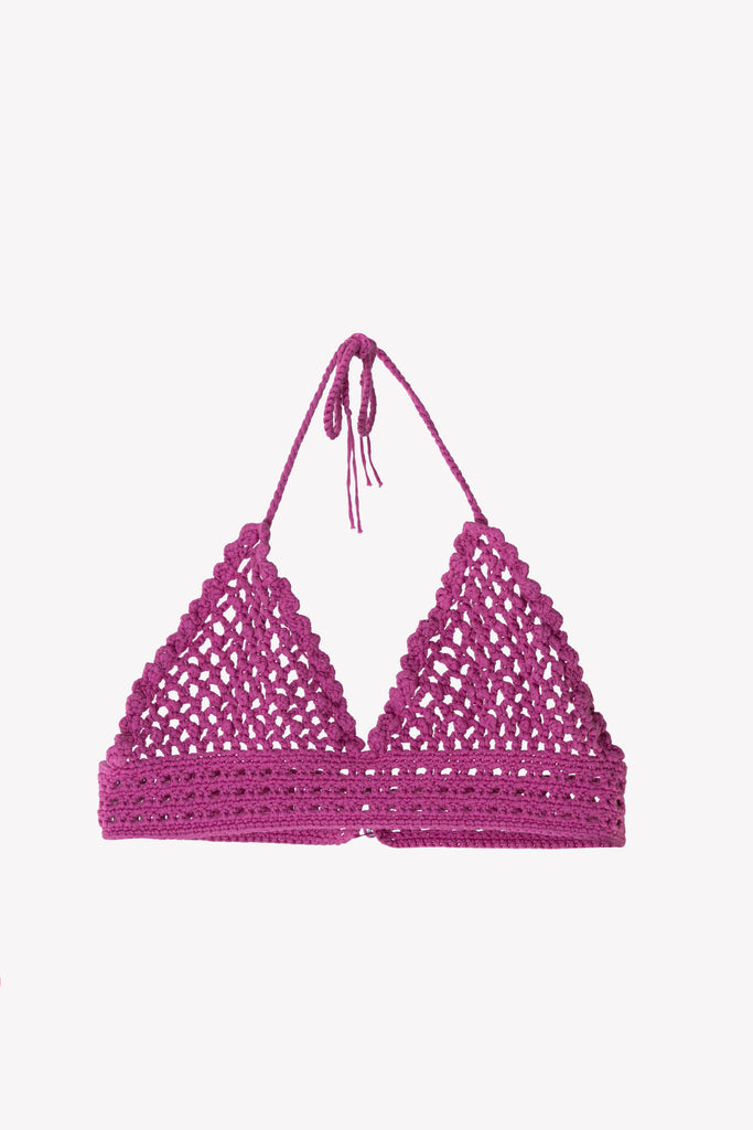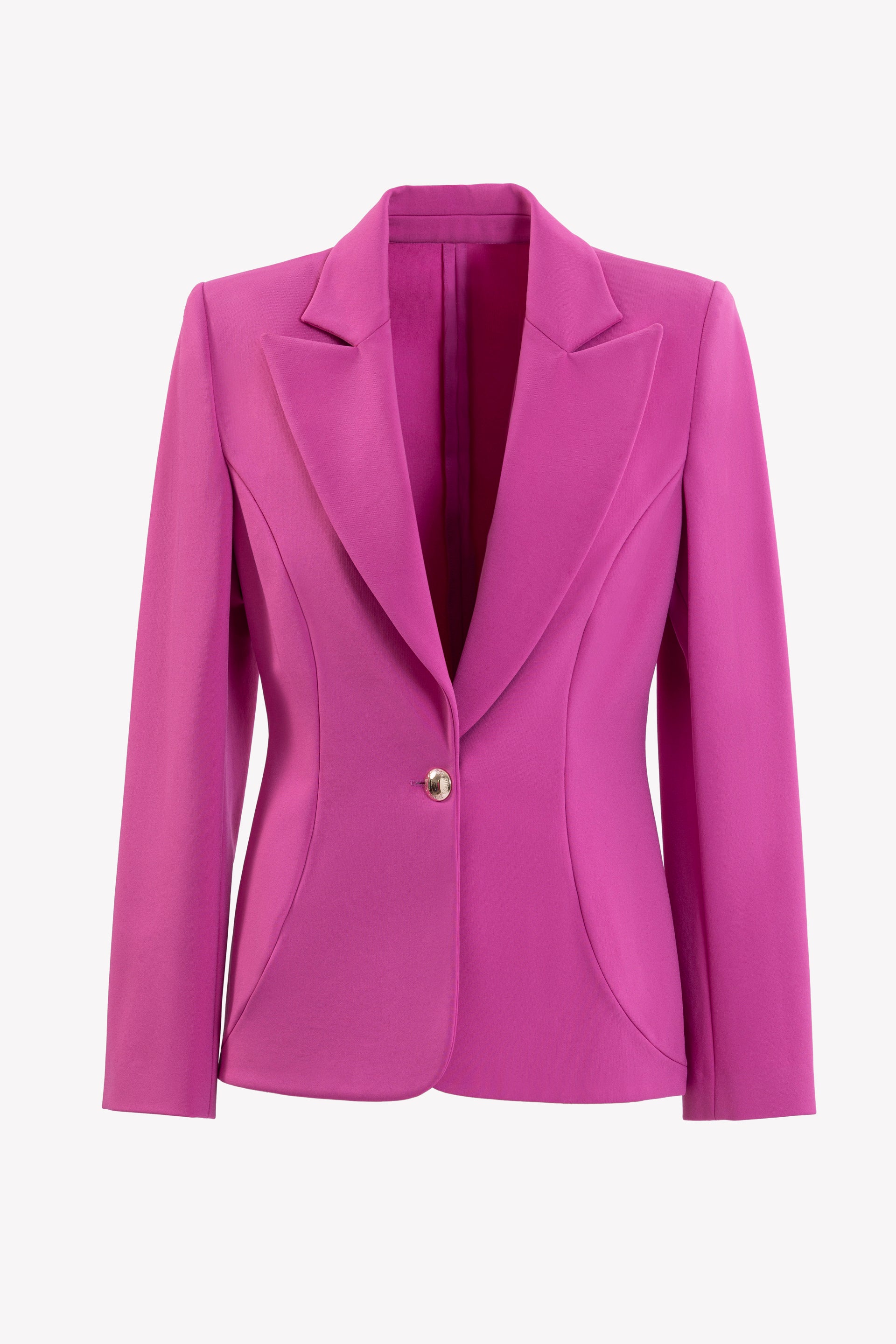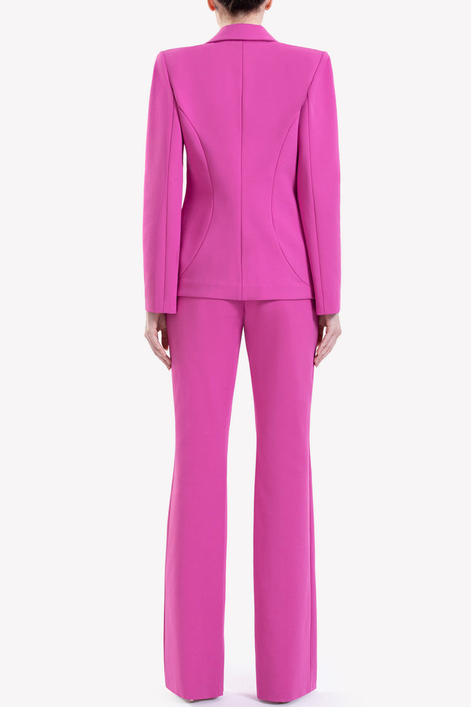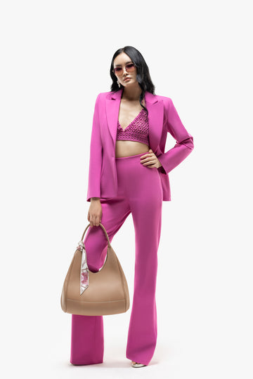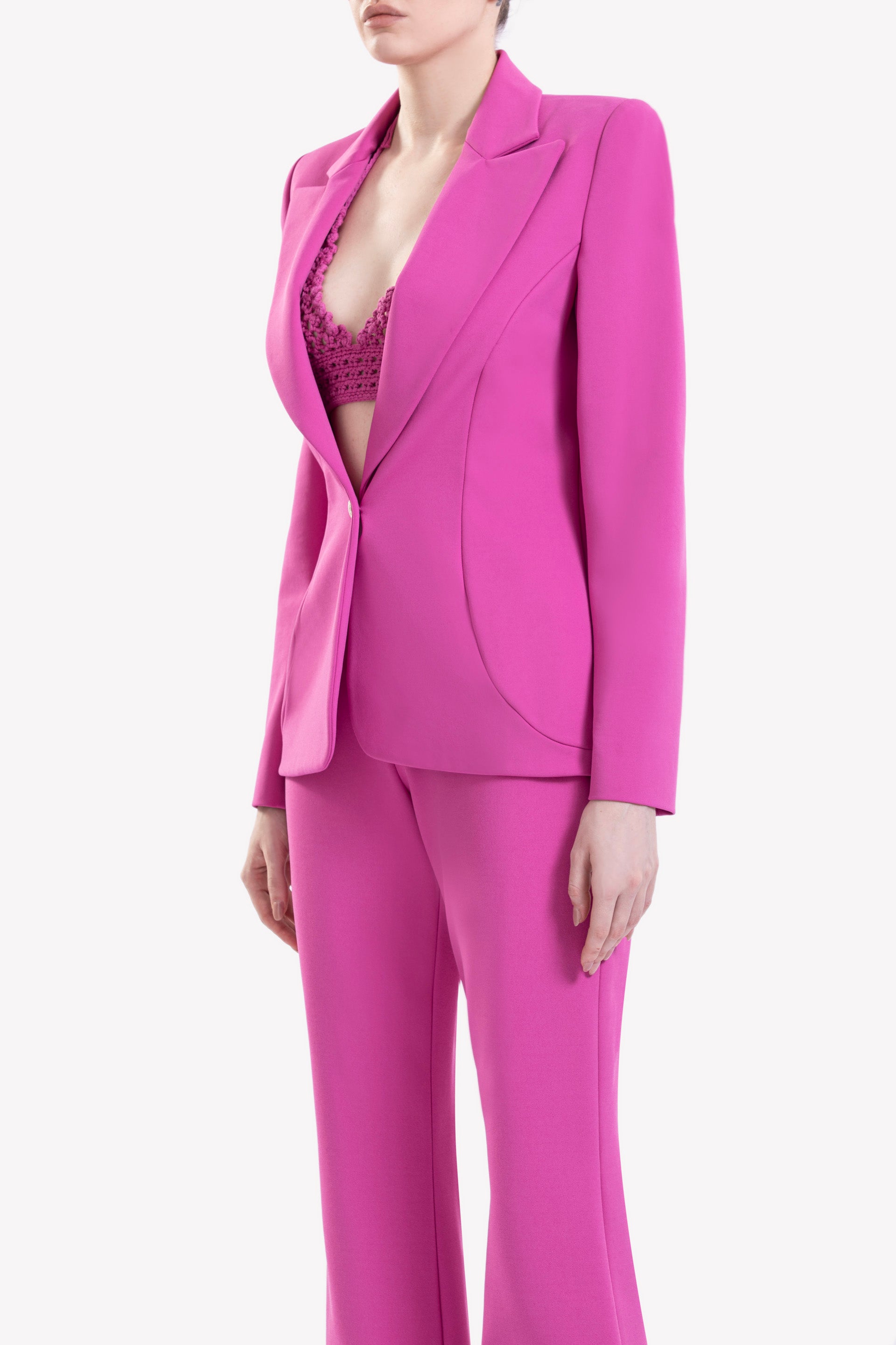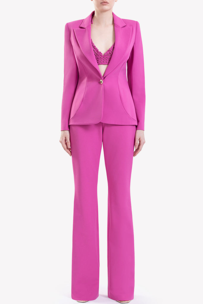 Jersey Cactus Flower fitted tailored jacket below hip length with Jersey Cactus Flower straight-cut pants paired with Crochet Cactus Flower bra.