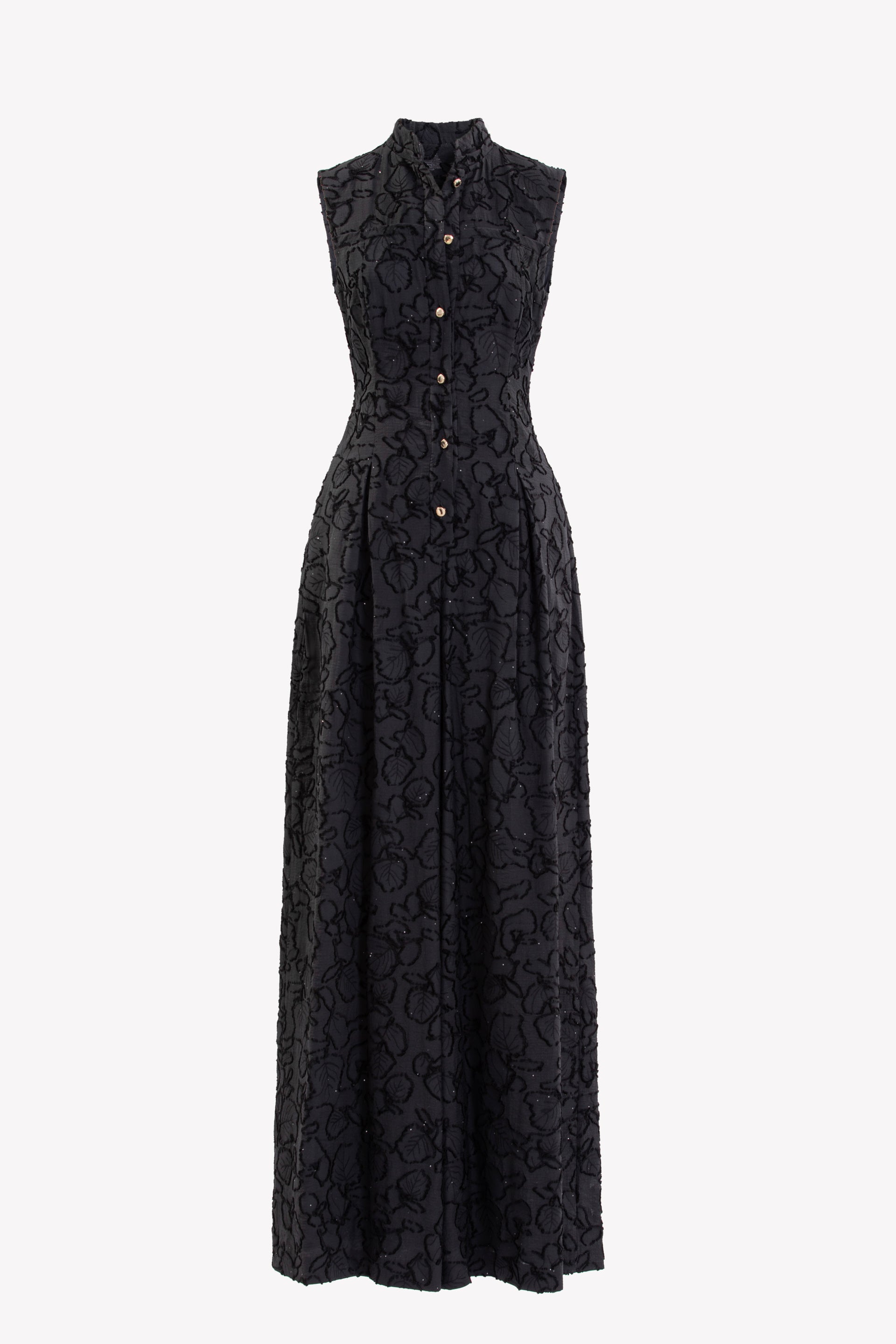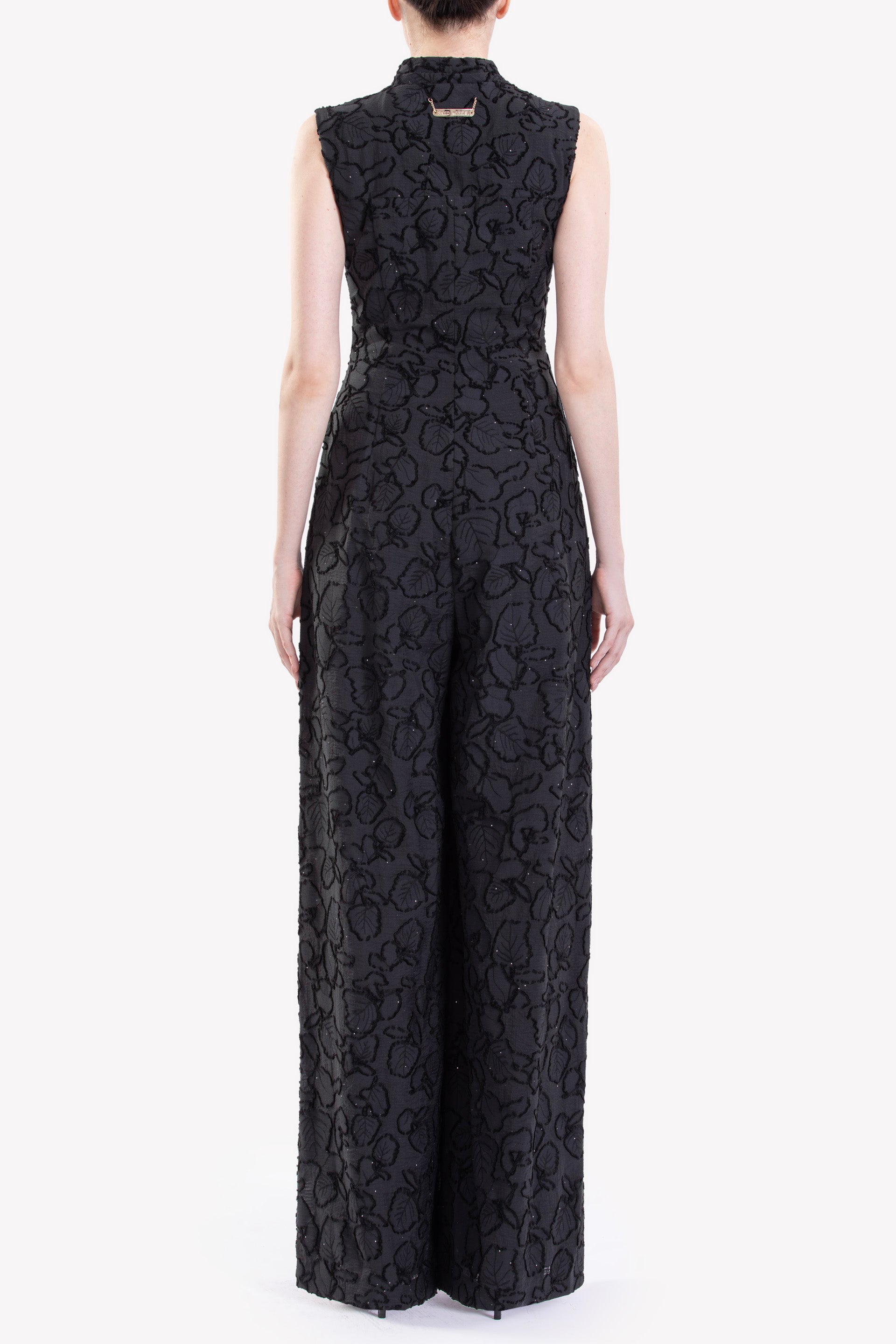Jet-black textured jumpsuit, featuring a buttoning tab with branded SK buttons, sleeveless design, a tailored waist, and pleated wide-leg trousers that extend to the floor.