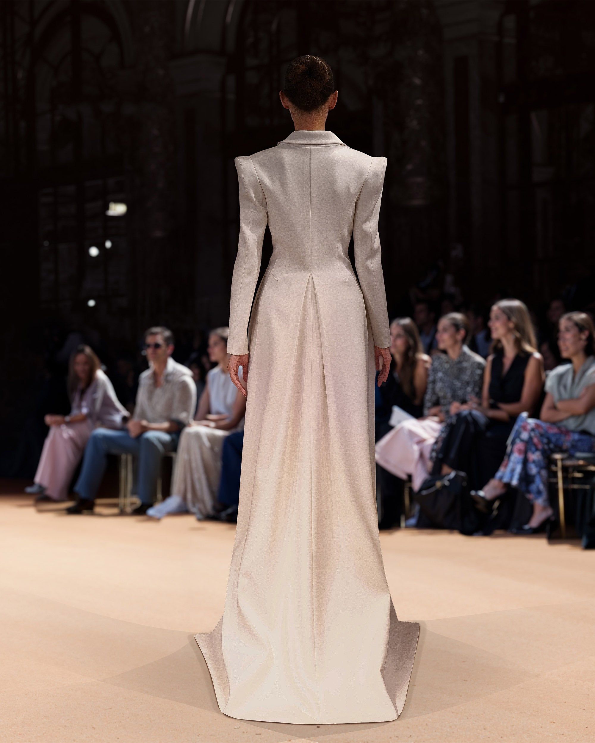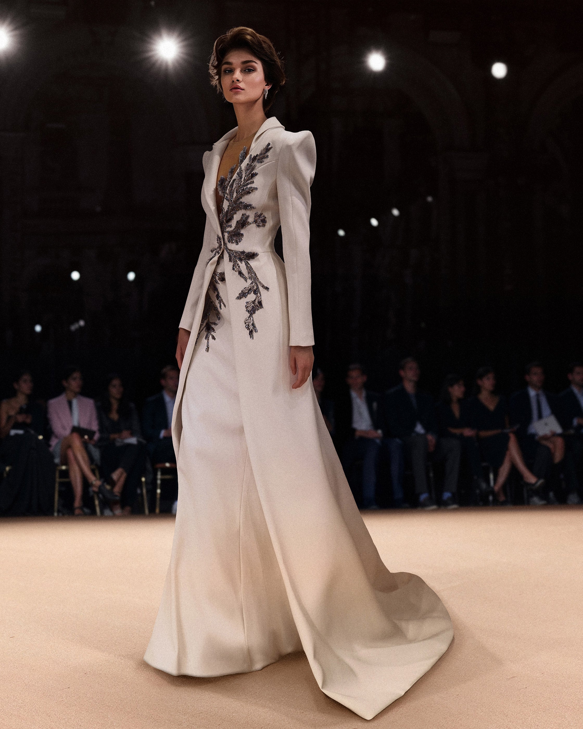 Introducing our exquisite Ivory Triple Crepe Couture Embellished Dress, designed with a tailored silhouette, long sleeves, and a flattering V neckline.