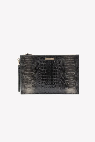 The Tutto Pouch is a sleek jet-black clutch with a bold, textured silhouette that embodies timeless sophistication. Crafted from 100% calfskin leather with a crocodile-embossed finish, it brings a touch of modern edge to classic elegance. Stylish and versatile, it’s perfect for both evening and daywear. With its refined lines and polished details, the Tutto Pouch exudes confidence, making it an essential piece for every occasion