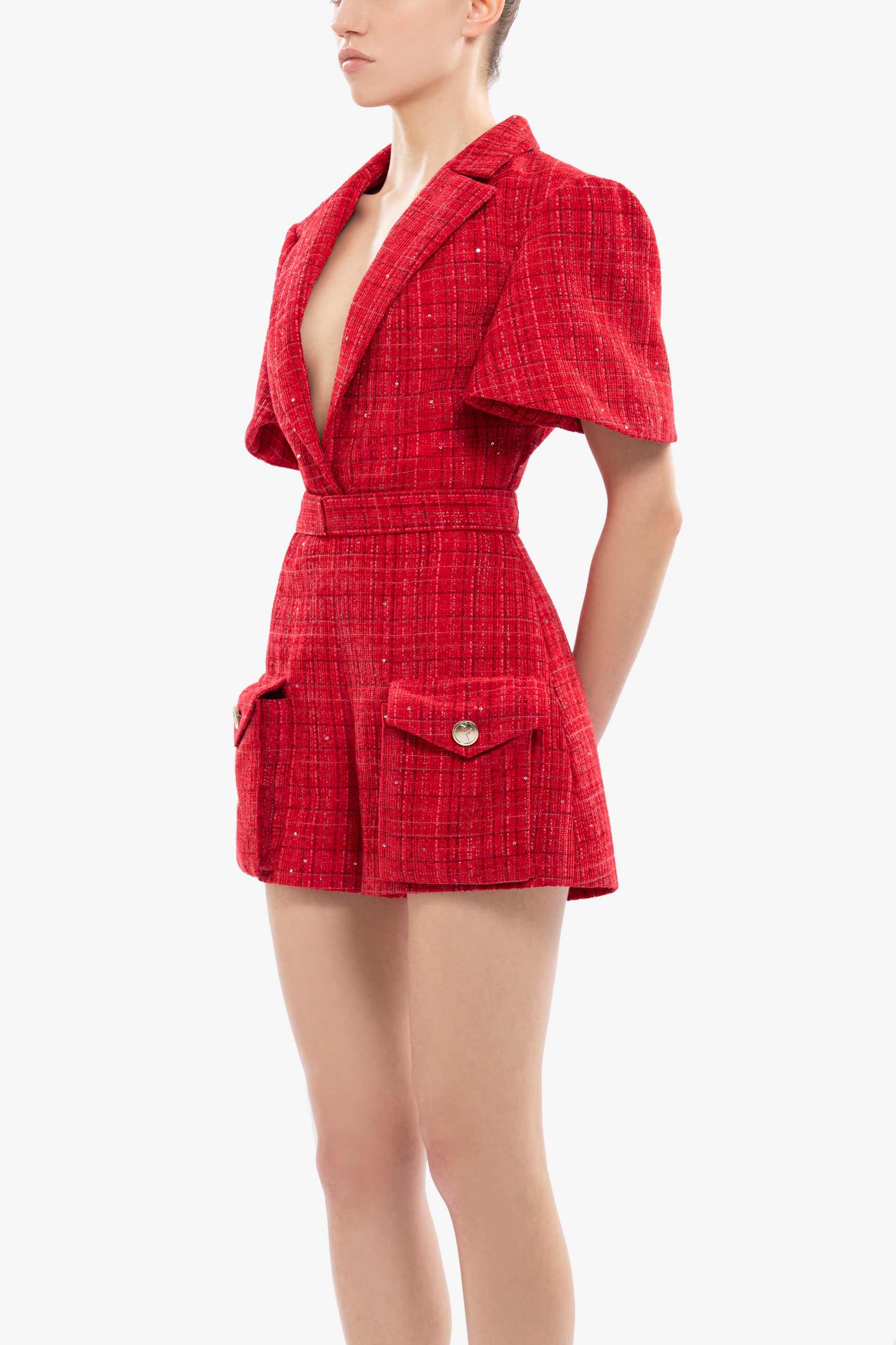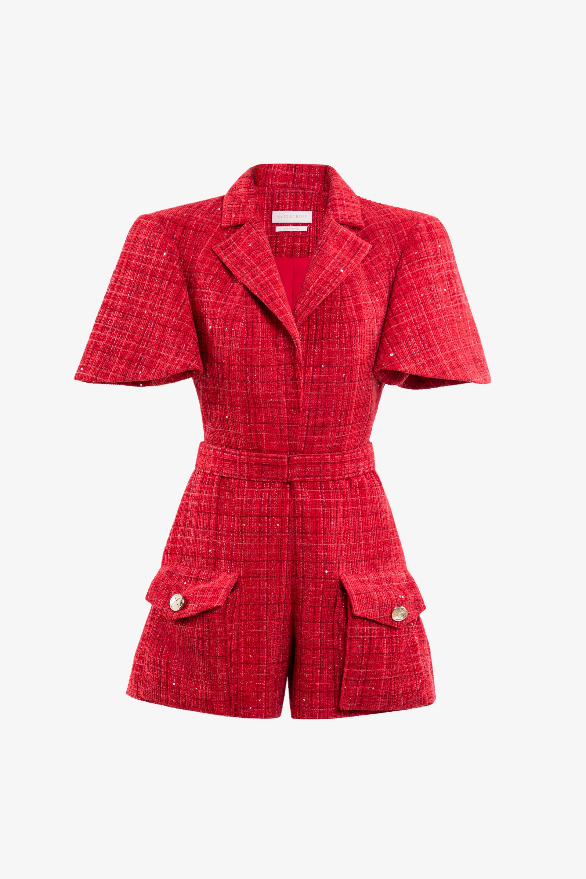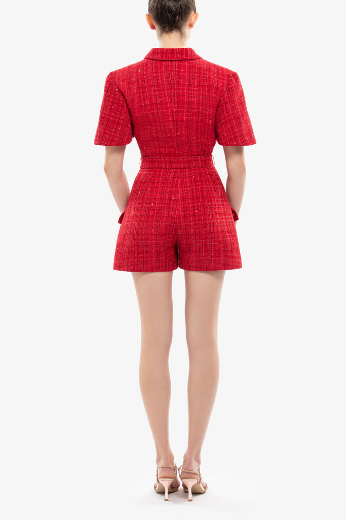 Scooter tweed short jumpsuit featuring short sleeves, two pockets on the shorts, and SK-gold branded buttons.