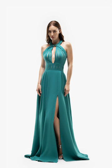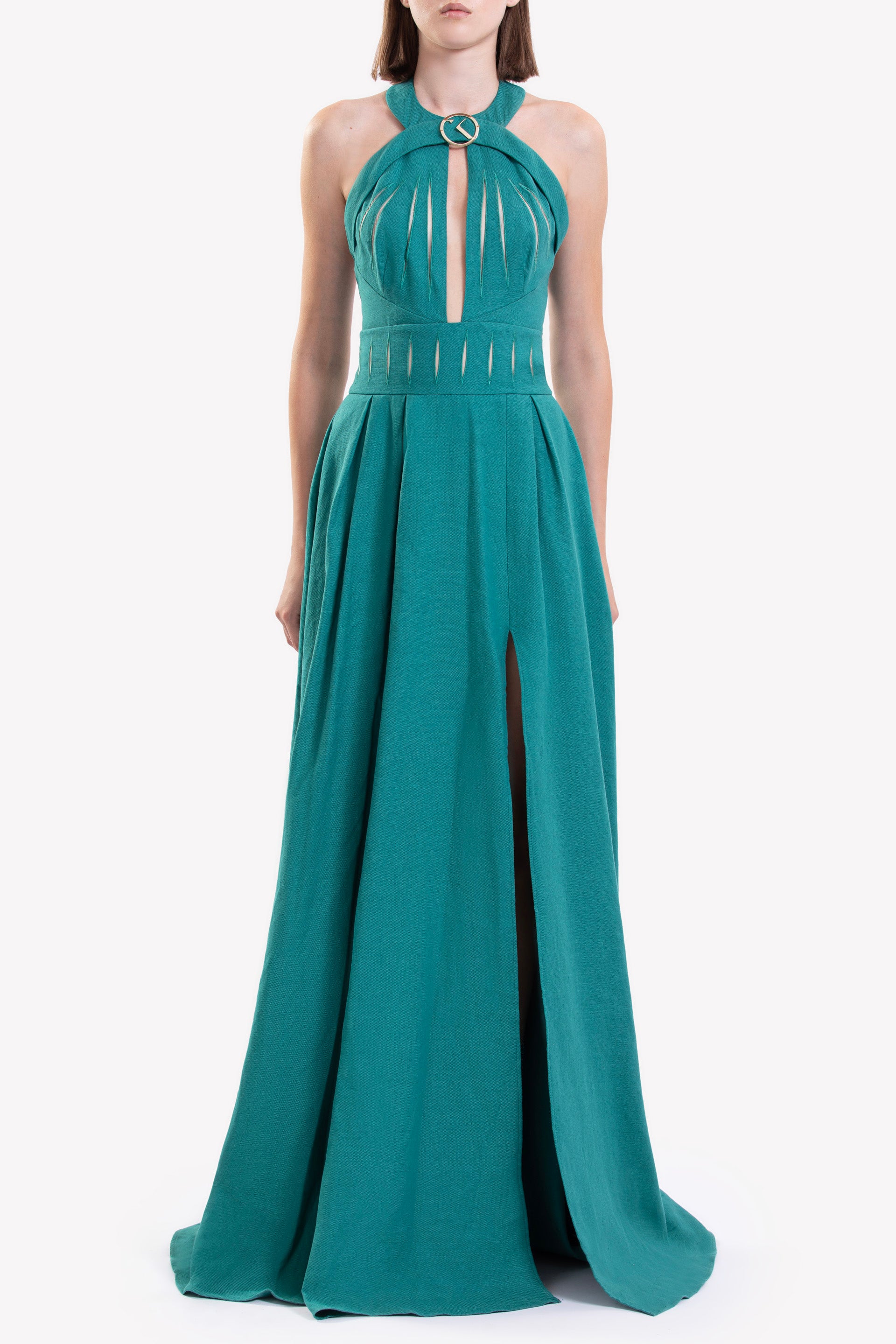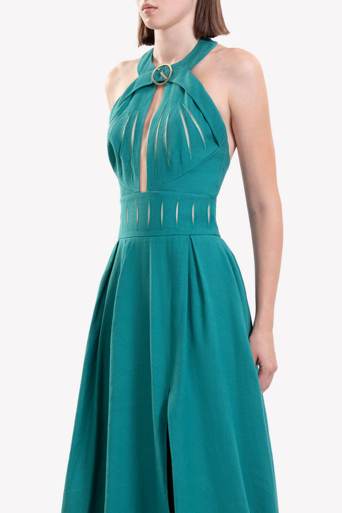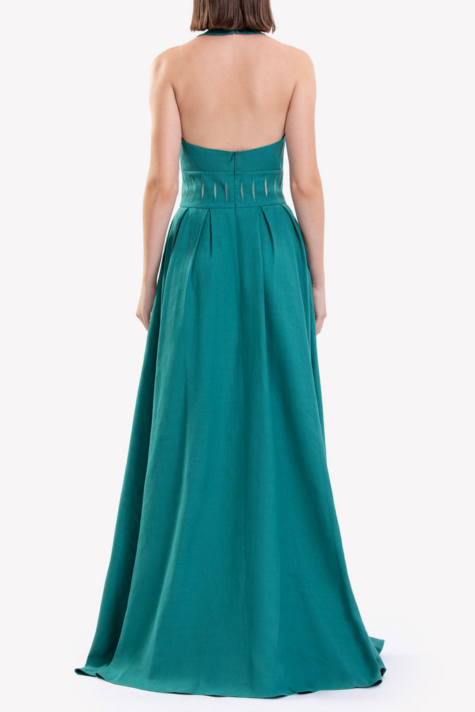 North Sea linen dress with a halter neckline featuring SK logo detail at the collar. Vertical cutouts accent the bodice, and the dress flows into a floor- length A-line skirt with soft pleats.