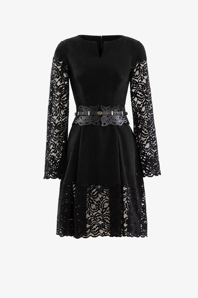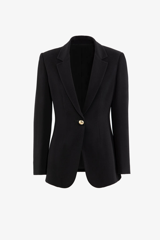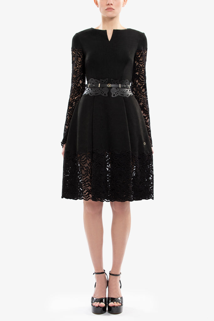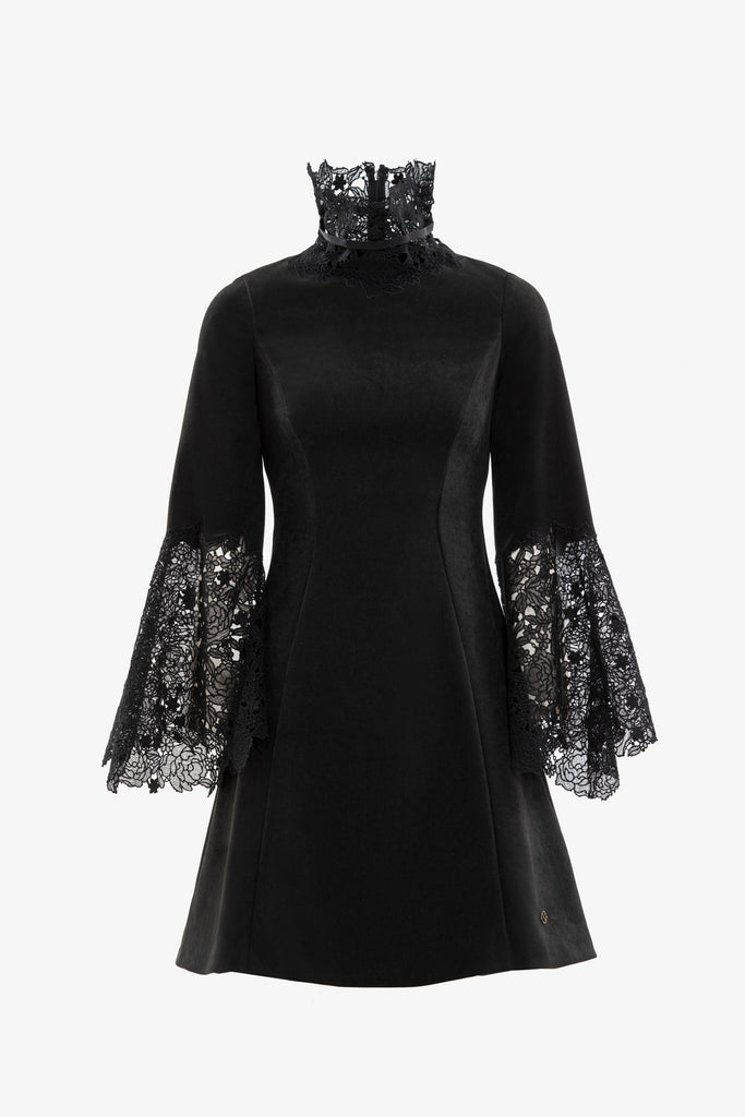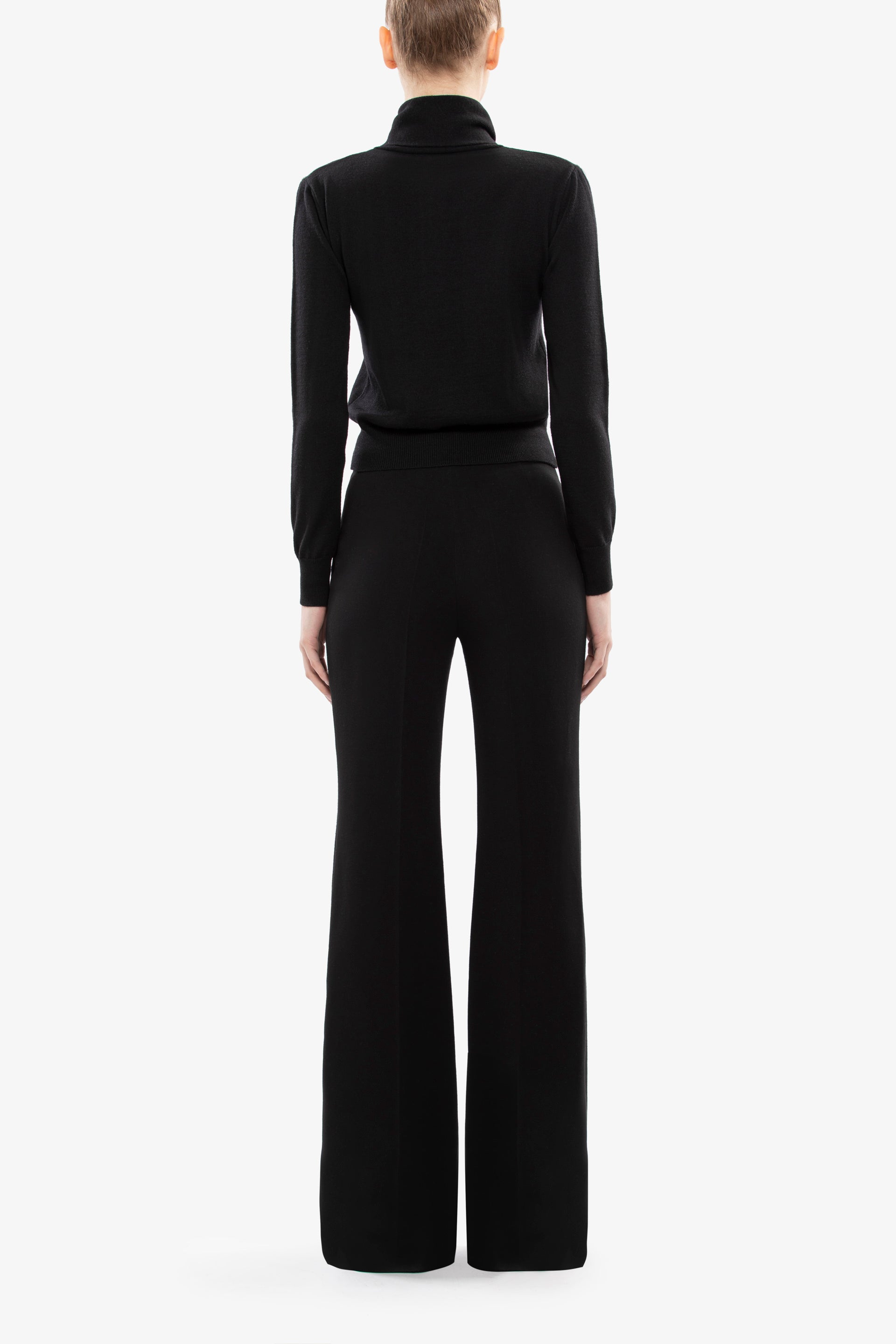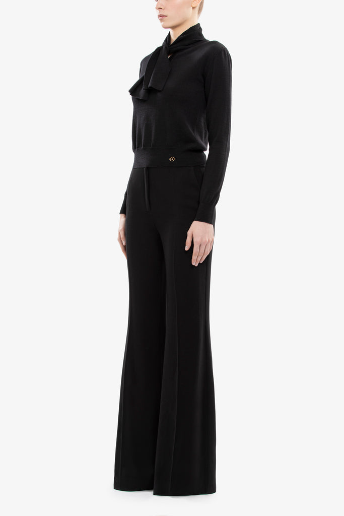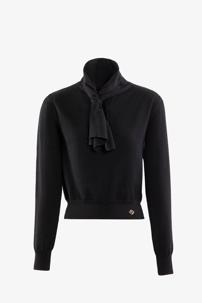 A jet-black top made from 100% wool, featuring a charming bow at the neckline, long sleeves with elasticated hems, and an elastic waistband for a snug fit. The design is elegantly finished with an SK logo accent.
